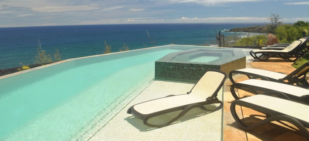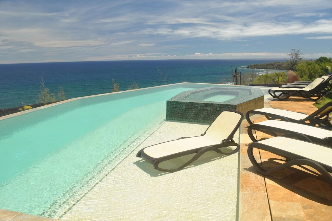 Amenities of this Kilauea Hawaii vacation rental include satellite cable, DVD collection, Apple computer, high-speed internet, fax office space, and a great room surround system. Special features of the home include an interior Koi pond, two living rooms, one with Chicory Baby Grand Piano, a lovely oceanfront dining room for 8, a separate breakfast room for 4, outdoor dining and magnificent executive chef kitchen with bar area, butler’s pantry and every kitchen amenity necessary. Just in front of the property on the ocean side, is a separate spa building. Here guests enjoy the exercise room and massage room. All specialty services like a massage or manicure can be arranged to take place here–the perfect oceanfront pampering locale! LICENSE#: TVNC#4201