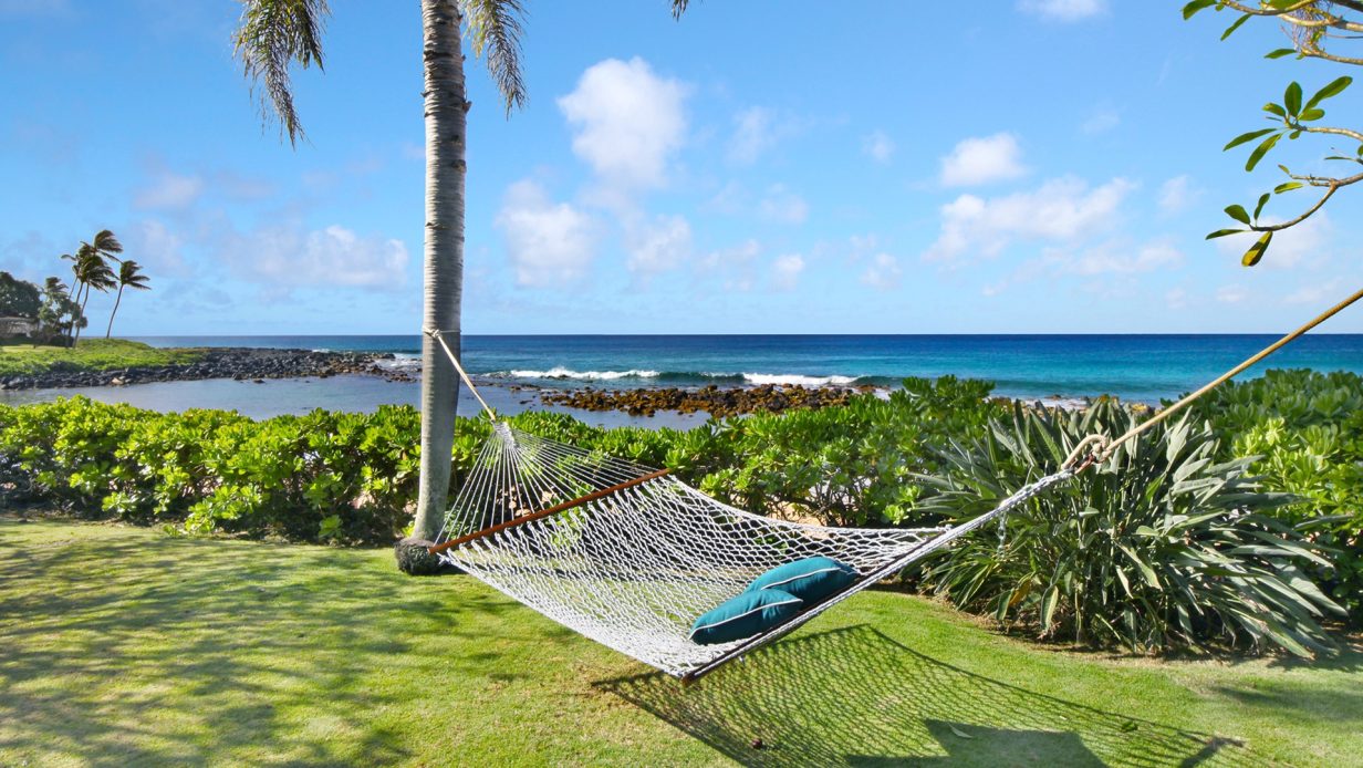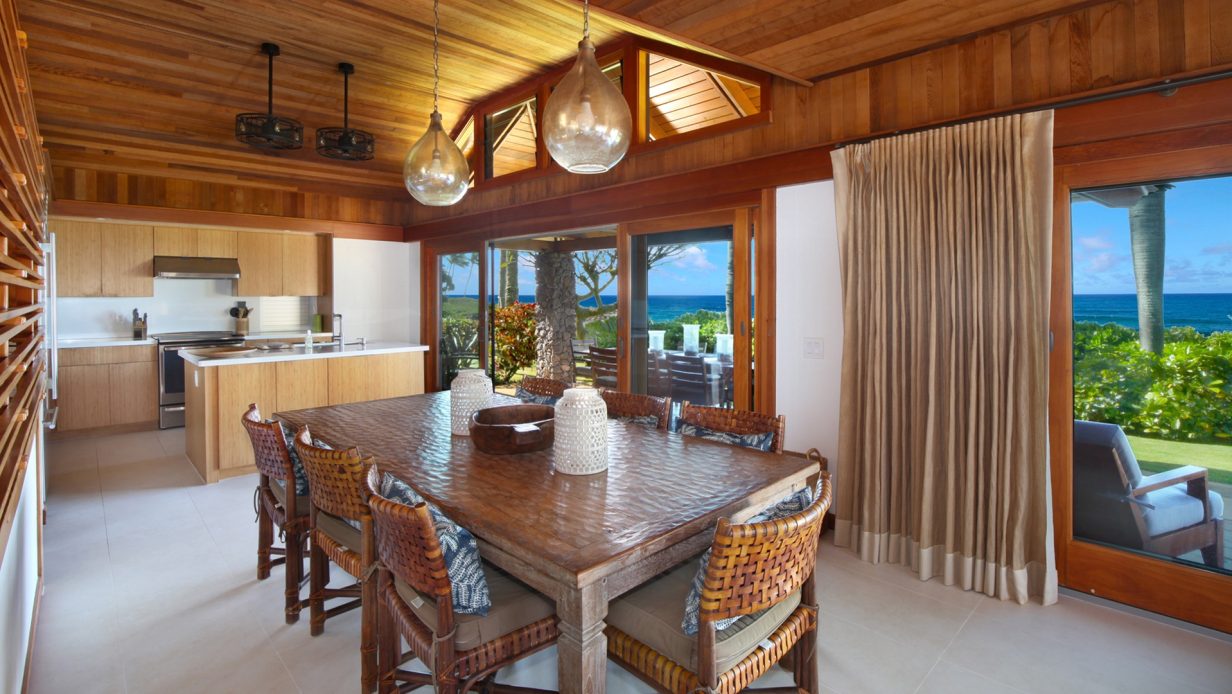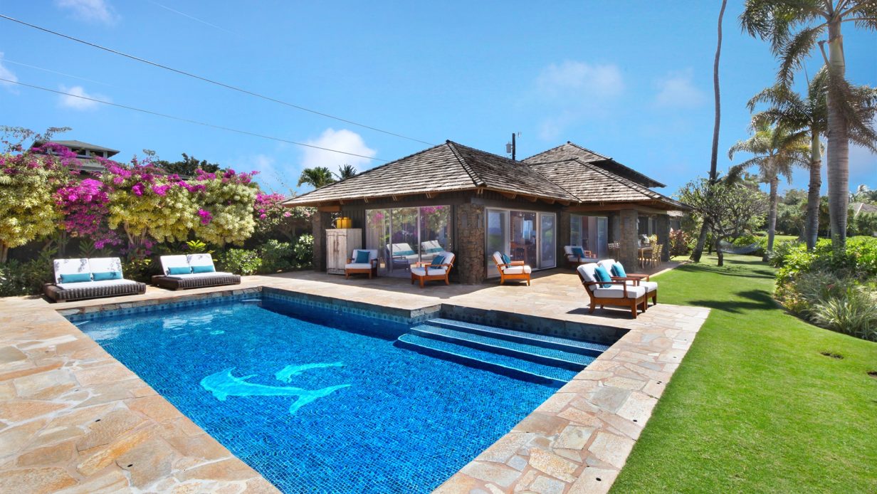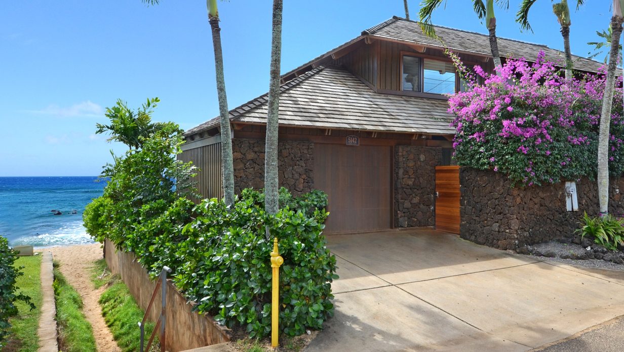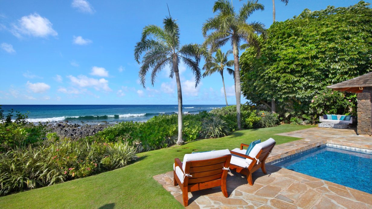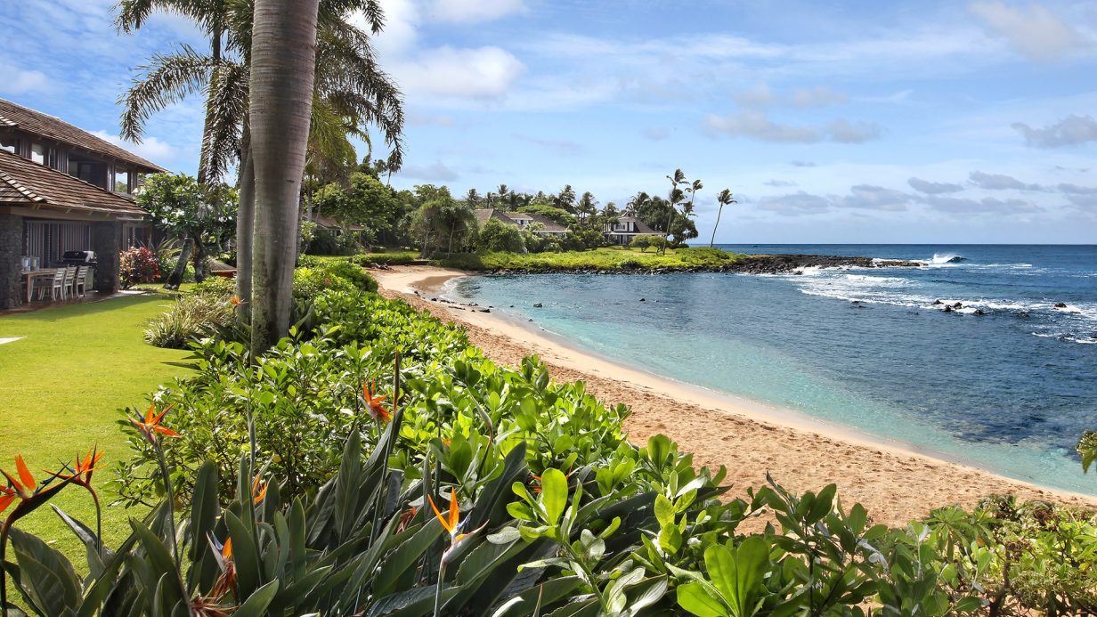 Fronting the white sands of Poipu’s Baby Beach, this magnificent beachfront estate is one of the very few Kauai oceanfront rentals located directly on a beach and close to Poipu shopping and dining. Set above a shallow reef protected cove, the two-story main residence and detached single-story guest house are separated by a spectacular oceanfront swimming pool. Open and airy, yet very private, this beach home is the perfect place to unwind in paradise while enjoying the comfort and ease of the Polynesian-style architecture set in a tropical landscape.