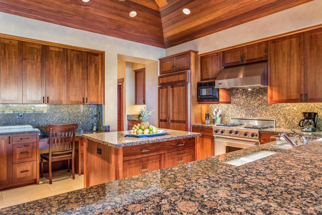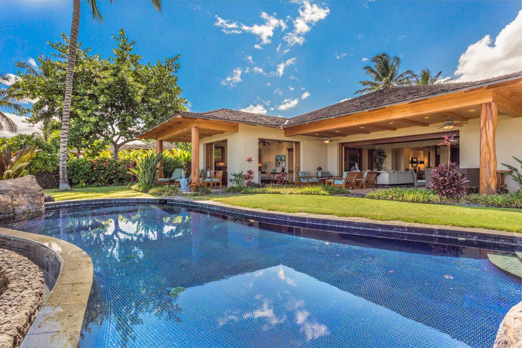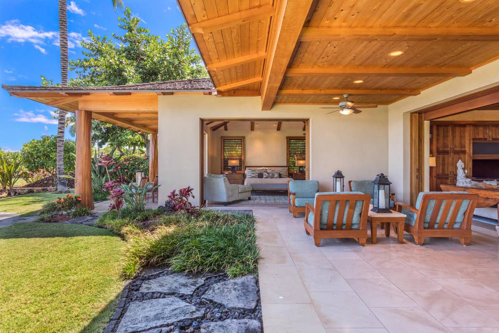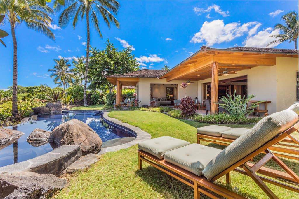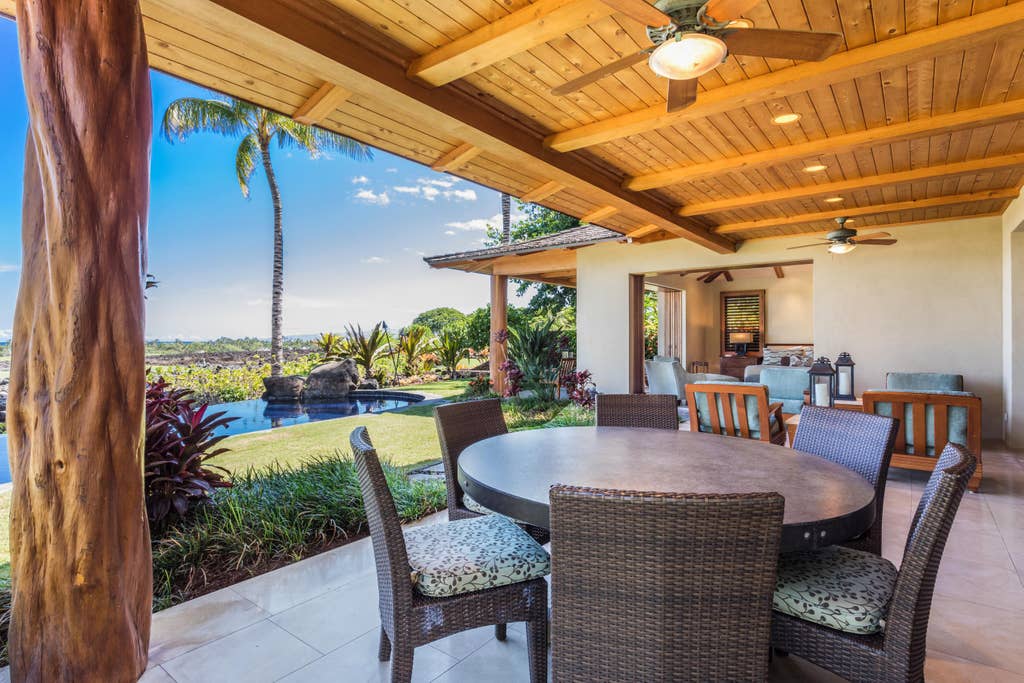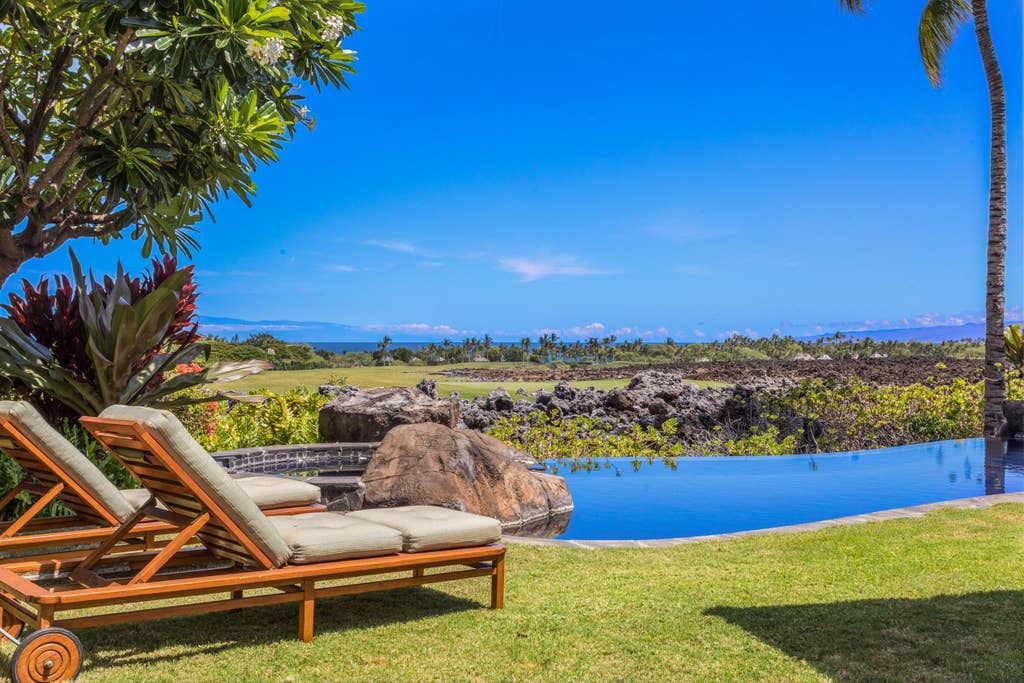 Located at the entrance to Pakui Street – a popular area for exclusive vacation rentals, this 3 bedroom, 3.5 bath home is part of the world-renown Hualalai Resort that features the Four Seasons Hotel, Sports Club & Spa, championship golf, tennis and a wide range of ocean sports activities. Guests of this Hualalai vacation rental have the option to purchase passes for daily use of the Resort amenities, located within walking distance. Open-air in design and comfortably decorated, this Hawaii luxury home has been recently updated and includes king-king-2 queen bedding configuration – ideal for up to 6 guests. A private swimming pool and spa sits just off the spacious lanai and is complete with golf and ocean views yet, private – with jet-black lava and luscious green vegetation providing ample separation with the golf course.