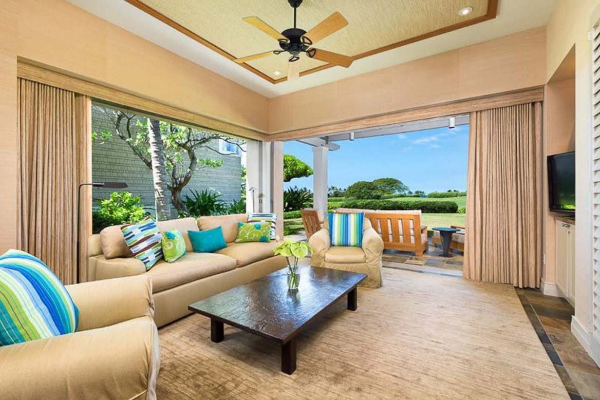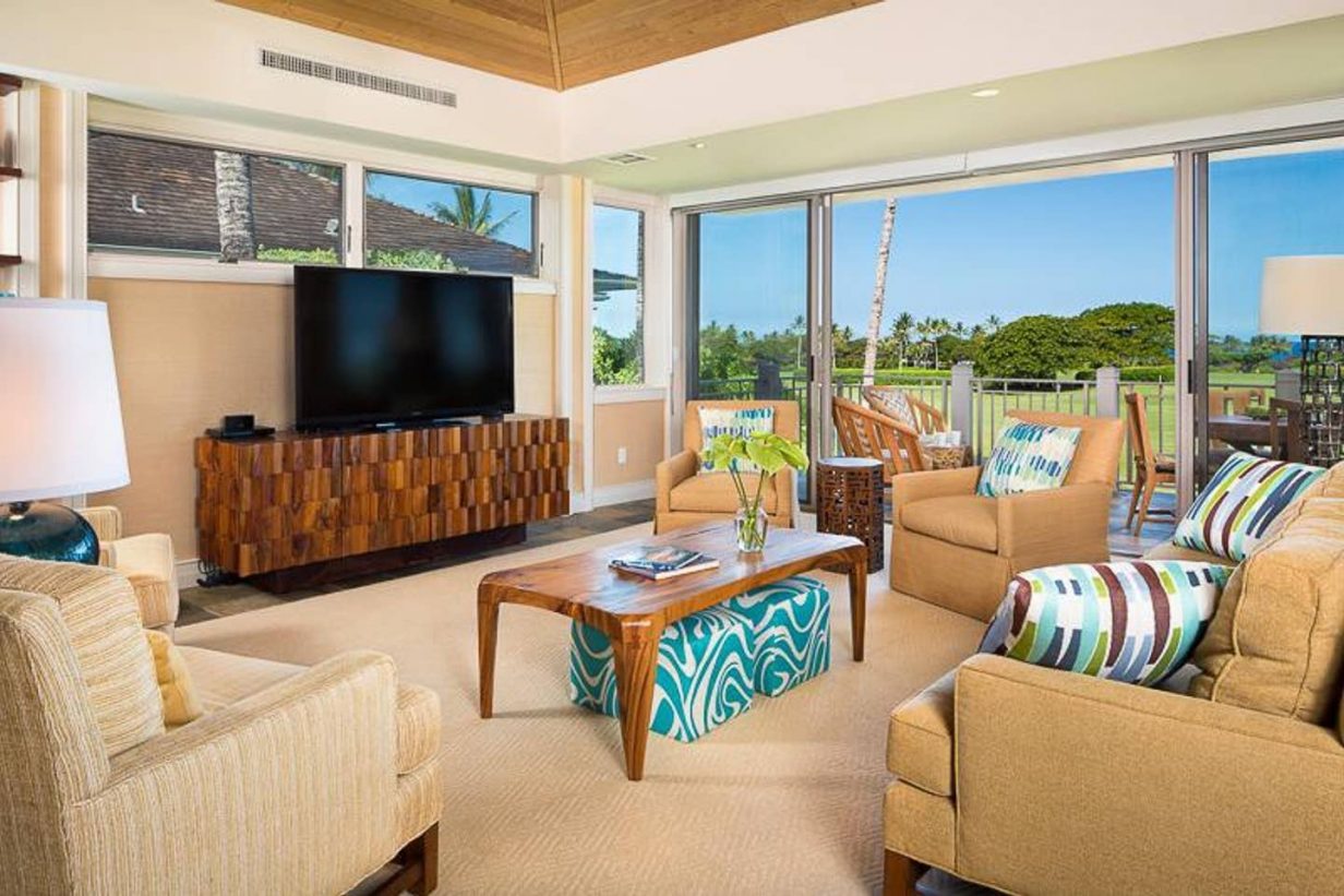 One of the largest floor plans of any villa at Hualalai, this spacious and centrally located 3 bedroom, 3 bath villa is ideal for your Hawaii getaway. Extra bedding is available with a “bonus” living room on the first level. The downstairs suite opens to a large lanai and beautiful grass lawn to give this property the feeling of a private home.