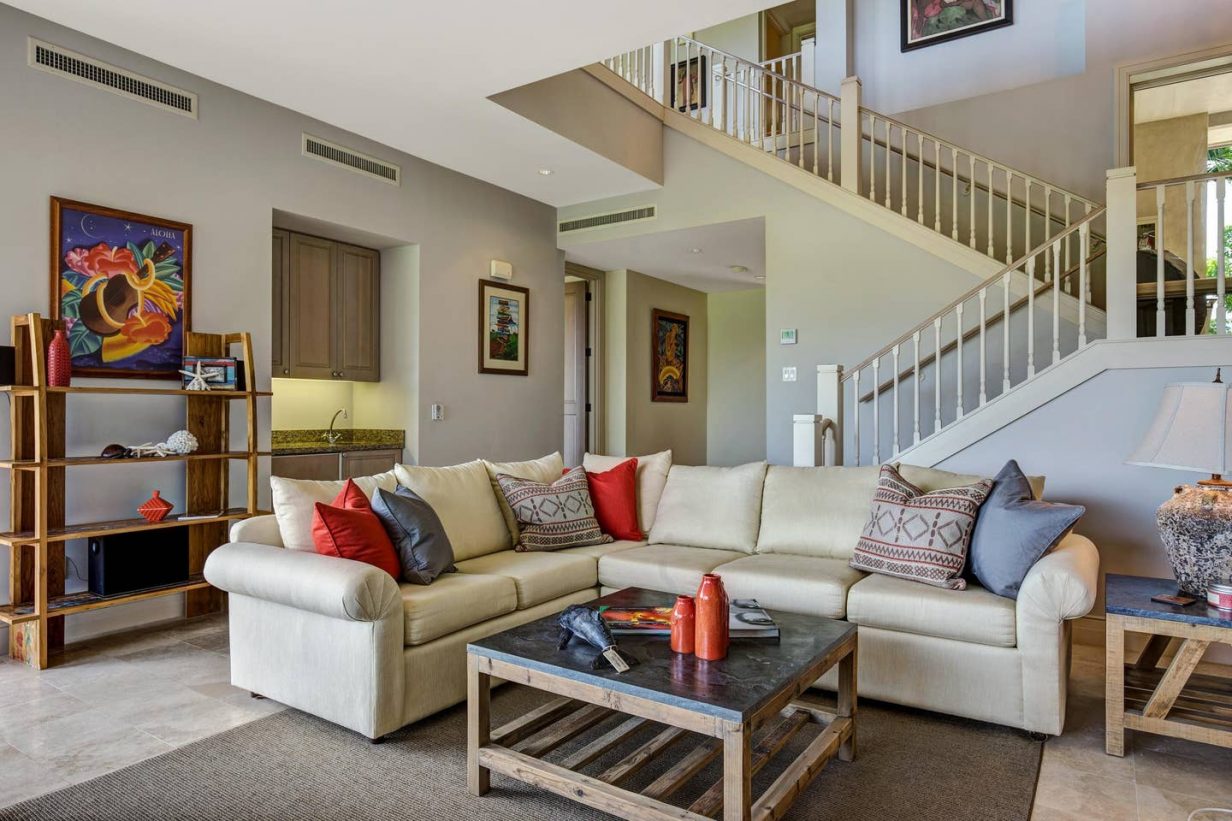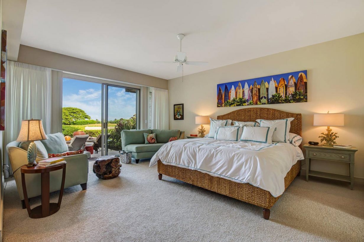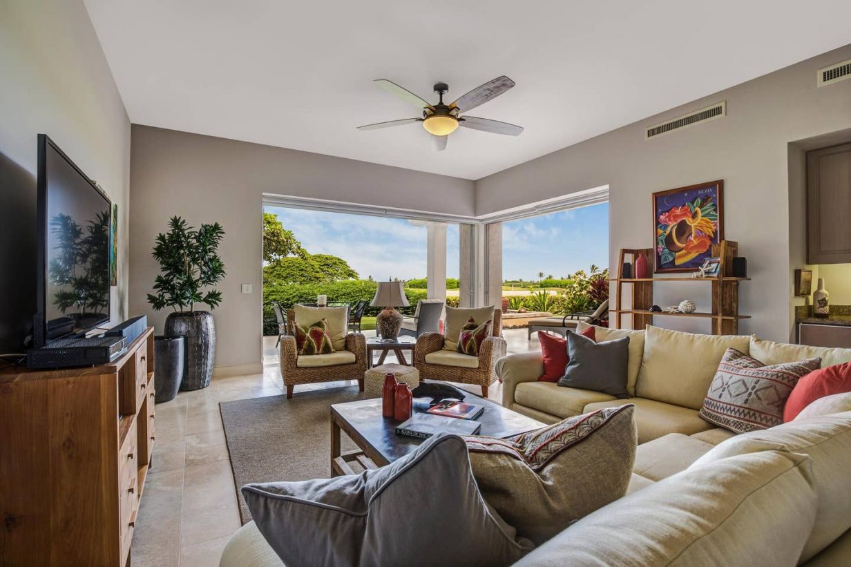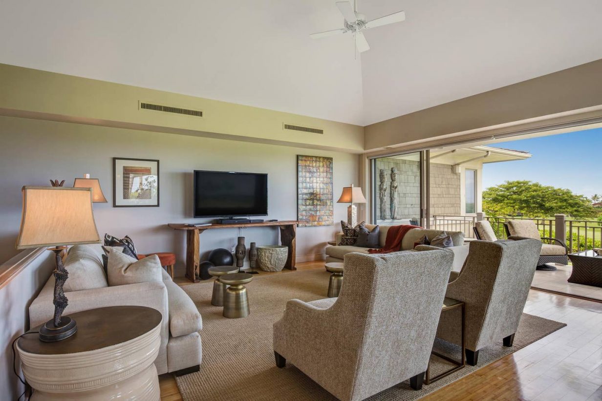 The spacious floor plan includes a downstairs master bedroom suite with king bed and luxury spa-like bath. Just off the master is a large living room with queen sized sofa pull out that opens to the downstairs lanai, leading to the lawn and golf course. Guests enjoy the extra space offered by the downstairs retreat. There is also a downstairs twin-bedded guest room (may convert to King upon request) and laundry area. Upstairs leads to the open “Great Room” with soaring high ceilings, commanding views of the golf course and ocean beyond. The additional upstairs guest room also consists of a King-bed configuration and there is a full bath just off the hallway to the bedroom. A second lanai off the living area brings the outdoor in, allowing for open-air, tropical living conditions.