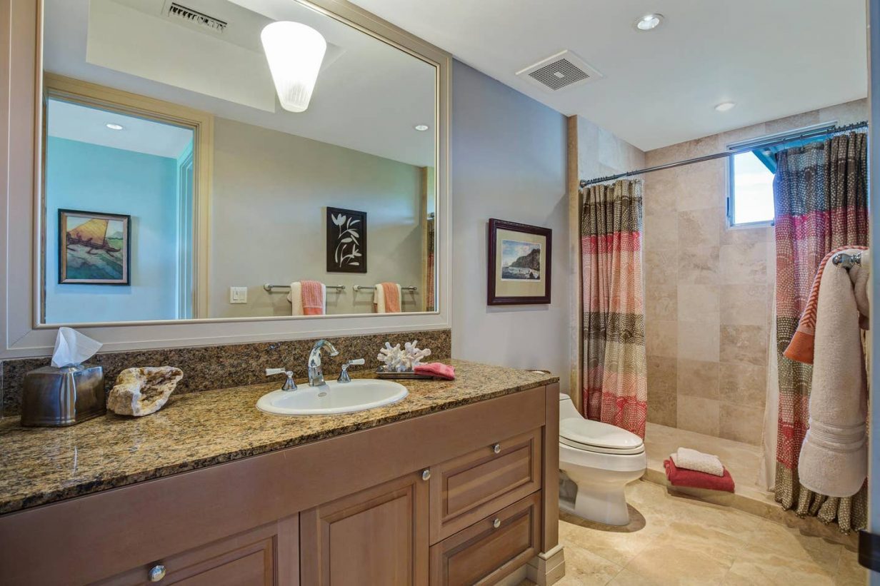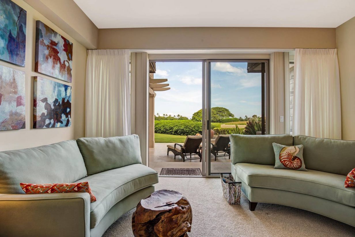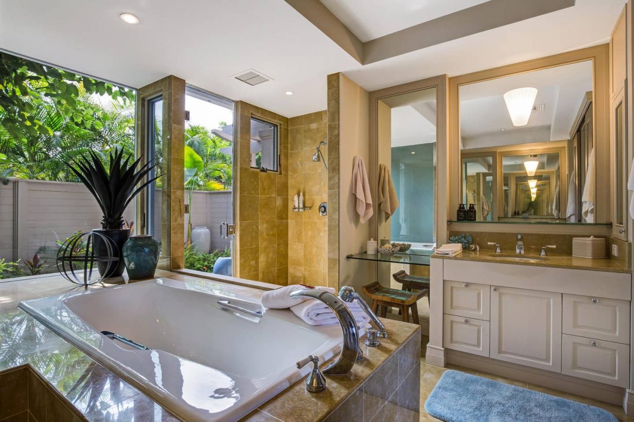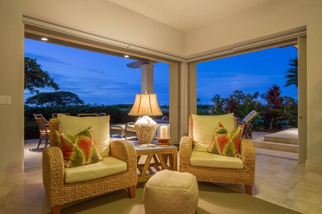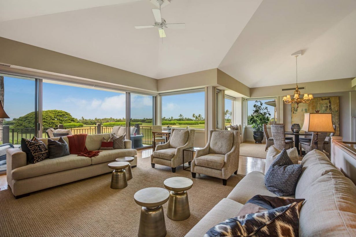 The spacious floor plan includes a downstairs master bedroom suite with king bed and luxury spa-like bath. Just off the master is a large living room with queen sized sofa pull out that opens to the downstairs lanai, leading to the lawn and golf course. Guests enjoy the extra space offered by the downstairs retreat. There is also a downstairs twin-bedded guest room (may convert to King upon request) and laundry area. Upstairs leads to the open “Great Room” with soaring high ceilings, commanding views of the golf course and ocean beyond. The additional upstairs guest room also consists of a King-bed configuration and there is a full bath just off the hallway to the bedroom. A second lanai off the living area brings the outdoor in, allowing for open-air, tropical living conditions.