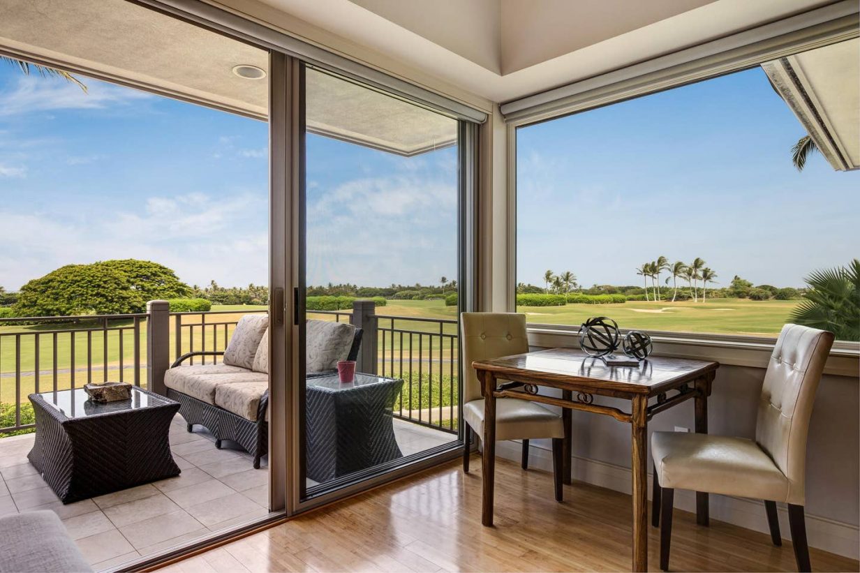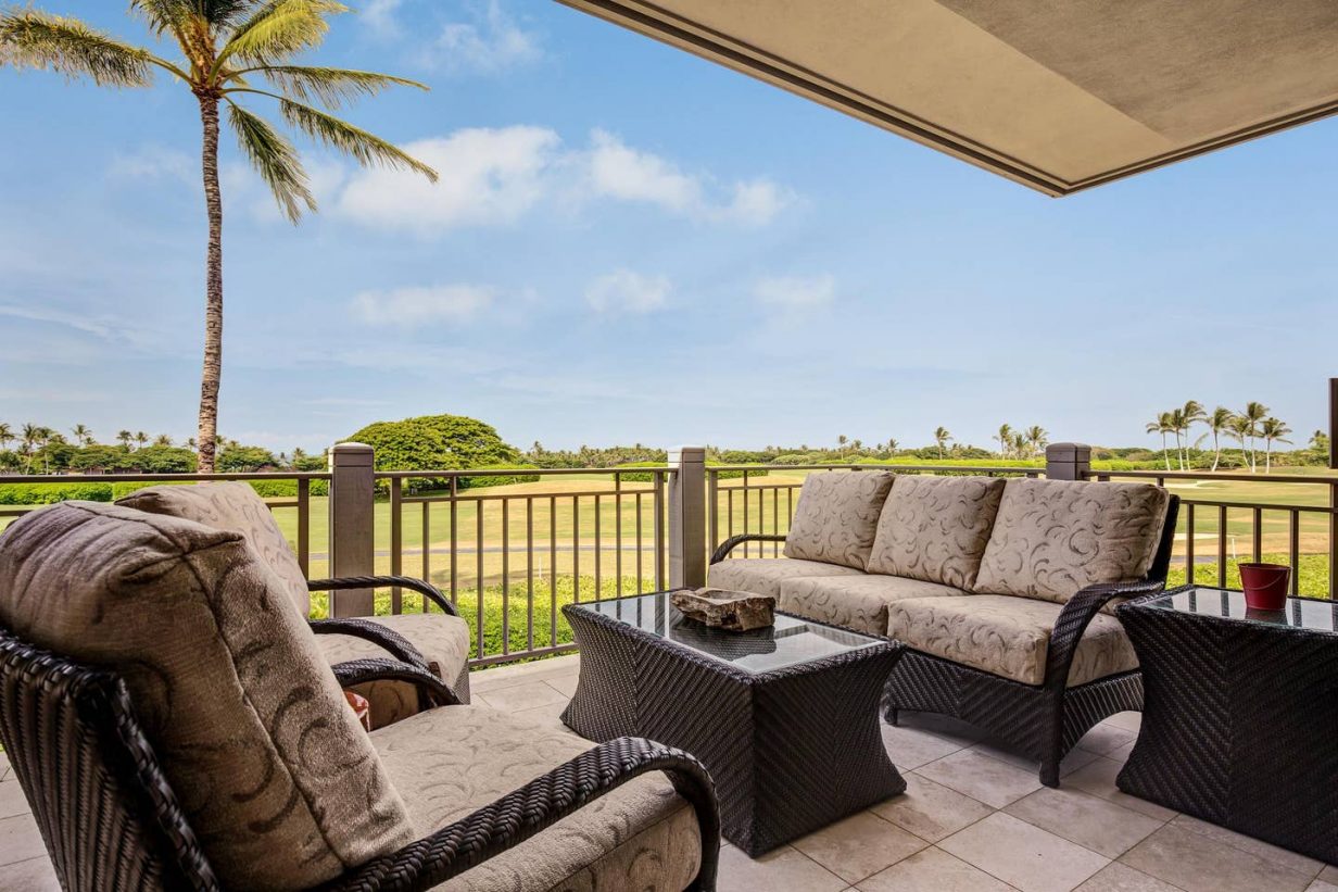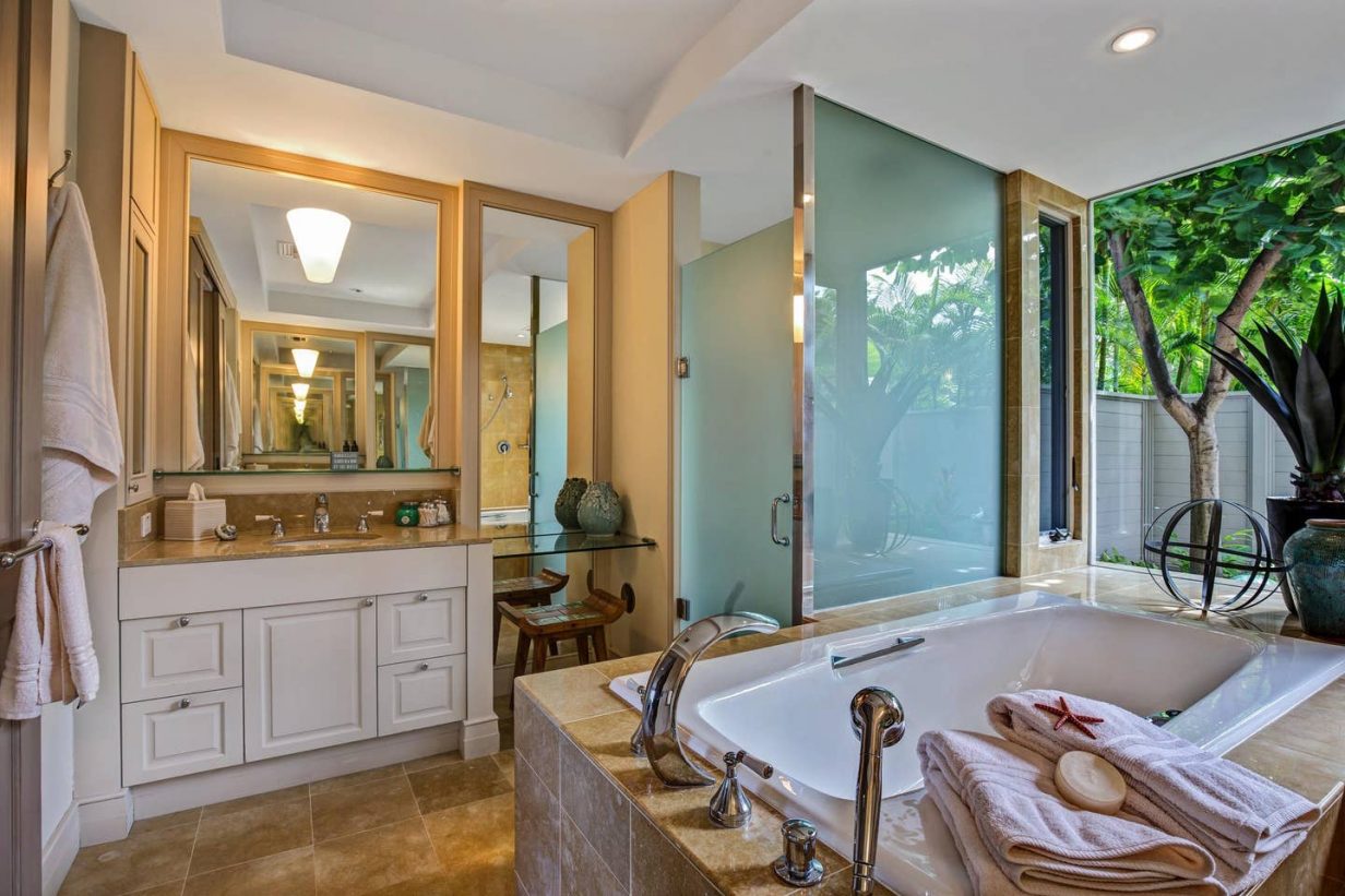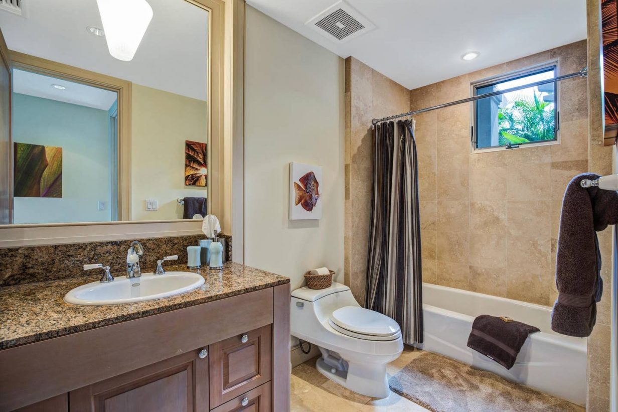 The spacious floor plan includes a downstairs master bedroom suite with king bed and luxury spa-like bath. Just off the master is a large living room with queen sized sofa pull out that opens to the downstairs lanai, leading to the lawn and golf course. Guests enjoy the extra space offered by the downstairs retreat. There is also a downstairs twin-bedded guest room (may convert to King upon request) and laundry area. Upstairs leads to the open “Great Room” with soaring high ceilings, commanding views of the golf course and ocean beyond. The additional upstairs guest room also consists of a King-bed configuration and there is a full bath just off the hallway to the bedroom. A second lanai off the living area brings the outdoor in, allowing for open-air, tropical living conditions.