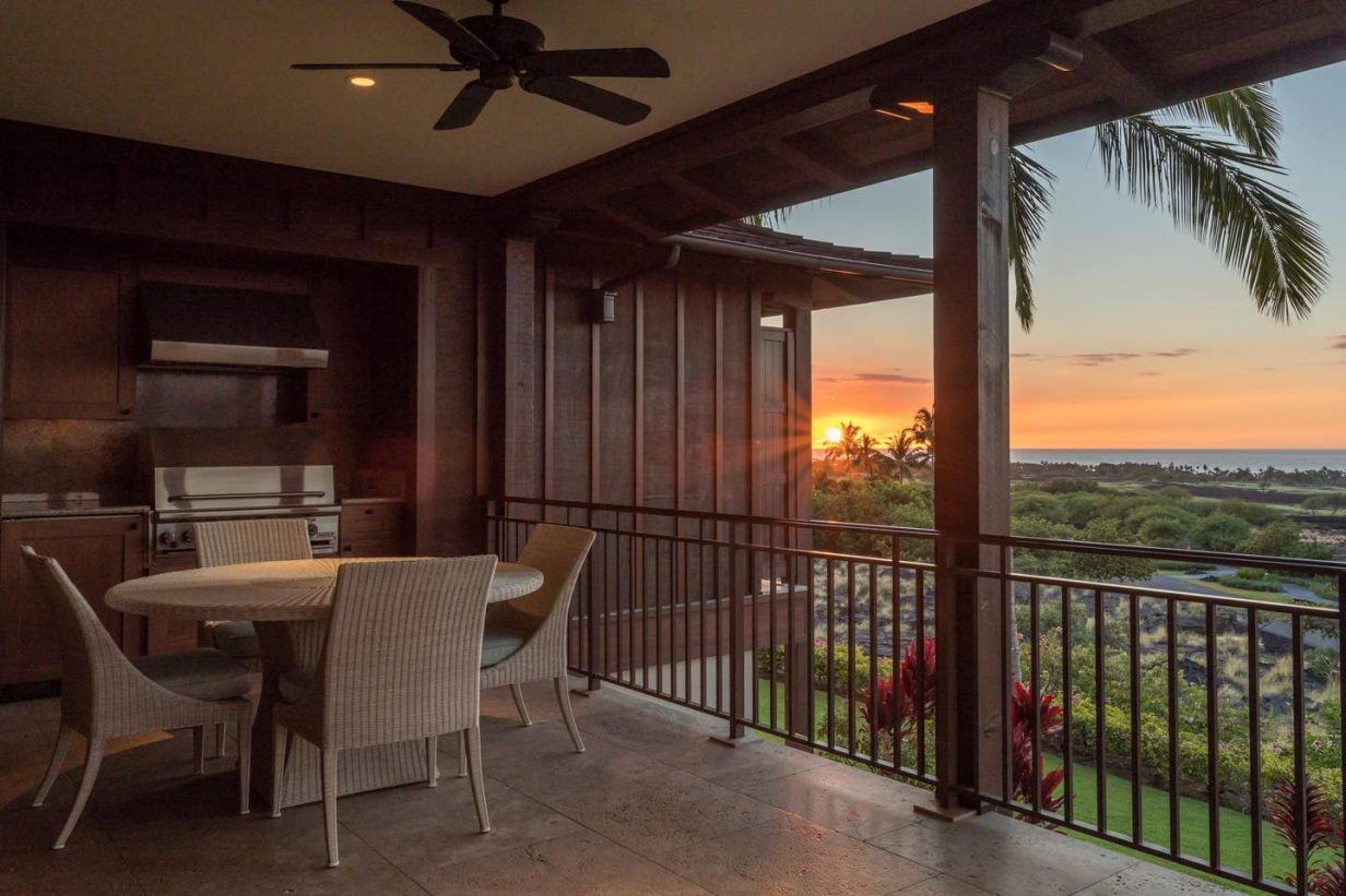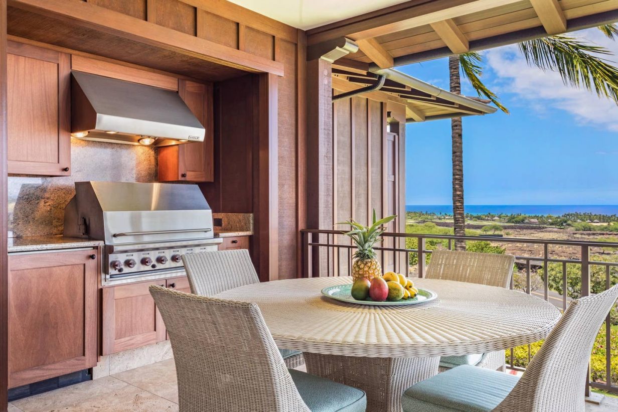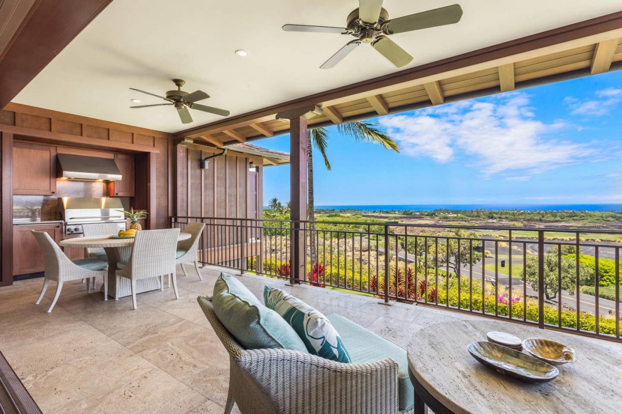 Built-in 2009, Haliipua Villas are the newest generation of multi-family villas at Hualalai offering an array of designer finishes throughout the home. Special features include luxurious mahogany finishes, island-inspired ceiling treatments, enhanced lighting systems, built-in lanai kitchen/barbecue, and 2 sumptuous lava rock garden showers. Property features 3 bedrooms and 3.5 baths on the ground level with a spacious living area on the upper floor. Panoramic ocean, coastal and sunset views are enjoyed from a large, covered, ocean-facing lanai with Hualalai and Mauna Kea views available from the mountain facing windows of the villa. A “bonus” family room is situated on the ground floor leading to a tropical-landscaped courtyard with bubbling water features. The king-bedded master bedroom includes a walk-in closet and a large ensuite bathroom with an outdoor shower garden. Bedroom 2 is an ocean view room with twin beds that may be converted to a king, and ensuite bath. Bedroom 3 is a “second master” with a large ensuite bath and shower garden of its own. The kitchen is well equipped and is open to a sitting area and “great room” with high, vaulted ceilings and wonderful ocean views. The villa is fully air-conditioned with zone controls. Two golf carts can whisk guests off to the Sports Cub & Spa and Four Seasons Hotel in just a few minutes or enjoy a leisurely stroll along the Jack Nicklaus-designed Hualalai Golf Course = excellent, central location in the Resort!