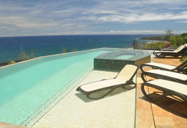 Amenities of this Kilauea Hawaii vacation rental include satellite cable, DVD collection, Apple computer, high-speed internet, fax office space, and a great room surround system. Special features of the home include an interior Koi pond, two living rooms, one with Chicory Baby Grand Piano, a lovely oceanfront dining room for 8, a separate breakfast room for 4, outdoor dining and magnificent executive chef kitchen with bar area, butler’s pantry and every kitchen amenity necessary. Just in front of the property on the ocean side, is a separate spa building. Here guests enjoy the exercise room and massage room. All specialty services like a massage or manicure can be arranged to take place here–the perfect oceanfront pampering locale! LICENSE#: TVNC#4201