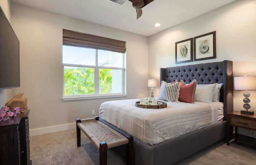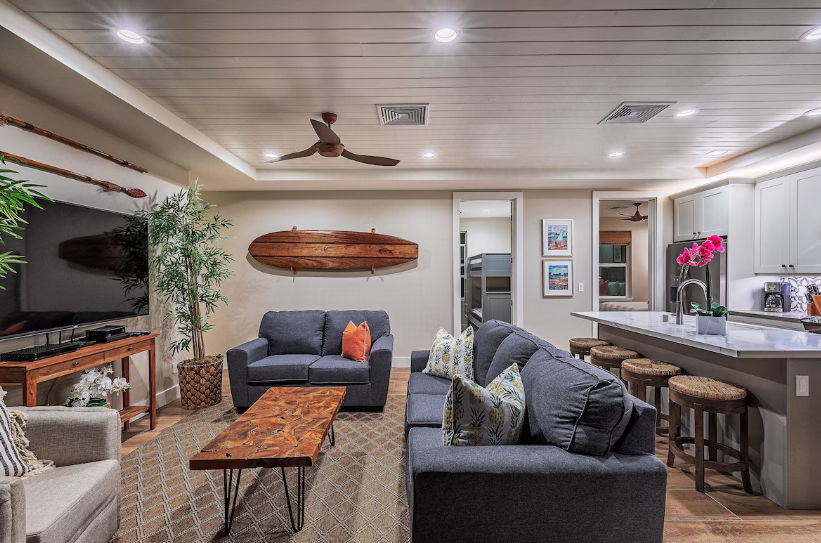Upon entering the front door, you’ll instantly feel the cozy beach vibe in the chef’s kitchen with quartz countertops and adjacent living room. Find 4 bedrooms close by which includes 2 master bedrooms and 2 guest bedrooms, one of which also has a bunk bed in it (perfect for kids). Because everything is brand new as of Sept 2018, you’ll be on of the first to enjoy 1000 thread count sheets, central air conditioning, fast wifi, new linens, custom furniture and a large pool with “lounging shelf” perfect for sun bathing and safe for kids to enjoy shallow waters.