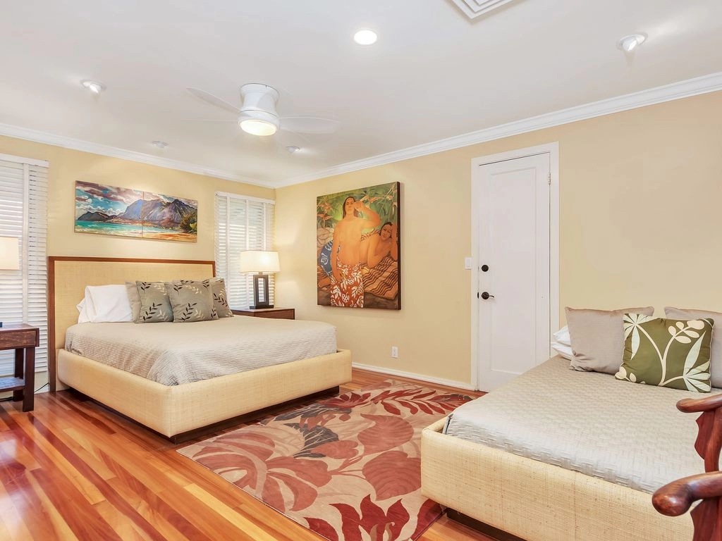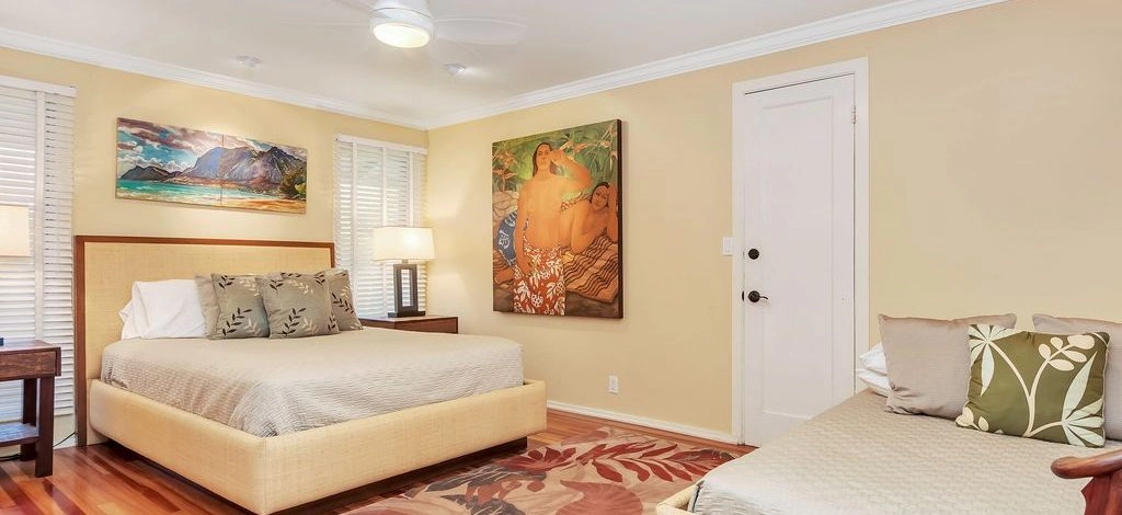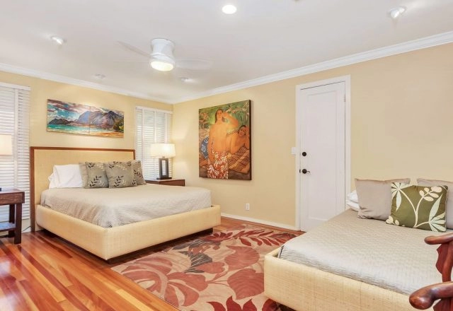 Pacific Charm features comfortable sleeping arrangements for 13 guests. The main house consists of 3 bedrooms each with en suite baths. All of the bedrooms are elegantly furnished with authentic Hawaiian decor and admirable antiques. The Master suite features a large walk-in closet, an additional dressing area, and a distinct King size koa bed. Indulge in a private Jacuzzi right off the Master suite. This private area allows for a personal outdoor retreat in a lush tropical environment. The second bedroom features a Queen bed with an additional Double punee. The third bedroom offers two Twin size beds. The additional two bedrooms are located in a separate guest cottage, or ohana, complete with a full bath and kitchenette. Both bedrooms feature a Queen bed. For an additional guest, there is a twin daybed in the ohana.