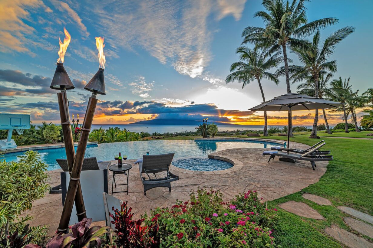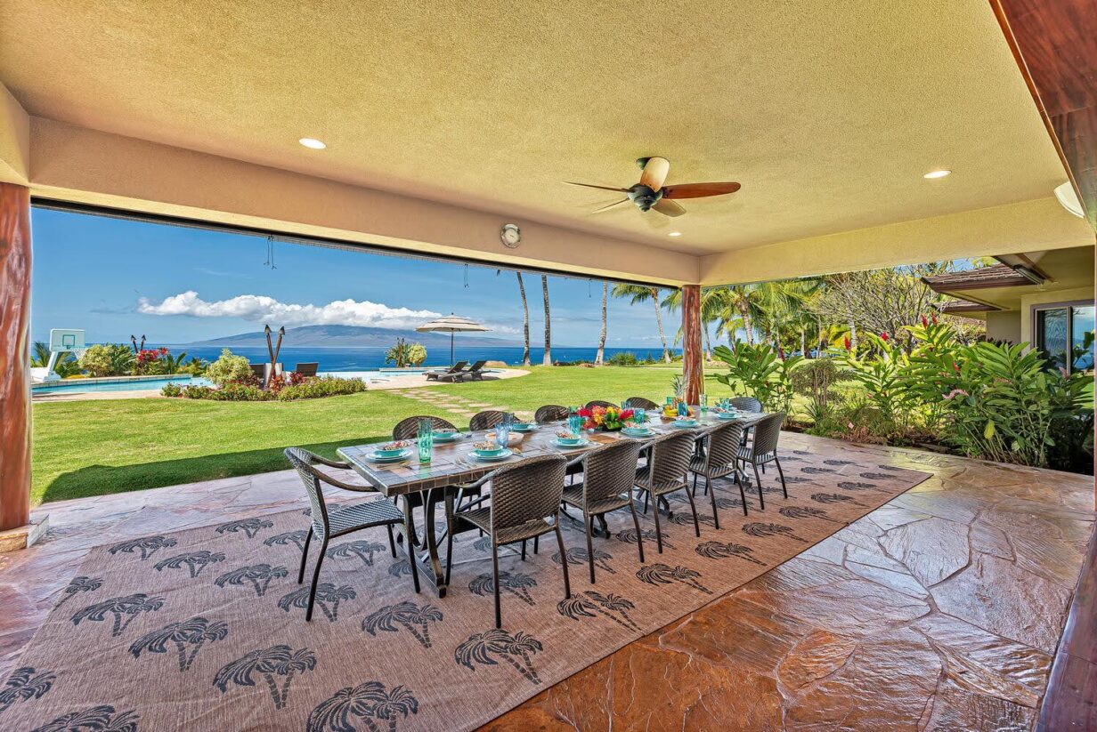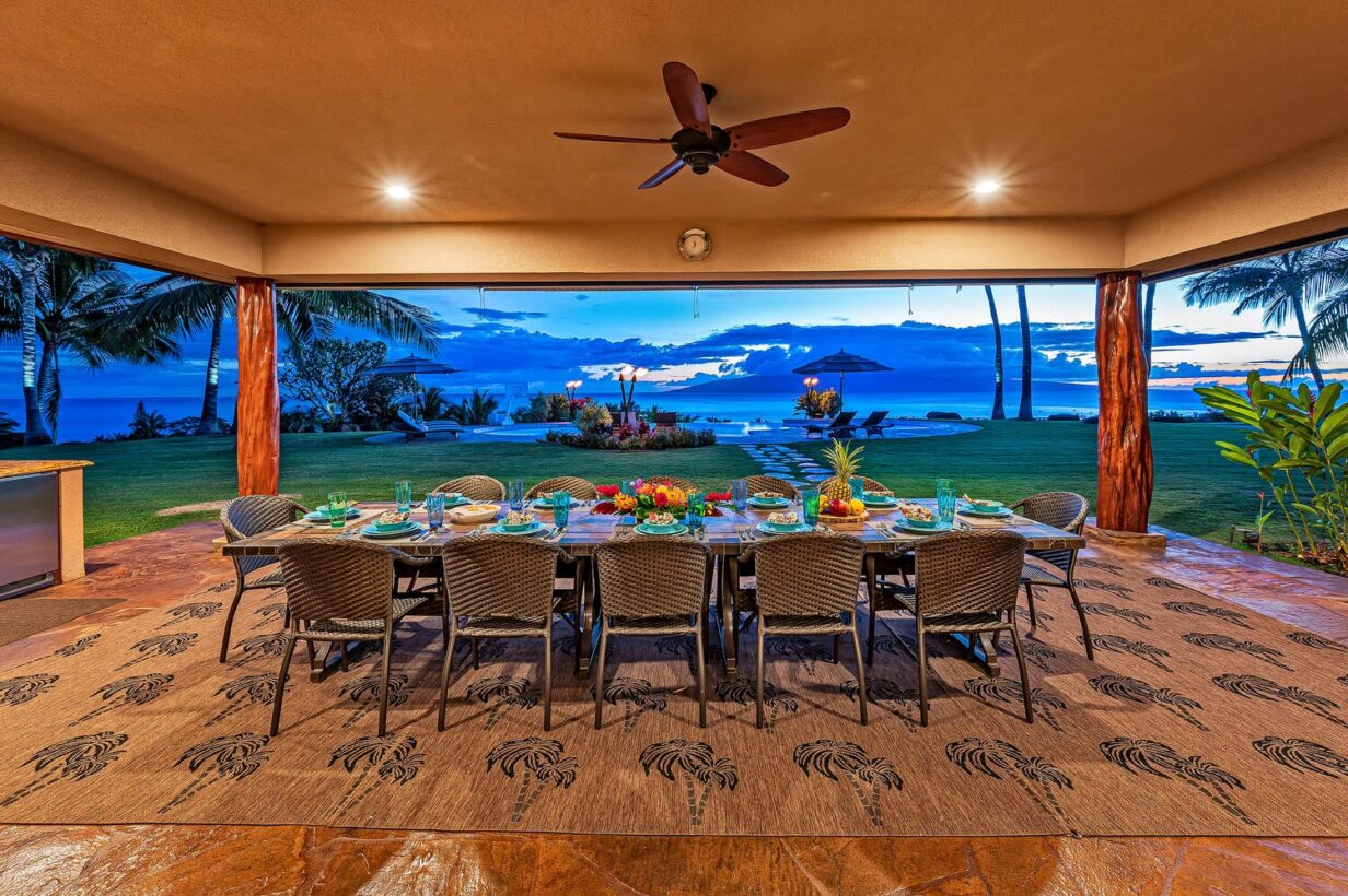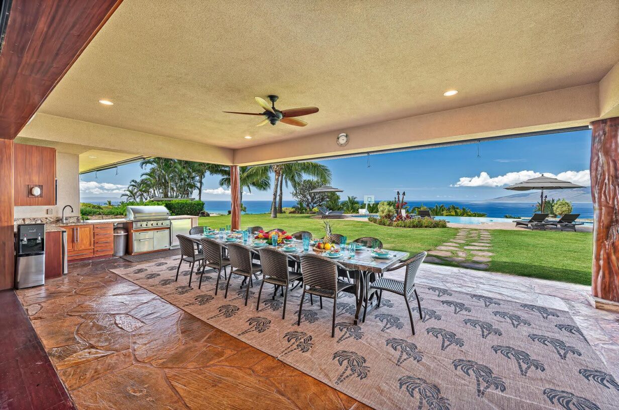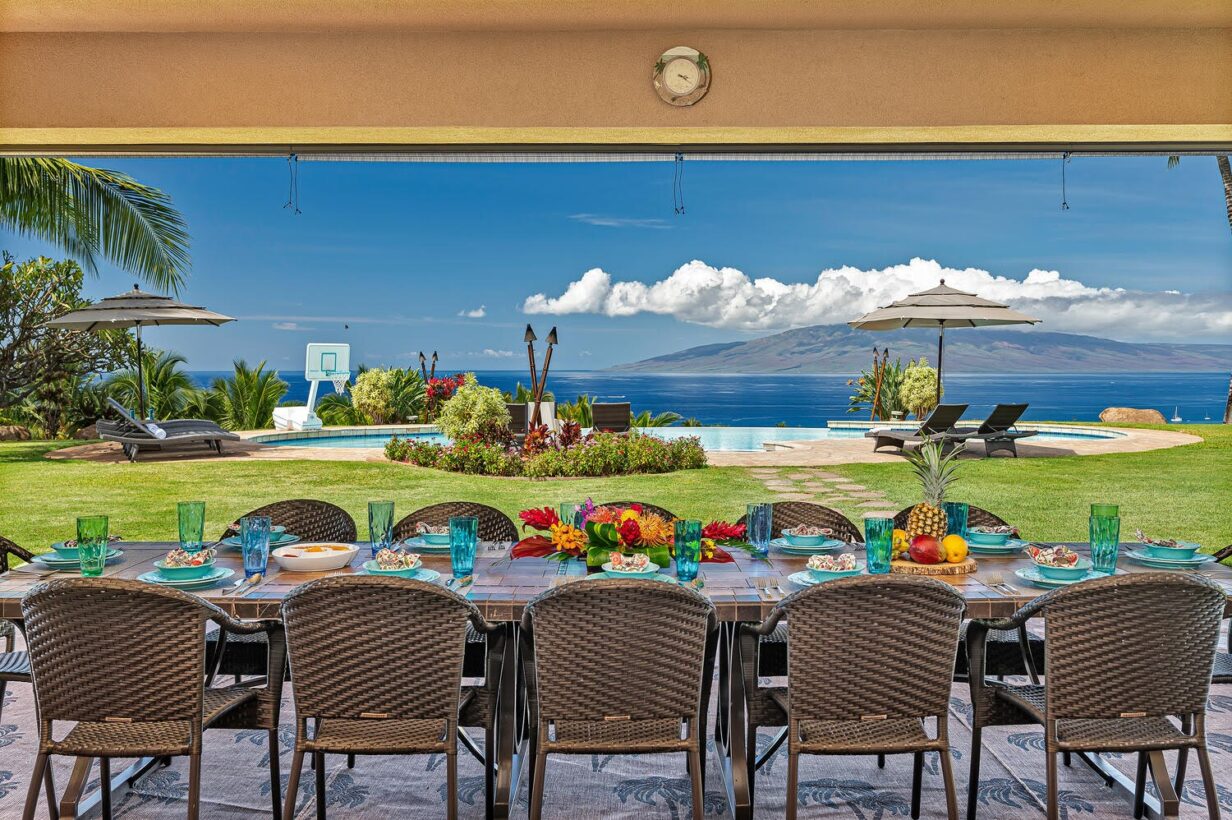 The outdoor area is wonderfully equipped for creating some of your precious Maui memories! Thus, no feature has been overlooked. Here you’ll find a built-in BBQ with prep space, a dishwasher, microwave oven, beverage refrigerator, sink with the garbage disposal, and pleasing outdoor dining and lounge furniture. The generously sized infinity-edge pool and spa are just steps from the covered outdoor dining area. If you prefer not to dine alfresco there’s also a large indoor table with ample space for your entire group to enjoy meals.