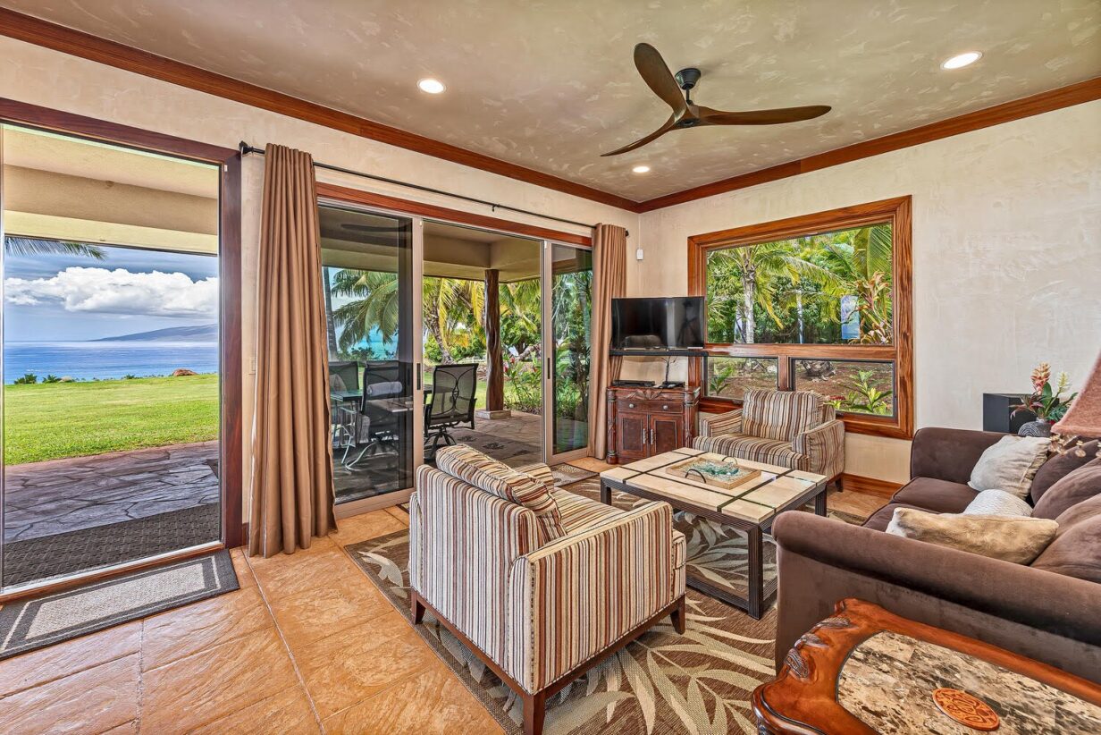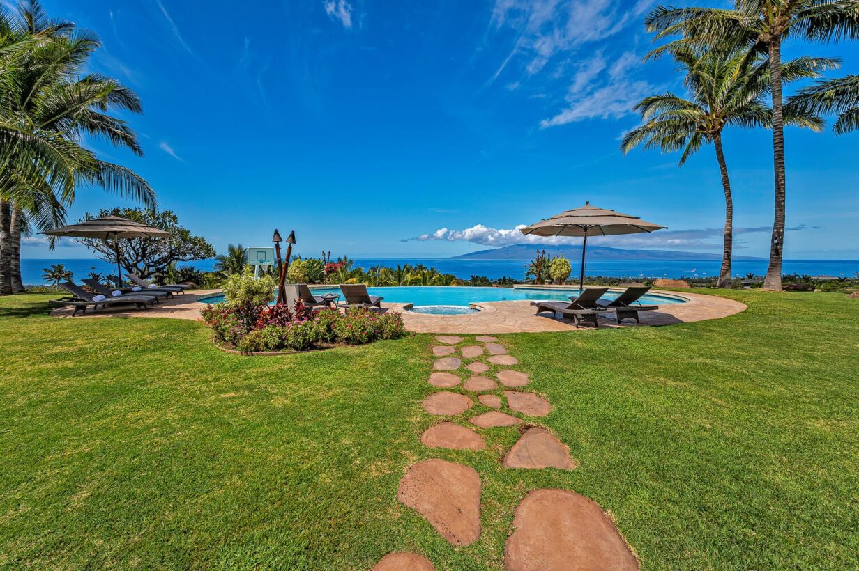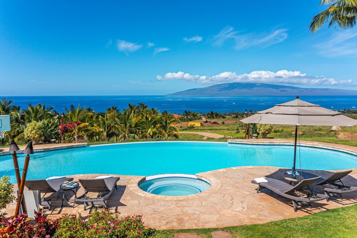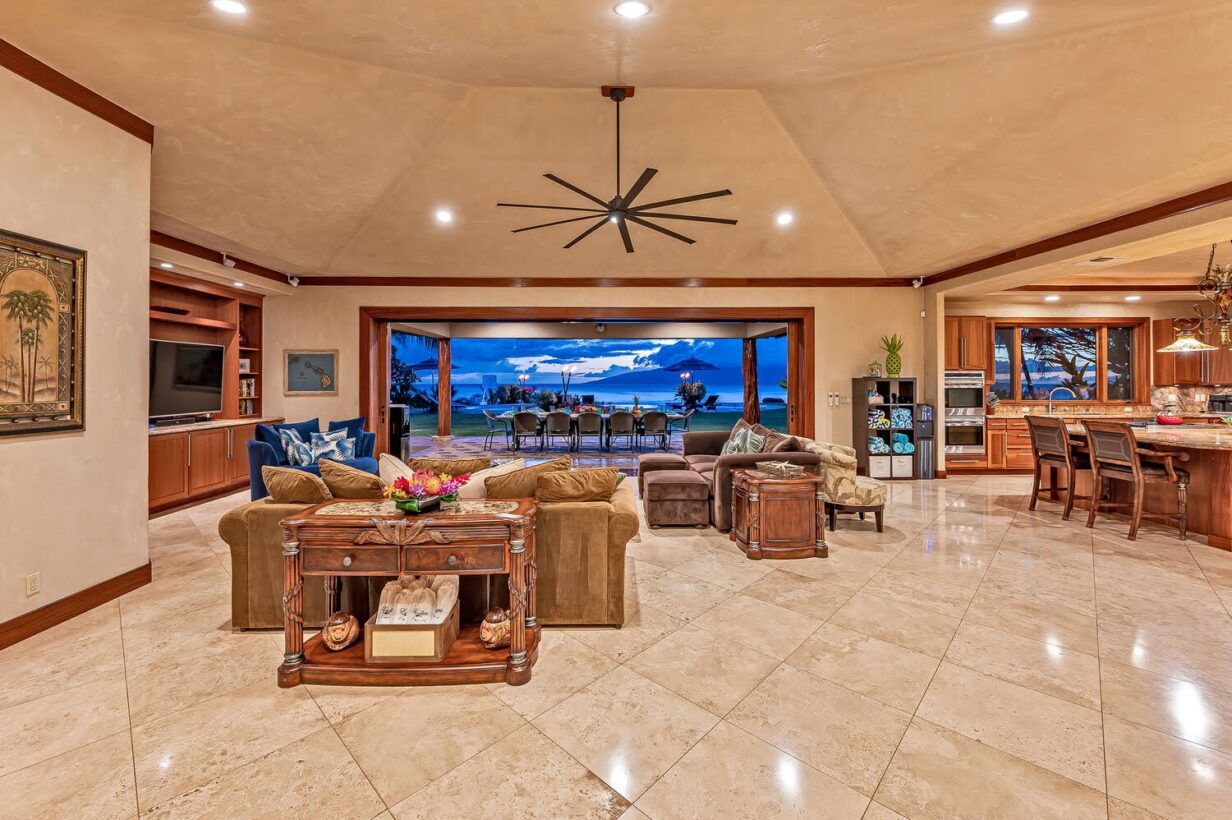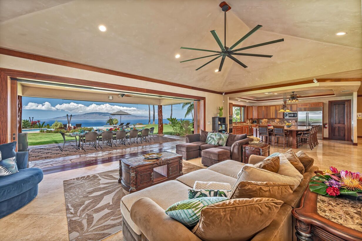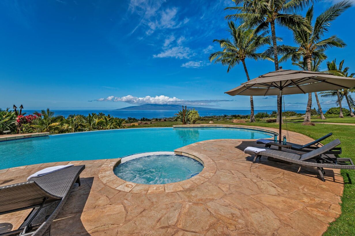 The outdoor area is wonderfully equipped for creating some of your precious Maui memories! Thus, no feature has been overlooked. Here you’ll find a built-in BBQ with prep space, a dishwasher, microwave oven, beverage refrigerator, sink with the garbage disposal, and pleasing outdoor dining and lounge furniture. The generously sized infinity-edge pool and spa are just steps from the covered outdoor dining area. If you prefer not to dine alfresco there’s also a large indoor table with ample space for your entire group to enjoy meals.