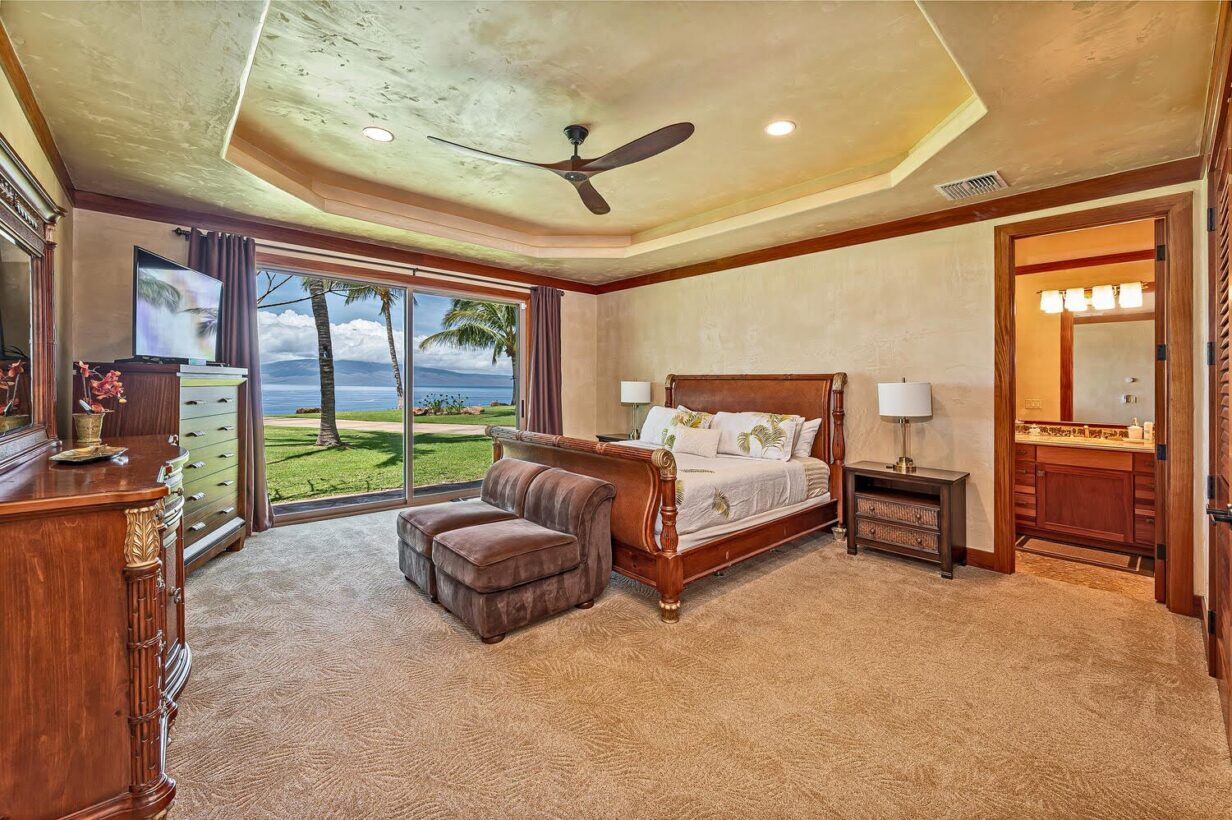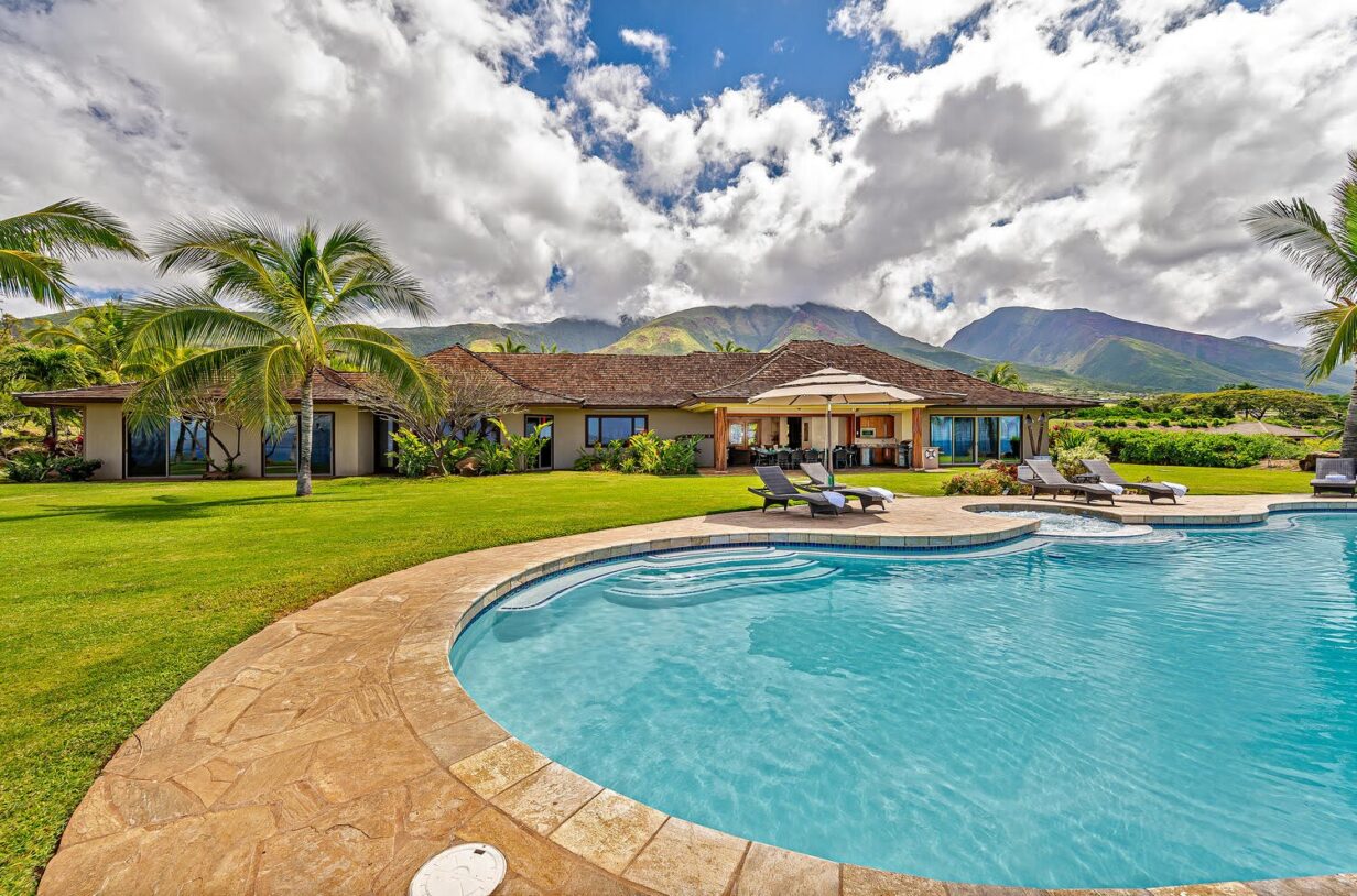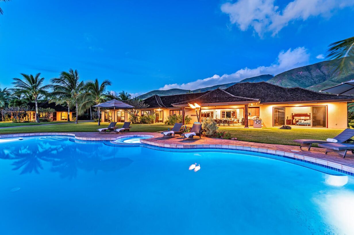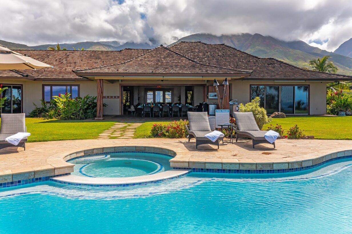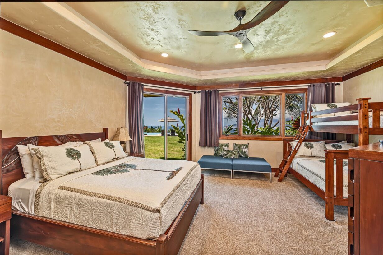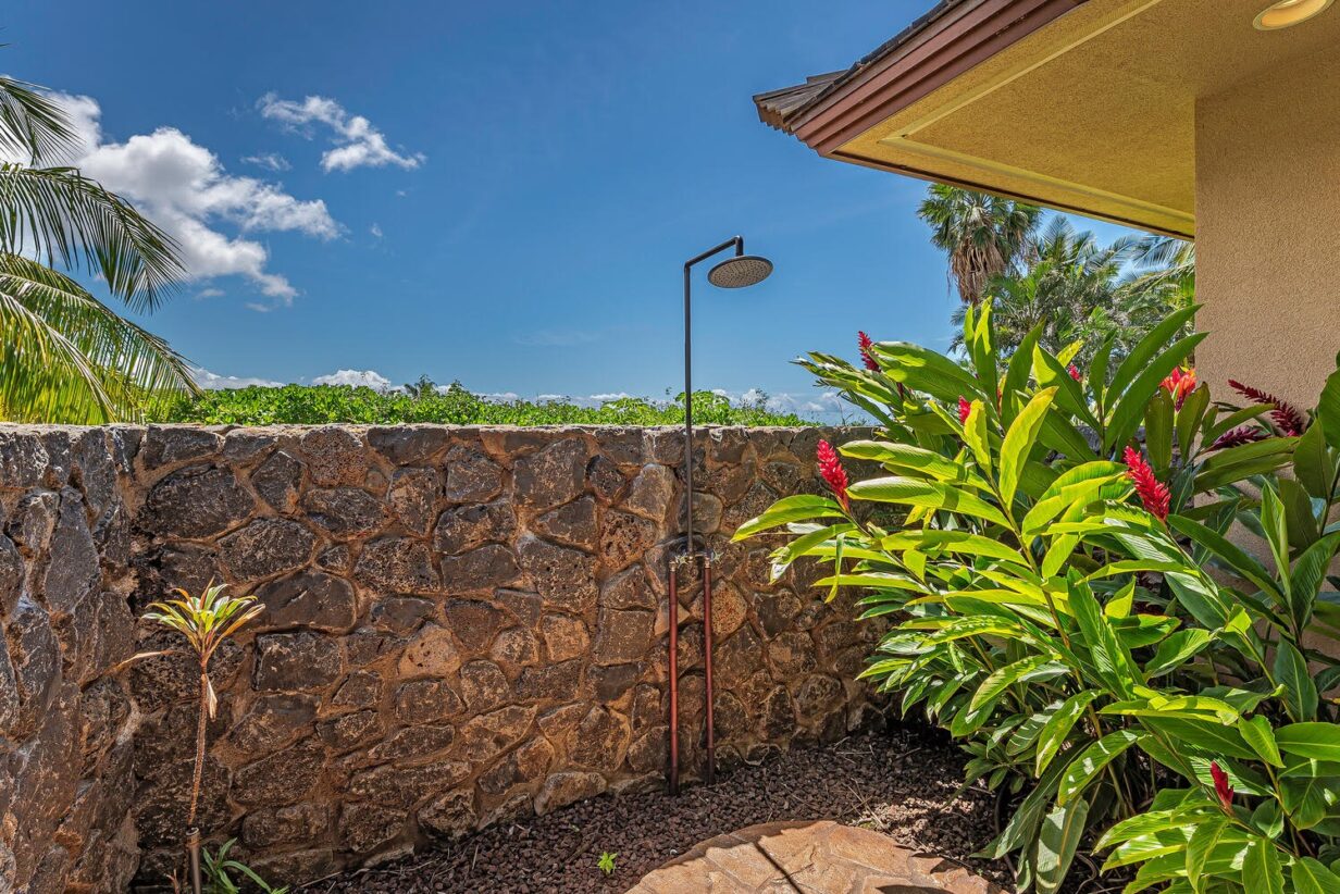 This private Maui estate consists of 6 bedrooms and 4.5 baths, with an outdoor shower to rinse off the sand after a relaxing day at the beach. The main house has 4 bedrooms and 3.5 bathrooms, with 2 bedrooms and 1 full bathroom in the separate Ohana (cottage.)