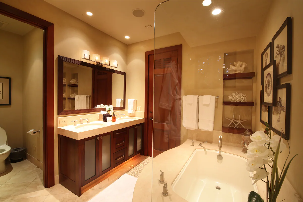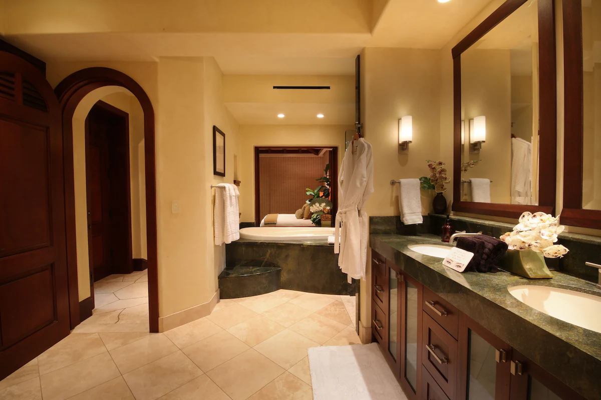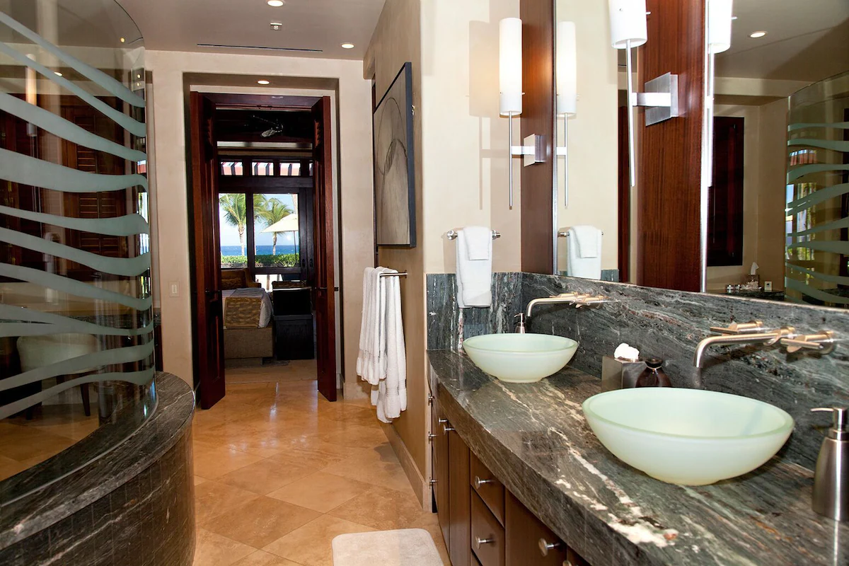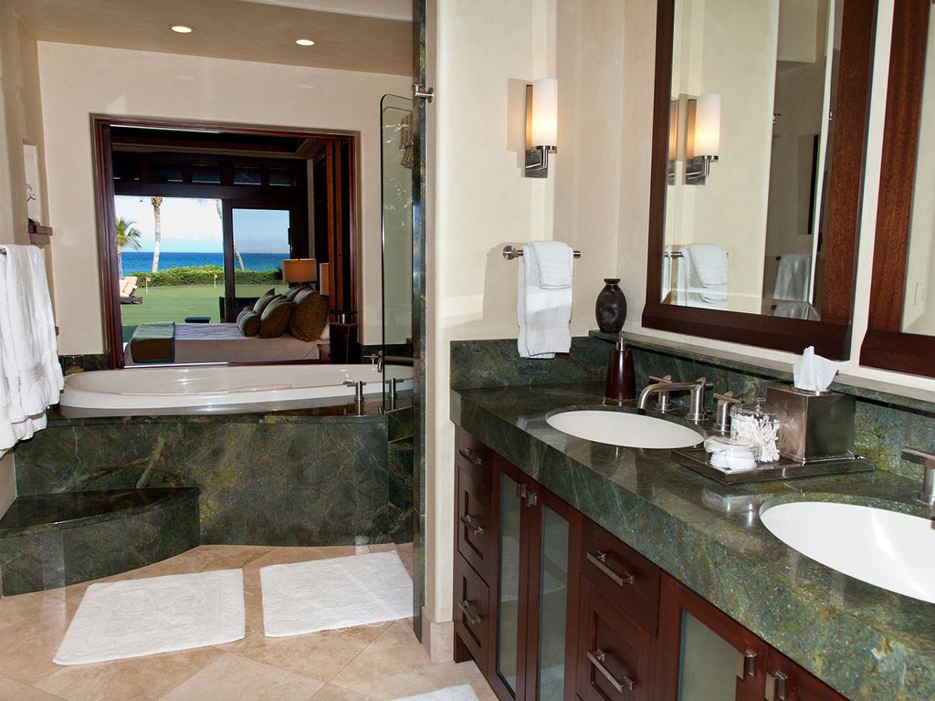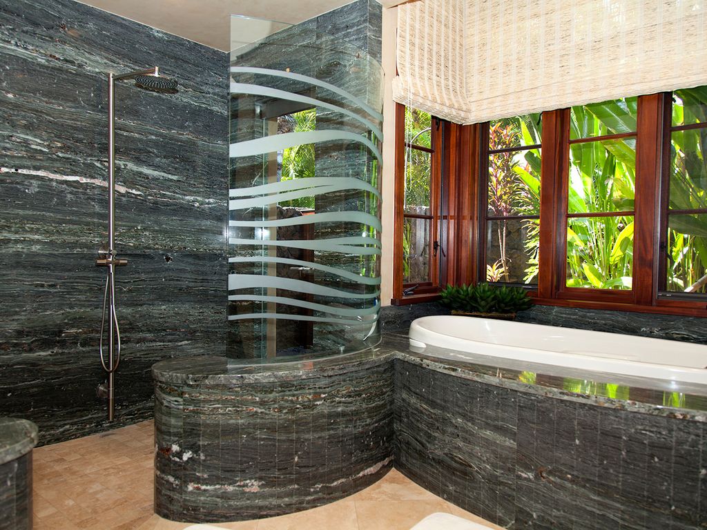 – Beautiful bathroom with large soaking tub, dual vanities, walk-in shower and private tropical outdoor garden shower