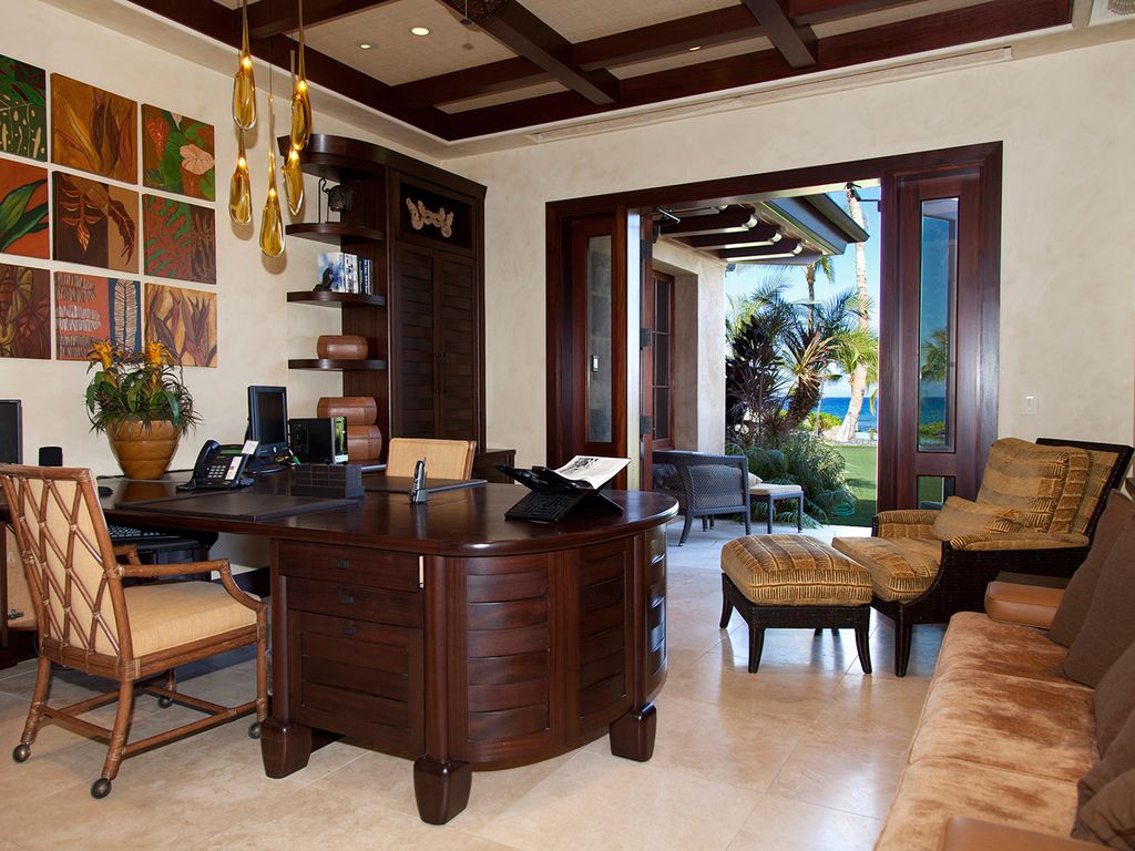 Pathway to Paradise presents a total of 6 bedrooms, 5.5 baths plus 4 private, outdoor showers. The generous layout comfortably accommodates a group of 12-13. The estate is equipped with zoned air conditioning units, ceiling fans, top-of-the-line finishes with Italian travertine stone floors throughout. The recognizable Great Room is appointed with large seating areas, appropriate HD TV with complimenting sound system, iPod compatible stereo system, and game table. Continue through to the kitchen and dining room, the large chef’s kitchen graciously offers all the space and premium major appliances to prepare a meal of any size. Once prepared, move into the dining room where guests will take pleasure in the beautiful ocean views while savoring their special meal. Exterior doors are completely open to the Grand Lanai to combine the enjoyment of both the indoor and outdoor ambiance. If you must connect with your day to day tasks, the office will provide a comfortable and peaceful workspace offering 2 work station desks and printer while the priceless ocean views and watercolor skies surround you.