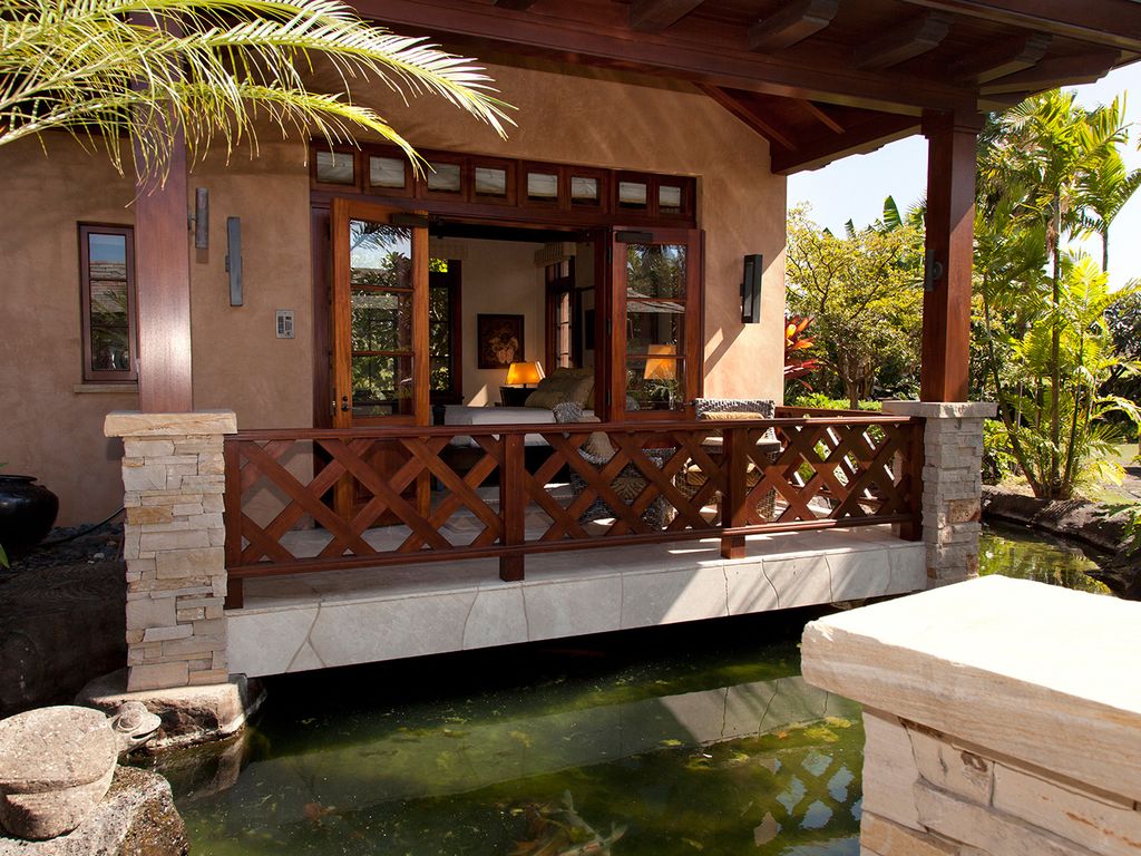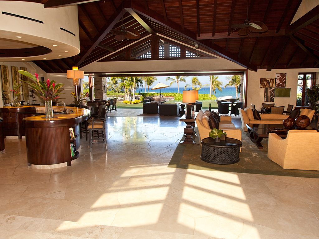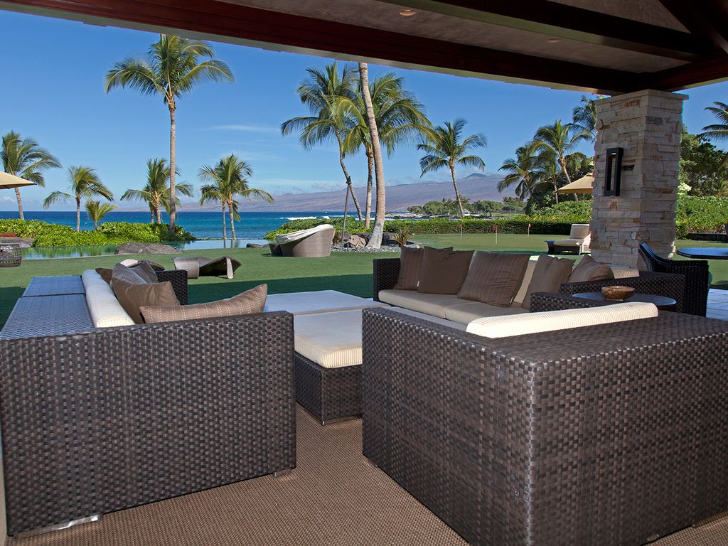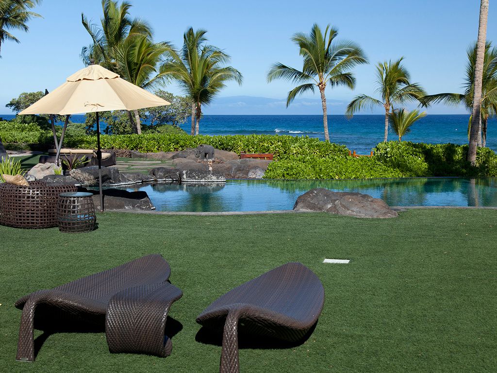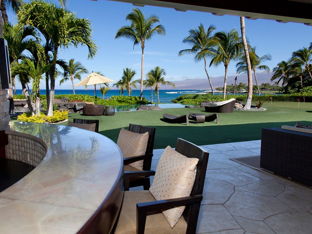 No detail is overlooked at this Big Island vacation rental! The exterior perfectly complements both the location and luxurious interior design. The appealing outdoor living areas are accented with lush tropical landscape, Koi pond with waterfall feature, tiki torchers throughout and a 4 hole putting green. Pathway to Paradise undoubtedly presents an expansive heated infinity pool and 12 person jacuzzi tub. The Grand Lanai offers such an enticing setting from the comfortable chaise lounge chairs, sofas, sunken bar, built-in BBQ and dining tables. As the day ends and the sun begins to set, the captivating setting is picturesque to create special memories that will last a lifetime!
