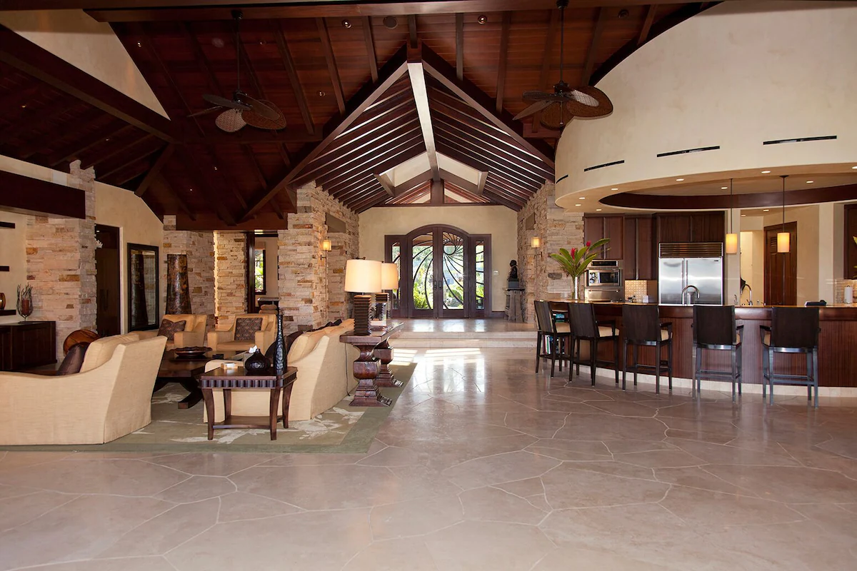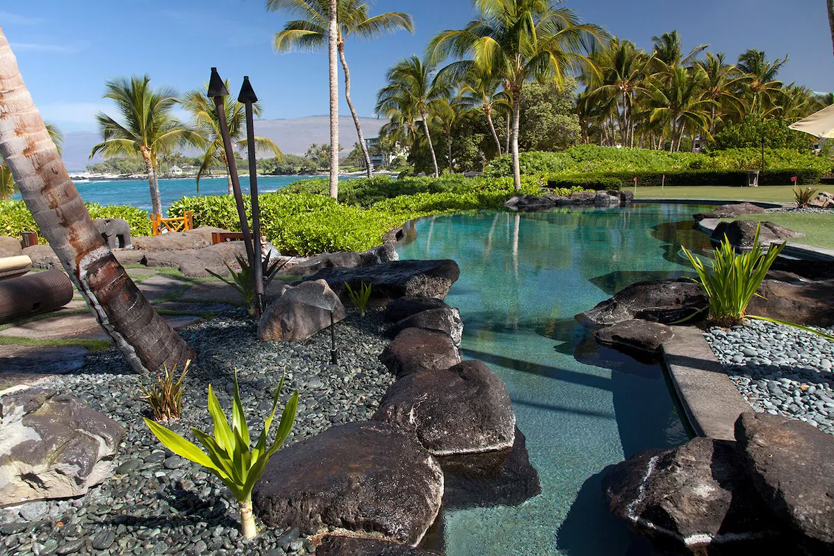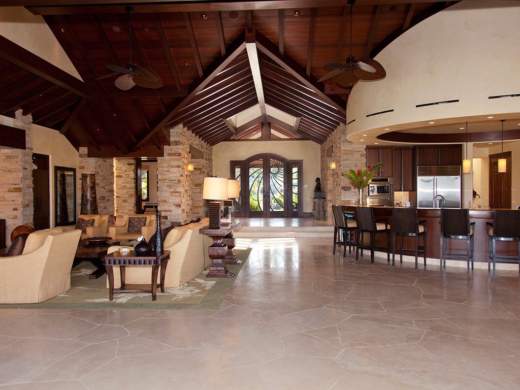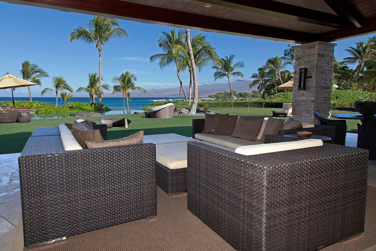 No detail is overlooked at this Big Island vacation rental! The exterior perfectly complements both the location and luxurious interior design. The appealing outdoor living areas are accented with lush tropical landscape, Koi pond with waterfall feature, tiki torchers throughout and a 4 hole putting green. Pathway to Paradise undoubtedly presents an expansive heated infinity pool and 12 person jacuzzi tub. The Grand Lanai offers such an enticing setting from the comfortable chaise lounge chairs, sofas, sunken bar, built-in BBQ and dining tables. As the day ends and the sun begins to set, the captivating setting is picturesque to create special memories that will last a lifetime!