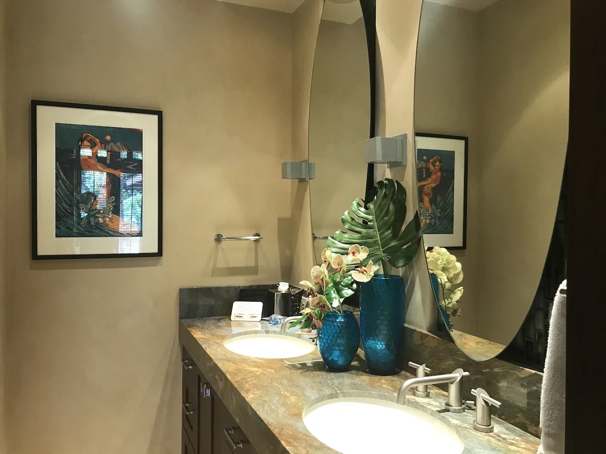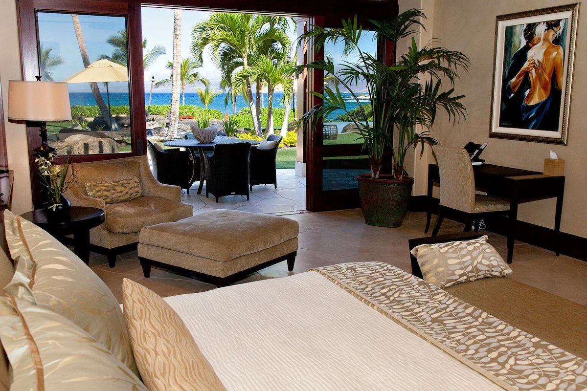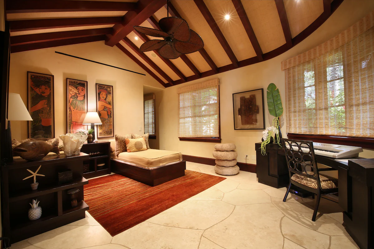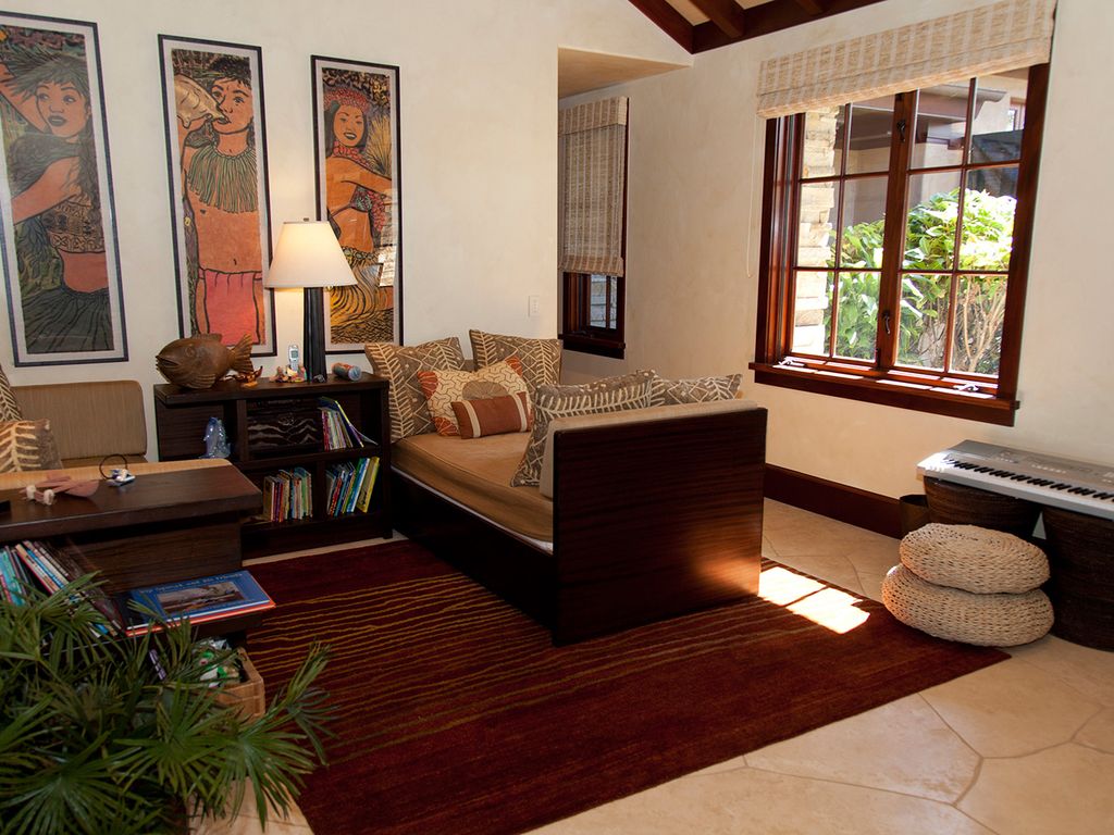 Introducing the distinct oceanfront Grand Master Suite. This grand suite offers a California King Bed, private lanai with appropriate seating, HD TV and expansive walk-in closet. The superior master bath is appointed with a jetted soaking tub with a rainfall showerhead, walk-in shower with exquisite curved glass and marble enclosure with a private tropical shower garden. The second master suite is also known as the “Oceanfront Junior Master Suite” also offers a California King Bed, private lanai with seating, HD TV and large walk-in closet. The en suite bath has a considerable soaking tub, walk-in shower with exquisite marble enclosure as well as private tropical shower garden. Continue to the proper Garden view suites. Bedroom Suite 3 consists of a California King Bed, walk-in closet and small lanai with chair swing. The en suite bathroom has a shower that opens up to a tropical garden area. The fourth bedroom, garden view suite 4, consists of a King size bed, walk-in closet that opens up to the interior courtyard and small lanai with sitting area. This bedroom shares a full bath just down the hall. This bathroom has a walk-in shower and tub. The last appointed bedroom is a separate structure known as the “Ohana Cottage” with private entry. The Ohana Cottage has its own kitchenette with microwave, sink, and under-counter refrigerator/freezer as well as a separate washer and dryer. The bedroom suite consists of a King size bed, HD TV, walk-in closet and private lanai and sitting area overlooking the koi pond and courtyard. The full bath has all the features of the main suites such as a large soaking tub, dual vanities, walk-in shower, and private tropical outdoor garden shower. This is the perfect suite for the guest who prefers their privacy or the caregiver taking care of the special guest(s) of the family. Each bedroom suite is outfitted with luxurious and high-quality linens, towels, bath products, and spa robes. Pathway to Paradise has a separate room that can be utilized as a Den or a bedroom. This room is appointed with comfortable seating, two twin beds, desk, HD TV. The bedroom shares a full bath just a few steps away.