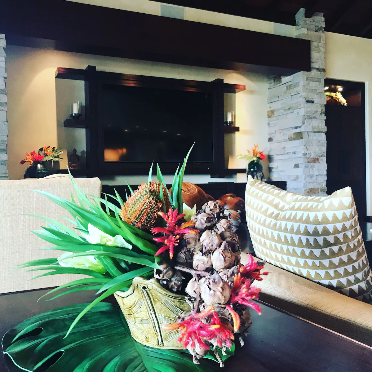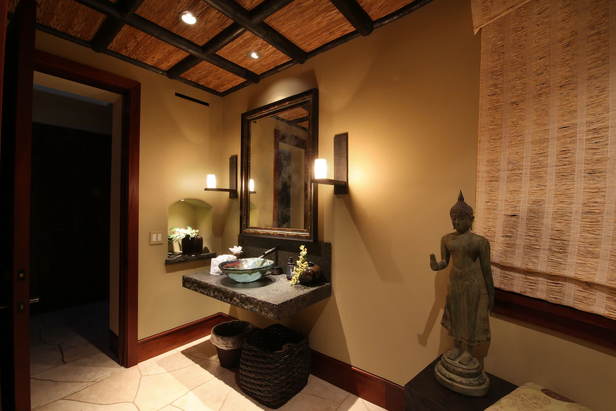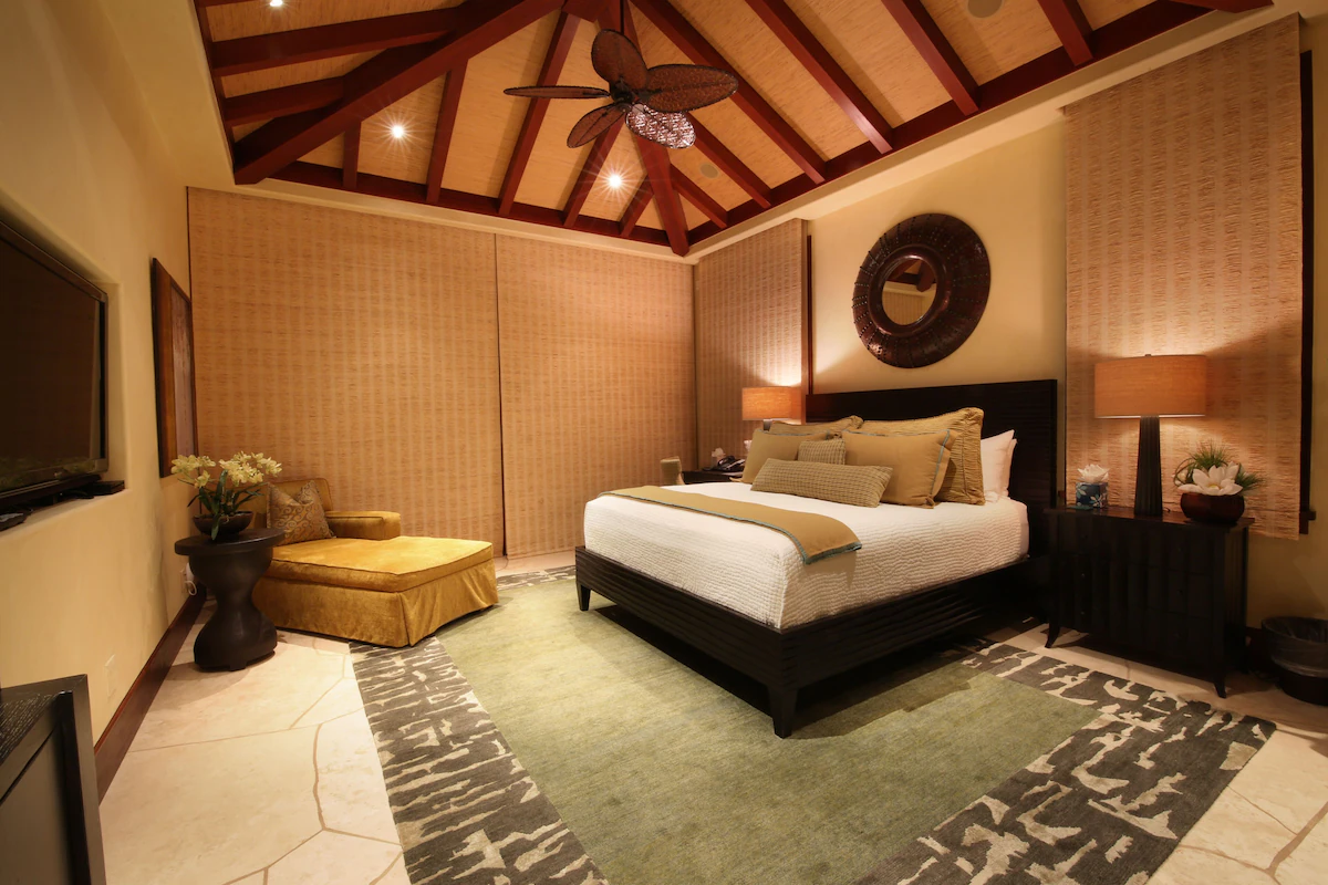 Introducing the distinct oceanfront Grand Master Suite. This grand suite offers a California King Bed, private lanai with appropriate seating, HD TV and expansive walk-in closet. The superior master bath is appointed with a jetted soaking tub with a rainfall showerhead, walk-in shower with exquisite curved glass and marble enclosure with a private tropical shower garden. The second master suite is also known as the “Oceanfront Junior Master Suite” also offers a California King Bed, private lanai with seating, HD TV and large walk-in closet. The en suite bath has a considerable soaking tub, walk-in shower with exquisite marble enclosure as well as private tropical shower garden. Continue to the proper Garden view suites. Bedroom Suite 3 consists of a California King Bed, walk-in closet and small lanai with chair swing. The en suite bathroom has a shower that opens up to a tropical garden area. The fourth bedroom, garden view suite 4, consists of a King size bed, walk-in closet that opens up to the interior courtyard and small lanai with sitting area. This bedroom shares a full bath just down the hall. This bathroom has a walk-in shower and tub. The last appointed bedroom is a separate structure known as the “Ohana Cottage” with private entry. The Ohana Cottage has its own kitchenette with microwave, sink, and under-counter refrigerator/freezer as well as a separate washer and dryer. The bedroom suite consists of a King size bed, HD TV, walk-in closet and private lanai and sitting area overlooking the koi pond and courtyard. The full bath has all the features of the main suites such as a large soaking tub, dual vanities, walk-in shower, and private tropical outdoor garden shower. This is the perfect suite for the guest who prefers their privacy or the caregiver taking care of the special guest(s) of the family. Each bedroom suite is outfitted with luxurious and high-quality linens, towels, bath products, and spa robes. Pathway to Paradise has a separate room that can be utilized as a Den or a bedroom. This room is appointed with comfortable seating, two twin beds, desk, HD TV. The bedroom shares a full bath just a few steps away.