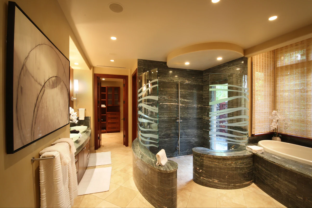– Walk-in shower, tub, dual vanities