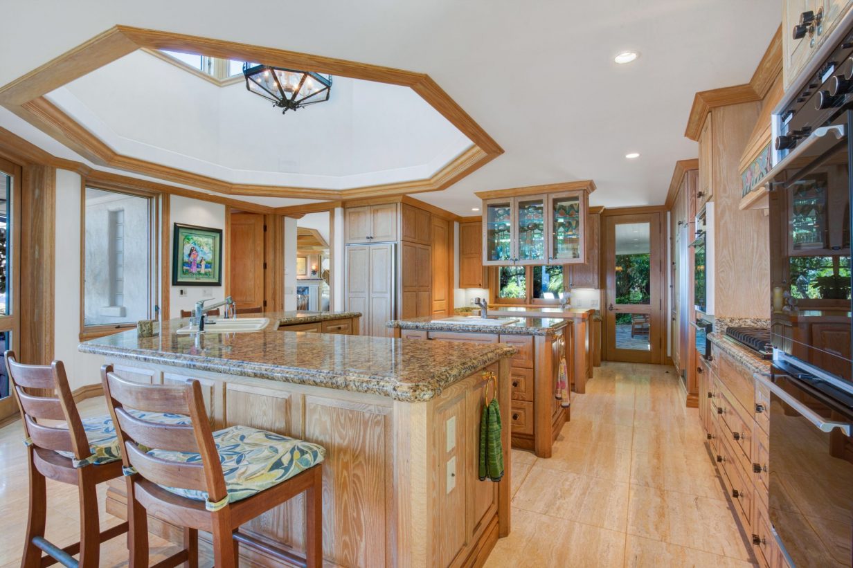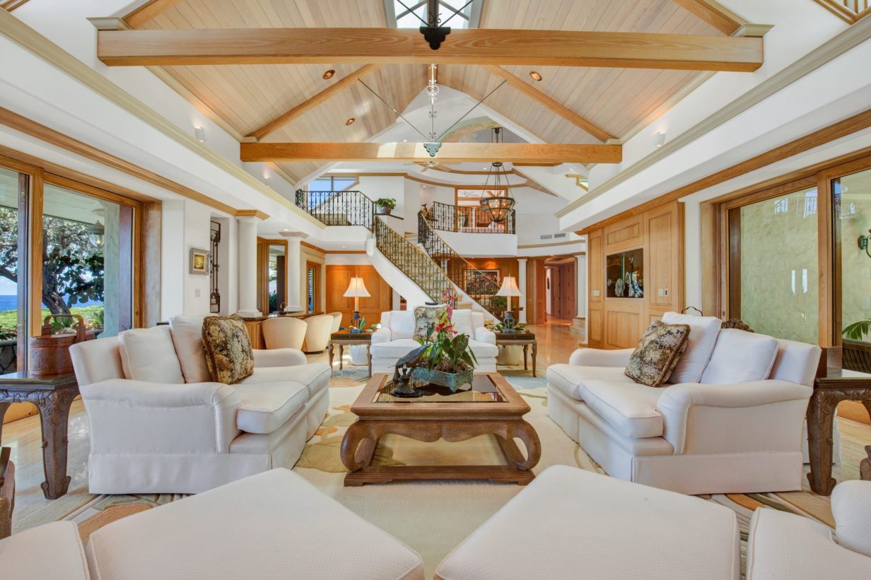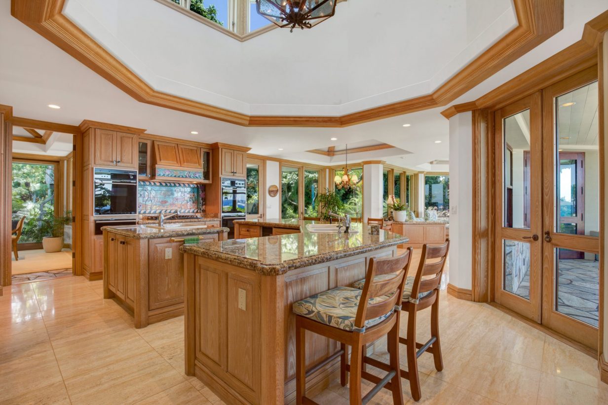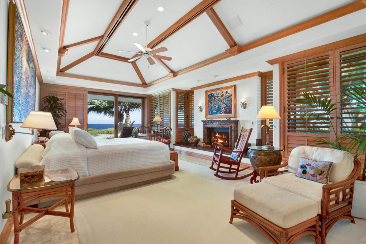 Entering through a bronze gate, guests will be captivated by the delightful courtyard and spa area, which is flanked on either side by the guest wing bedrooms. Etched glass double doors lead into the main house and a foyer with a jaw-dropping 30′ domed ceiling adorned with colorful murals. The grandeur of the 2 story Great Room will take your breath away with its stately rotundas and graceful marble columns. The style of this Kohala Coast vacation home is a mix of old-world charm that meets Hawaiian ambiance and throughout the property, great use has been made of rich, warm woods, cool marble, and high-end appliances.