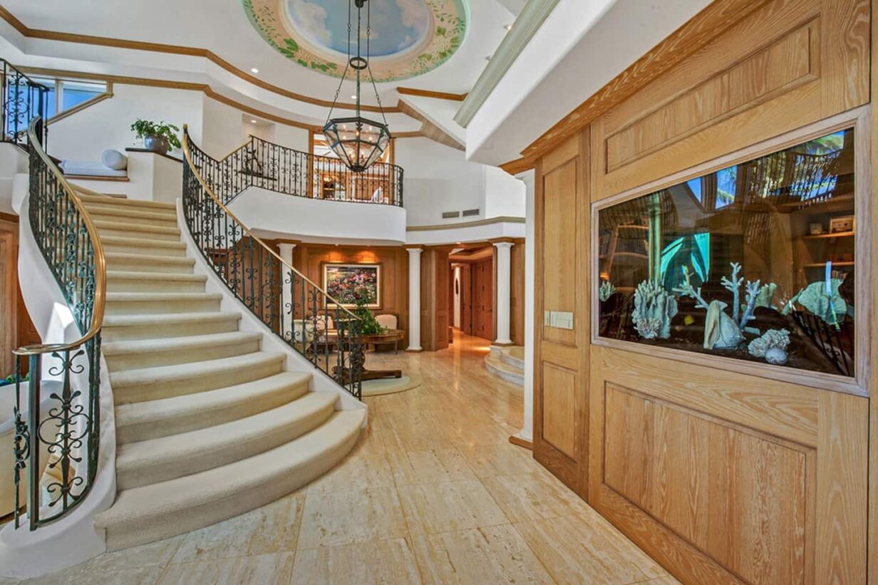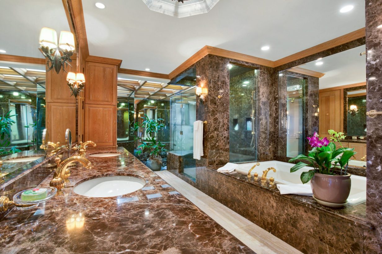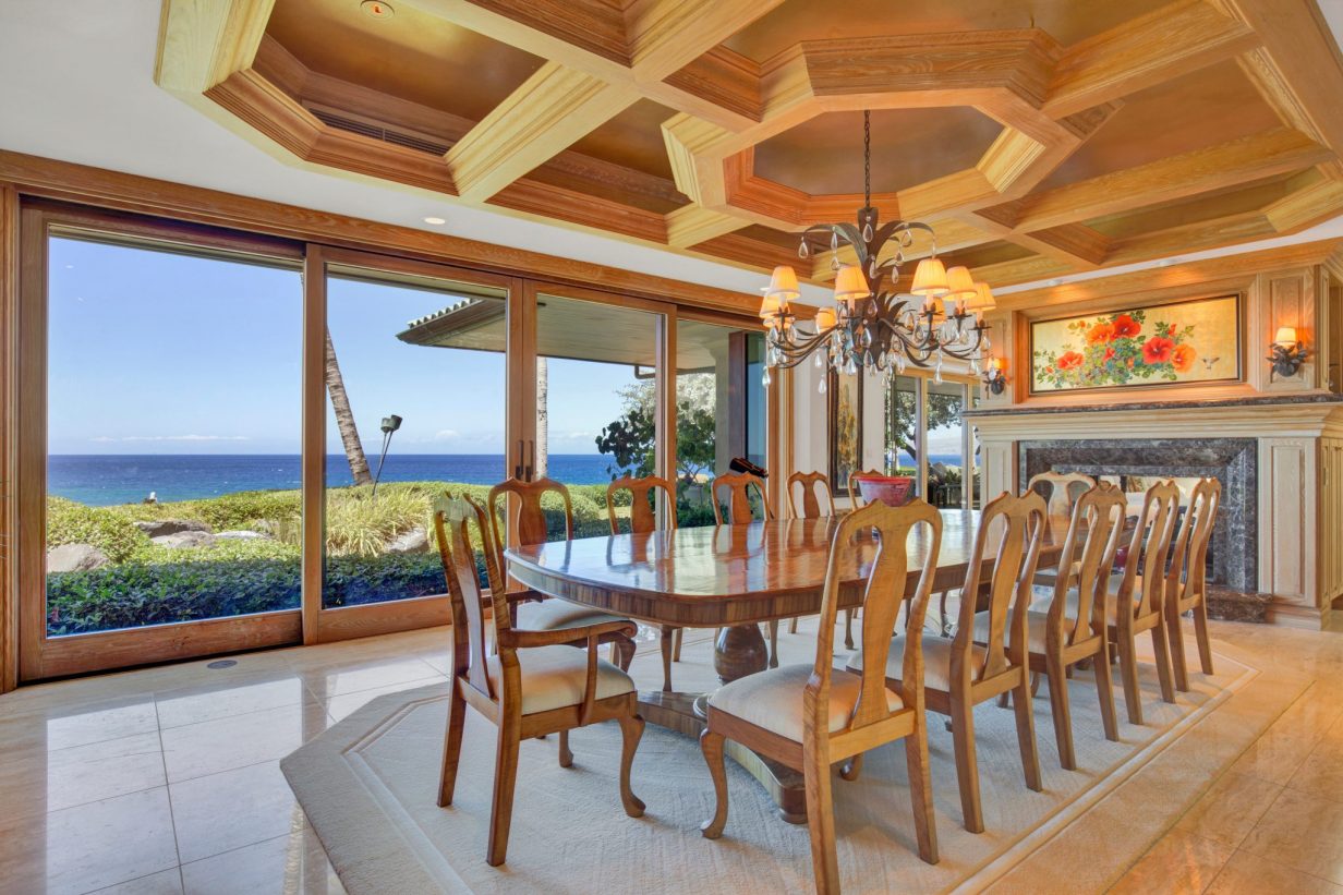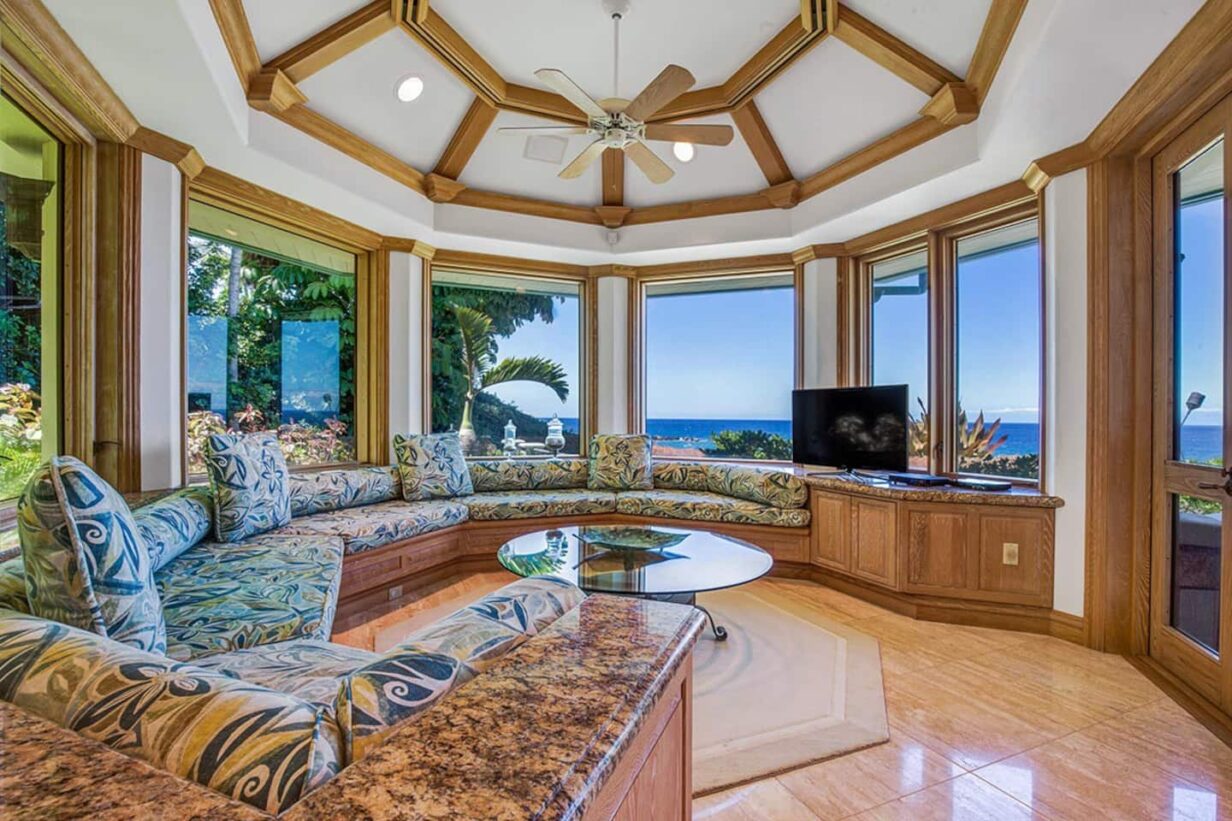 Entering through a bronze gate, guests will be captivated by the delightful courtyard and spa area, which is flanked on either side by the guest wing bedrooms. Etched glass double doors lead into the main house and a foyer with a jaw-dropping 30′ domed ceiling adorned with colorful murals. The grandeur of the 2 story Great Room will take your breath away with its stately rotundas and graceful marble columns. The style of this Kohala Coast vacation home is a mix of old-world charm that meets Hawaiian ambiance and throughout the property, great use has been made of rich, warm woods, cool marble, and high-end appliances.