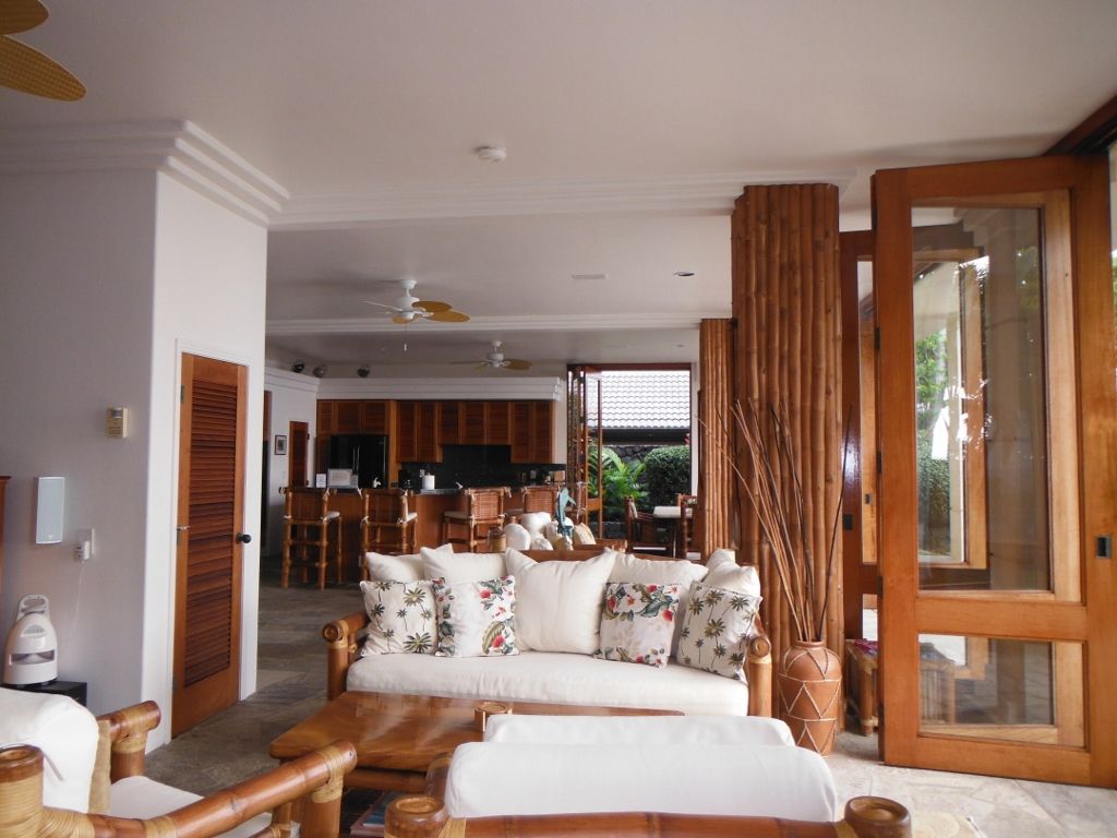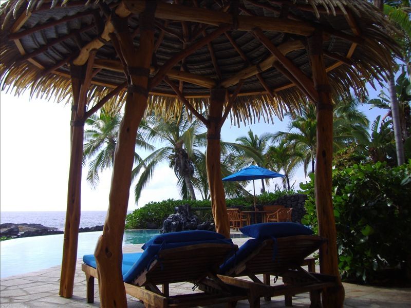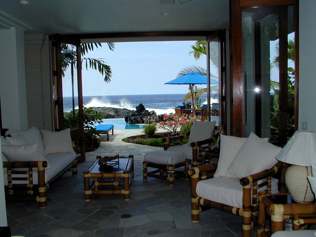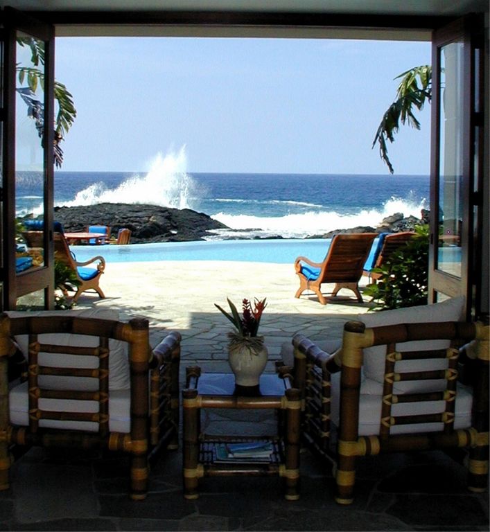 Sapphire comes furnished with a designer dream kitchen, open air oceanfront dining room, kitchen bar, living room, entertainment room, and an idyllic oceanfront location. The stunning Master Suite consists of a King Bali-style coconut bed, panoramic ocean views, adjacent pampered study and private whale watching tower! The two tropical Guest Suites, each with separate entrance and opening onto the lavish courtyard and waterfalls, feature Queen bed and en-suite bath. A separate Ohana Cottage Suite offers its own kitchen, kitchen bar, sitting area, lanai and Queen bed. The Kailua Kona vacation rental home sleeps eight, plus futons for children. The Master Suite includes a private whale watching tower! The Master Study includes a teak desk, fax/copy machine, DSL, printer, teak and leather lounge chairs with TV, wet bar & refrigerator. Sapphire is a marvelous oceanfront custom home intricately designed to capture the essence of waterfront Hawaii living. Bamboo furniture adds to the tropical feel of the high ceiling open living area which extends out onto the Lanai. There is an area to sit and enjoy the ocean views and the infinity pool, a more private area to engage in conversation, and an entertainment area to enjoy the surround sounds of TV, a movie, or relaxing music.