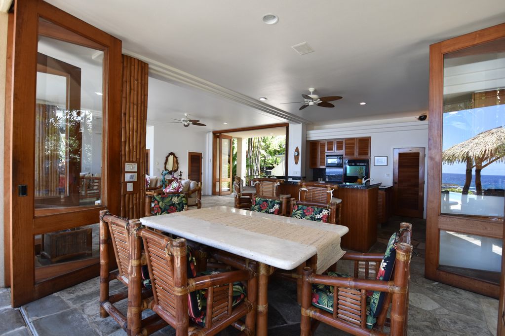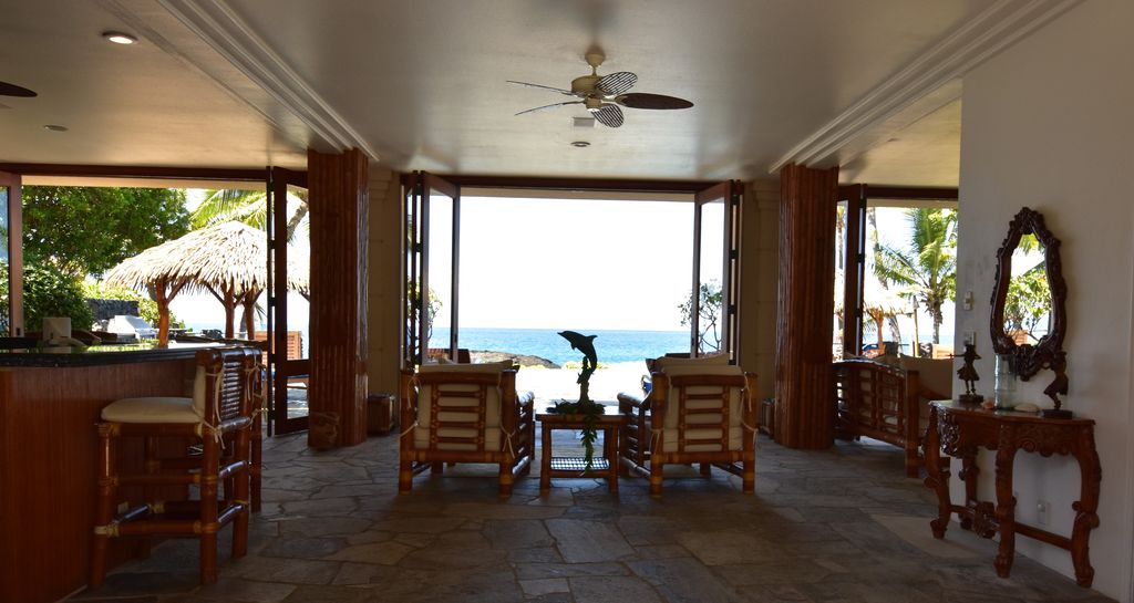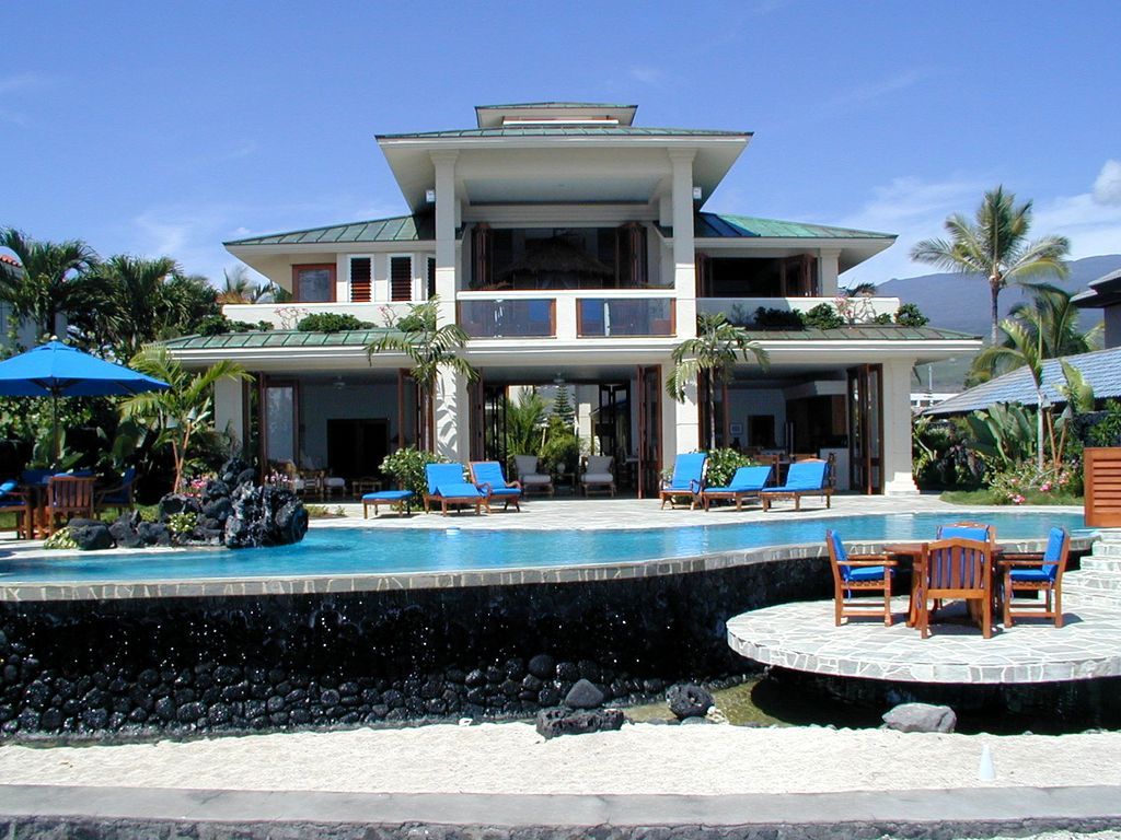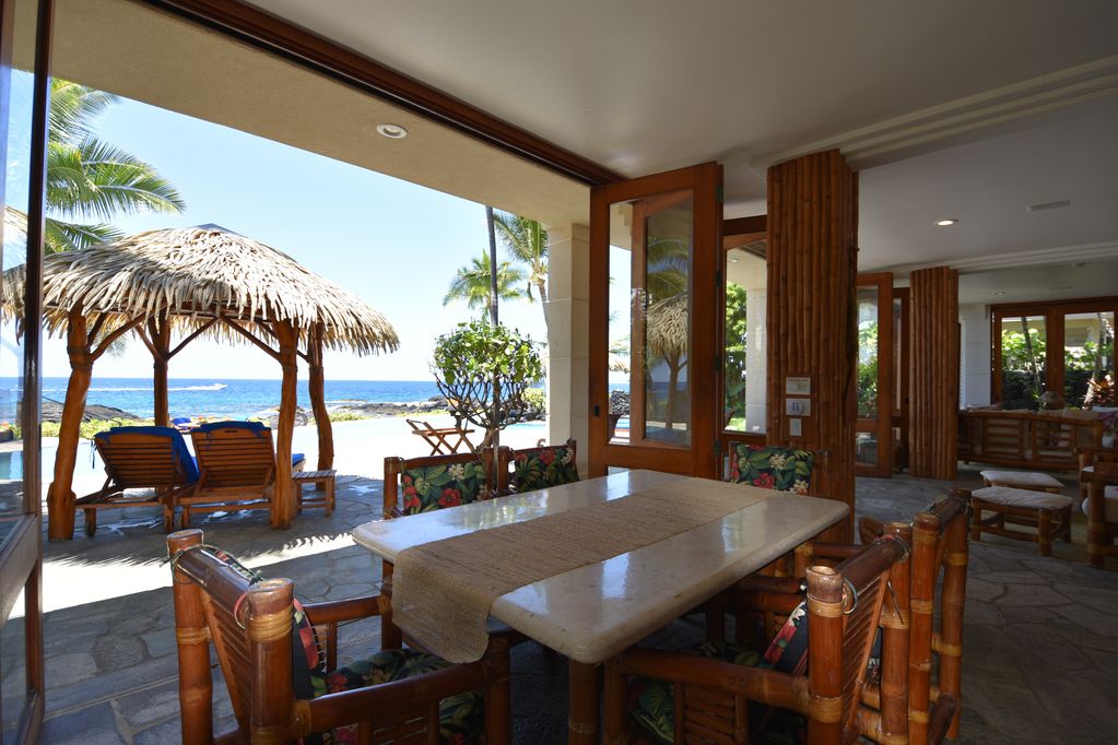 Welcome to Sapphire, a stunning Hawaiian paradise home. Located just a few blocks from the waterfront village of Kona, Sapphire is privately situated oceanfront in a gated community of luxury homes. With constant year-round temperatures in the 80s, and a cool ocean breeze, this custom Hawaiian home is as tropical as you can get. Overlooking the crashing waves on the lava and sandy beach coast, the home features a designer infinity pool with two waterfalls, a sandy bottom wading pool, huge lanais, and two courtyard ponds with their own waterfalls in a lush garden setting. Exquisite details are throughout the Kailua Kona, Hawaii rental with imported teak, bamboo, marble, granite, and quartzite features.