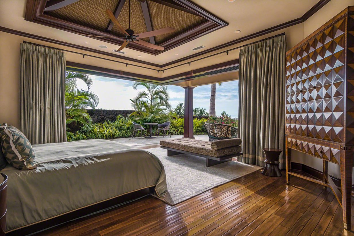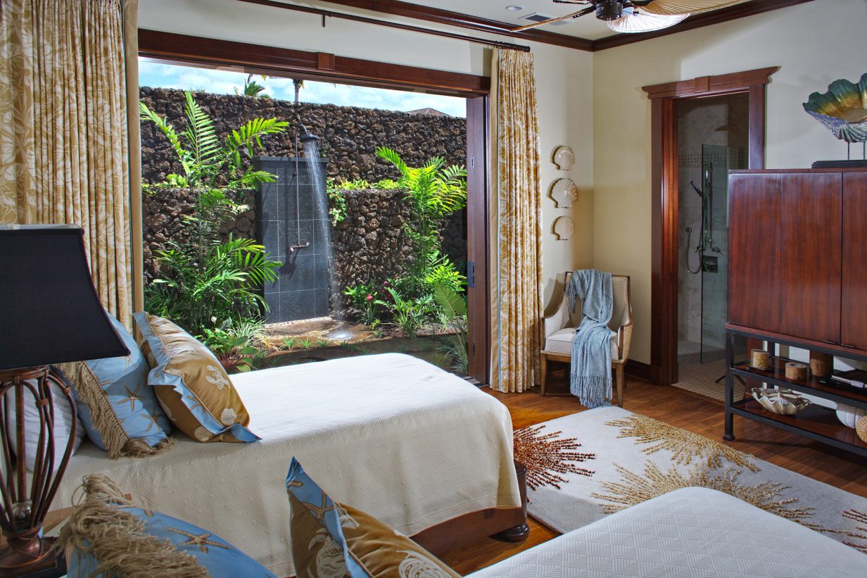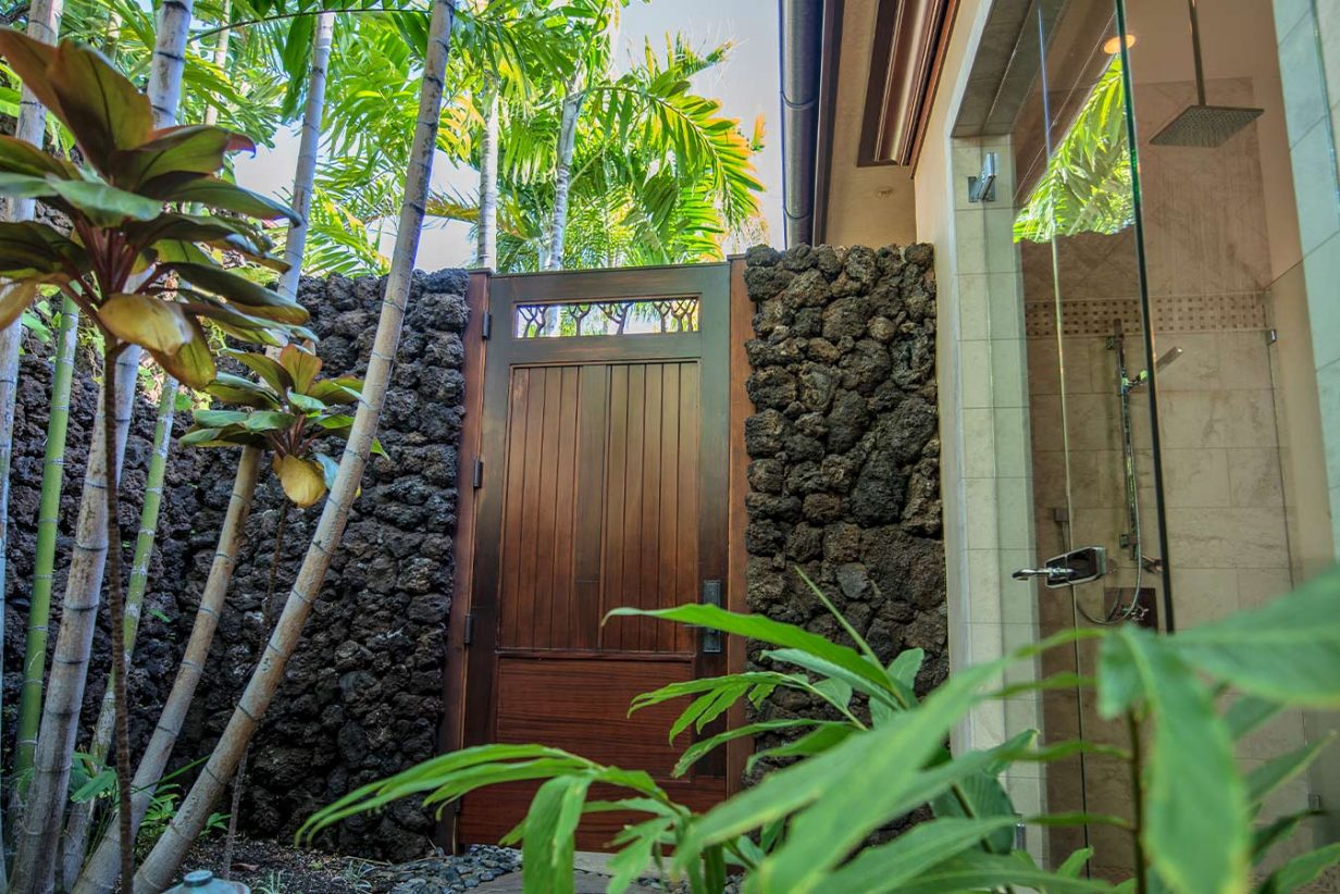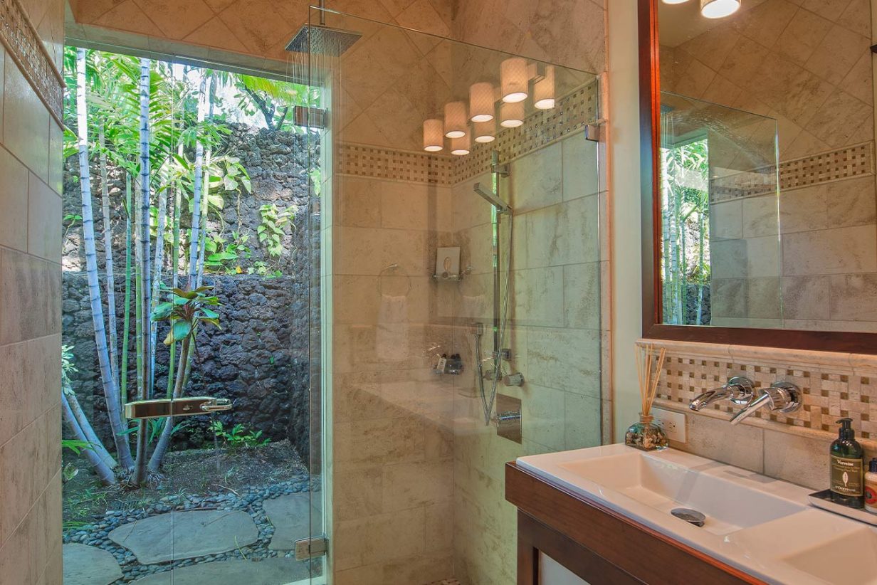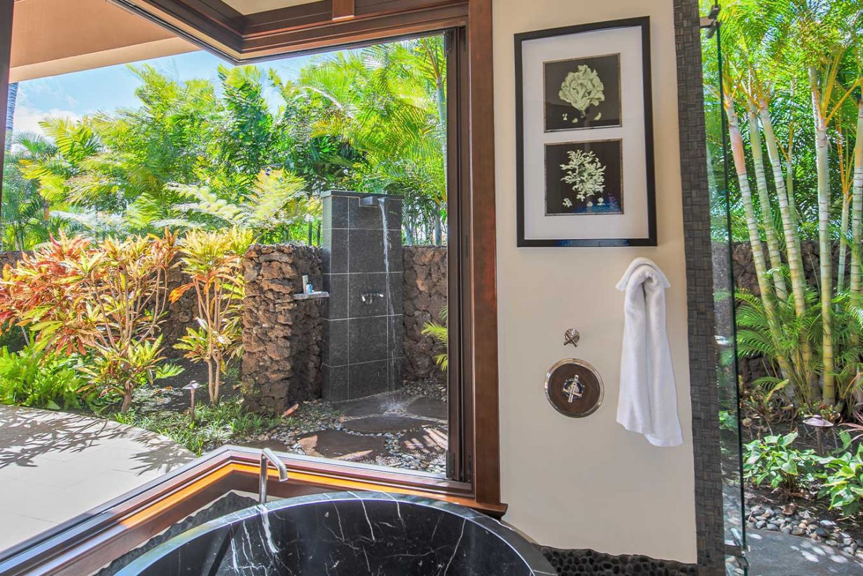 Like the Great Room, the walls of the Master Suite disappear to bring the outdoors into this private retreat. The Master Bath shower is a design marvel in itself as it wraps its user in a steamy cocoon, and the Jacuzzi tub has its own private view of the tropical garden and outdoor shower. Custom drapes and bedding were designed specifically for this home for an extra special touch. Three additional private suites are available in this luxury beach residence each with its own garden outdoor shower lanai, specially designed bathroom, plasma television, and unique custom décor. Two of the Hualalai home rental suites feature King beds and the third offers two Fulls. The fifth guest bedroom is its own vacation home in itself separate from the main home. The four-poster king-sized bed and vintage Asian décor make this suite uniquely charming. It has its own private kitchenette and breakfast nook. With both indoor and outdoor showers, double sinks, and a standing glass shower, this suite rivals the Master Suite in privacy and amenities.