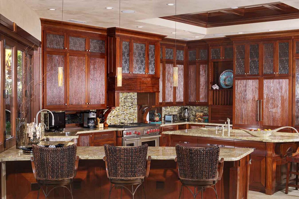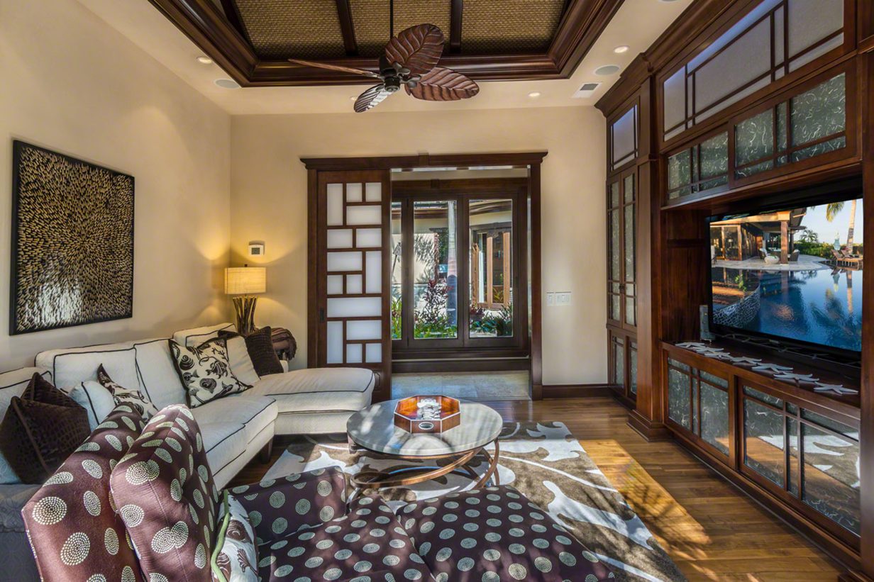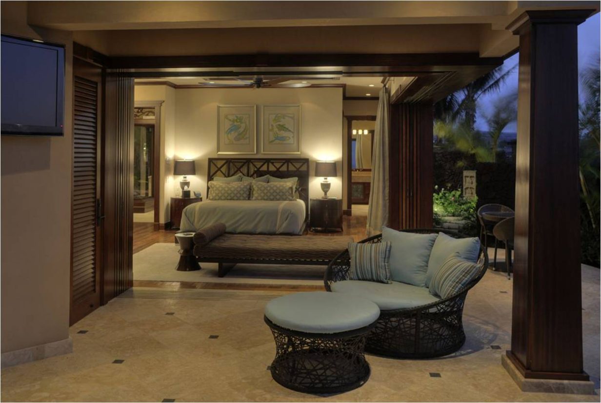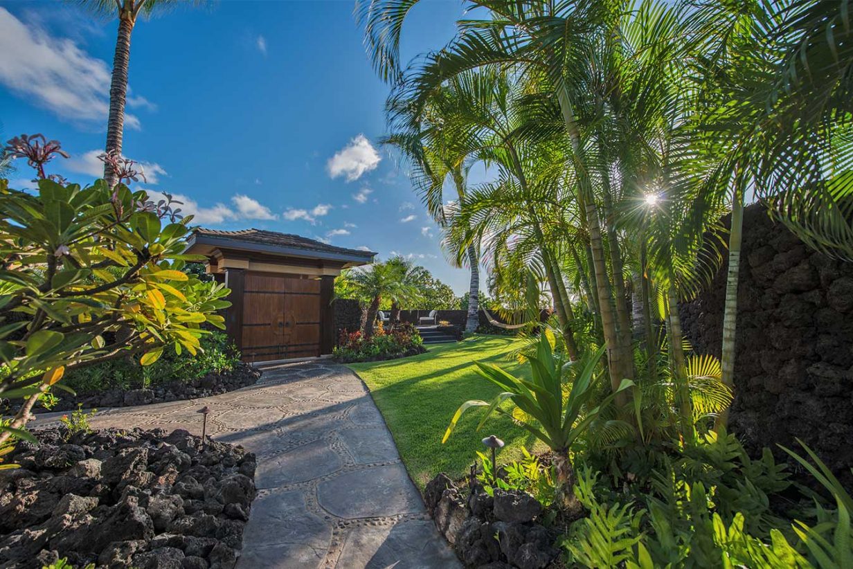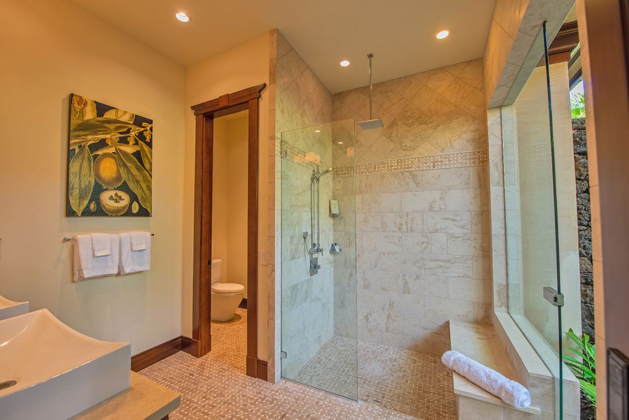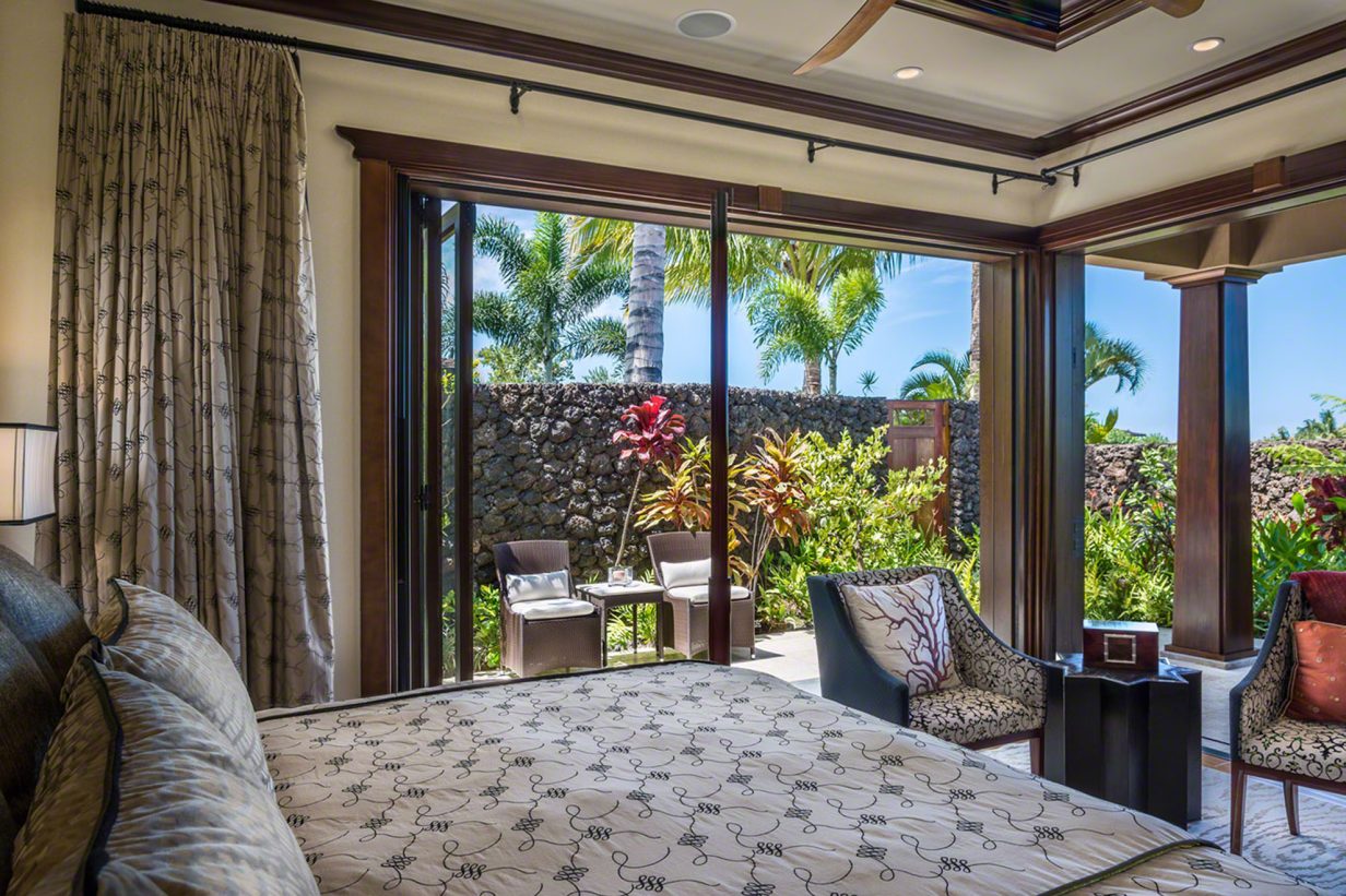 Like the Great Room, the walls of the Master Suite disappear to bring the outdoors into this private retreat. The Master Bath shower is a design marvel in itself as it wraps its user in a steamy cocoon, and the Jacuzzi tub has its own private view of the tropical garden and outdoor shower. Custom drapes and bedding were designed specifically for this home for an extra special touch. Three additional private suites are available in this luxury beach residence each with its own garden outdoor shower lanai, specially designed bathroom, plasma television, and unique custom décor. Two of the Hualalai home rental suites feature King beds and the third offers two Fulls. The fifth guest bedroom is its own vacation home in itself separate from the main home. The four-poster king-sized bed and vintage Asian décor make this suite uniquely charming. It has its own private kitchenette and breakfast nook. With both indoor and outdoor showers, double sinks, and a standing glass shower, this suite rivals the Master Suite in privacy and amenities.