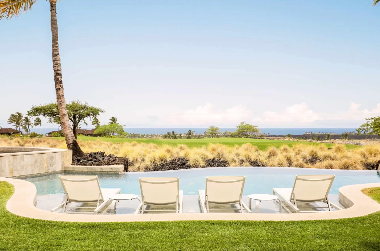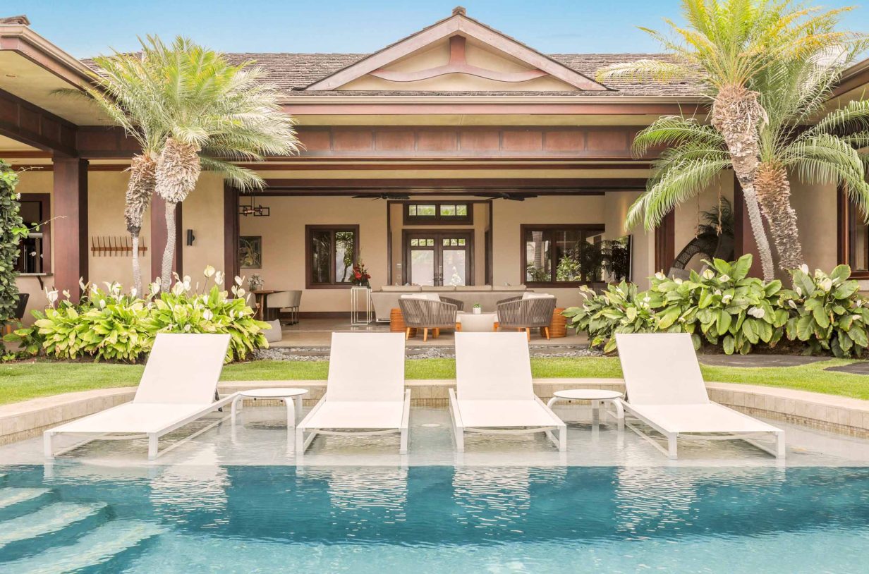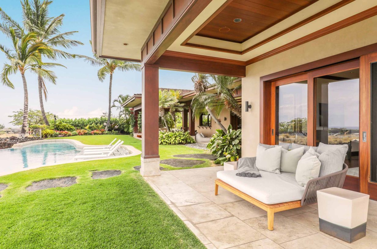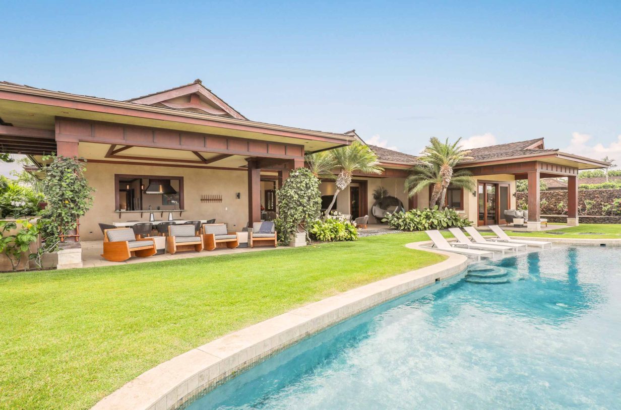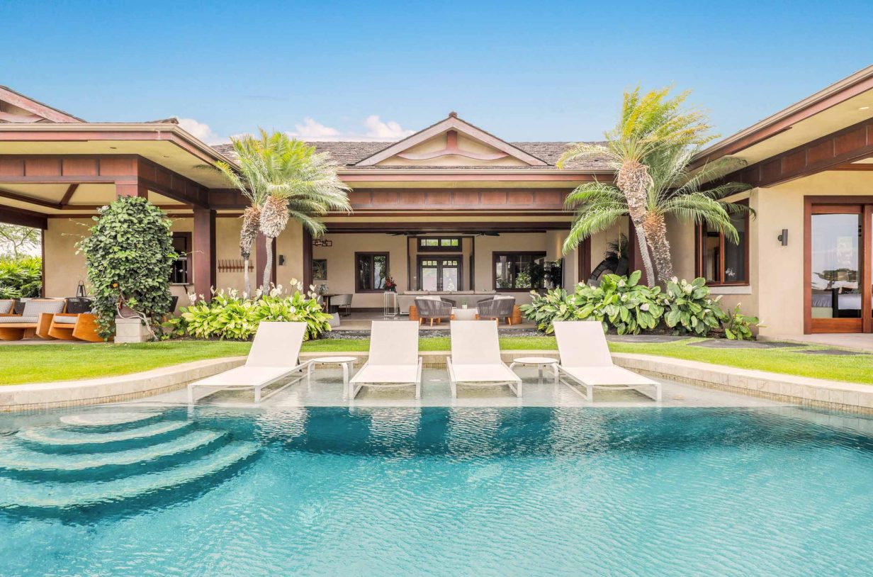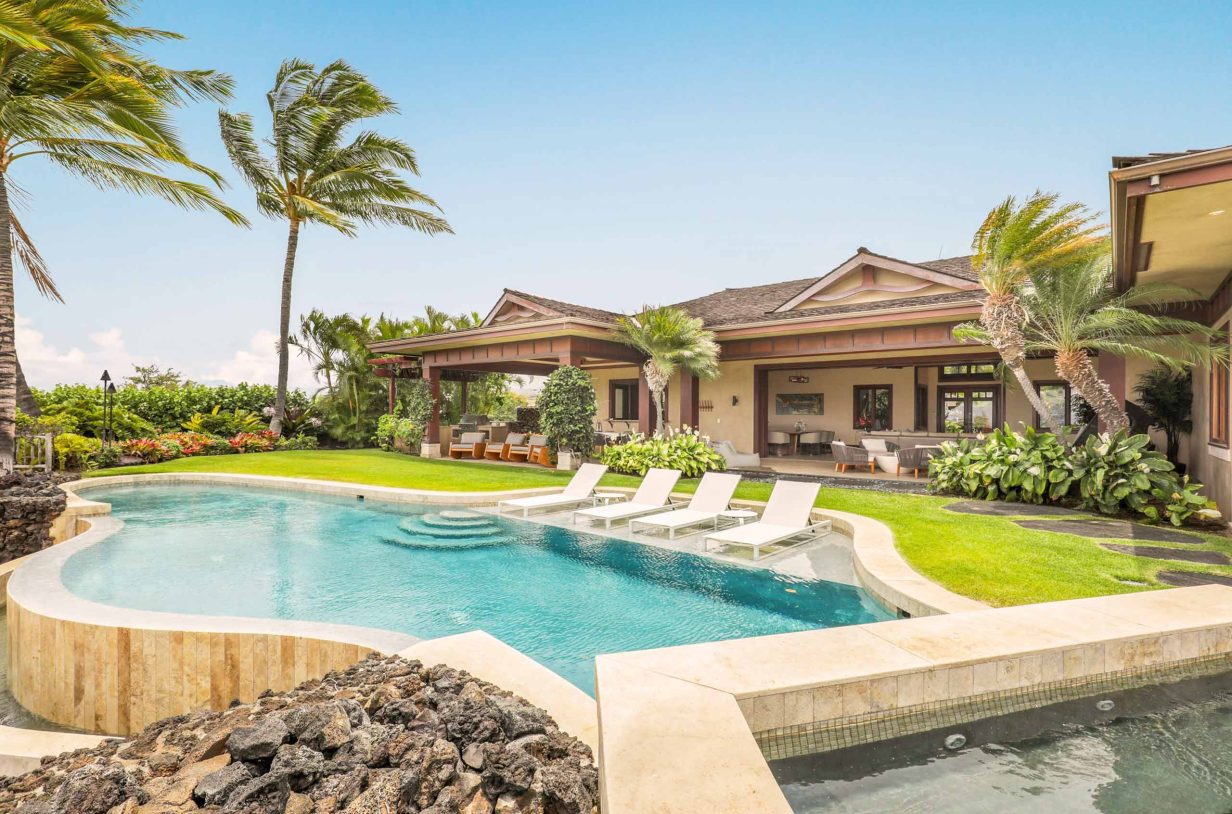 The Hawaiian estate offers a stunning ocean view, visible immediately through the double glass entry doors, and enjoyed from the great room, kitchen, lanai, pool deck, and master suite. The location is unparallel with the Hualalai Sports Club & Spa, Hotel Pools and Services, Championship Golf Course, Tennis Club, Hale Nalu (Ocean Activity Center), Ka‘upulehu Cultural Center, Kids For All Seasons, Hotel Restaurants, and Hotel Beaches.