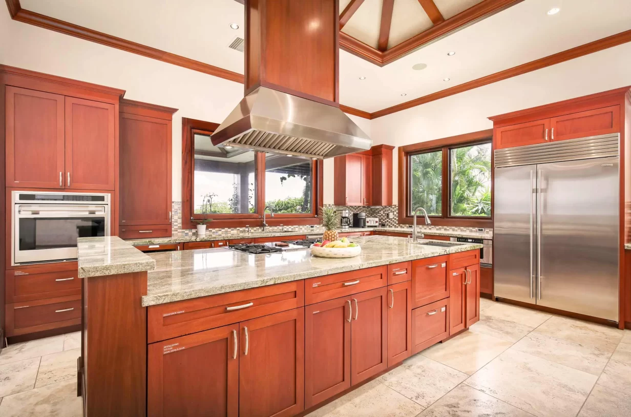 Kitchen: Fully-equipped chef’s kitchen, granite countertops, bar seating with ocean views, oversized cooking island with prep sink, Sub-Zero refrigerator, and freezer, separate Sub-Zero wine cooler with beverage drawers, Sub-Zero under counter wine cooler, two Fisher Paykel “dishdrawer” washing systems, another full-sized Bosch dishwasher, sliding pocket serving window leads from the kitchen to the outdoor BBQ and dining.