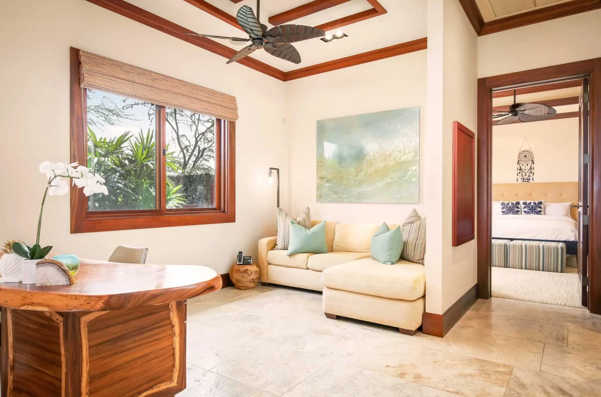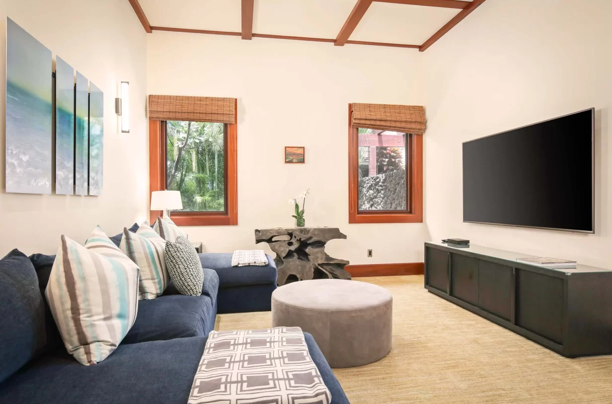 This exquisite and designer four-bedroom, four-and-a-half-bath resort estate is situated on a premiere private corner location overlooking the 13th green of the exclusive Ke‘olu golf course. The expansive and sprawling island oasis includes over 4,200 square feet of interior living space and 1,500 square feet of exterior covered lanai with plush sofa seating. This luxury oasis that sleeps eight promises an ideal and memorable Big Island escape, perfect for family, multi-generational groups, and friends.