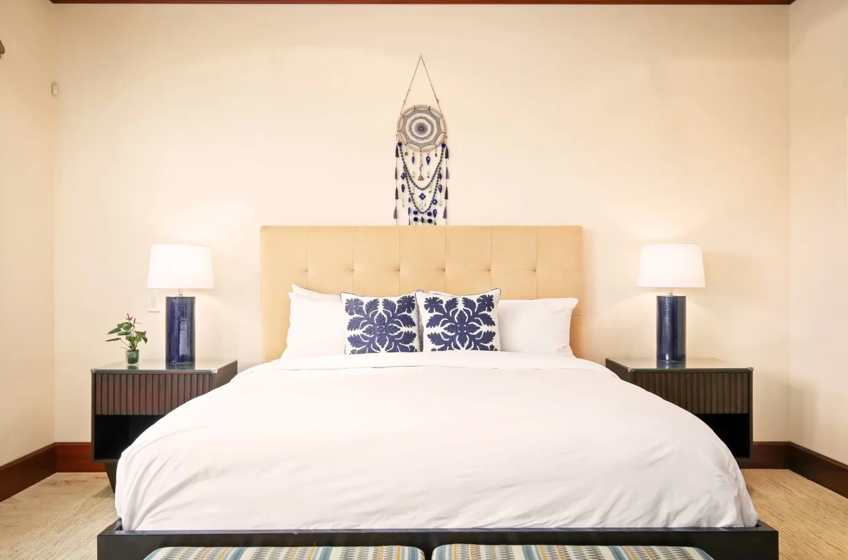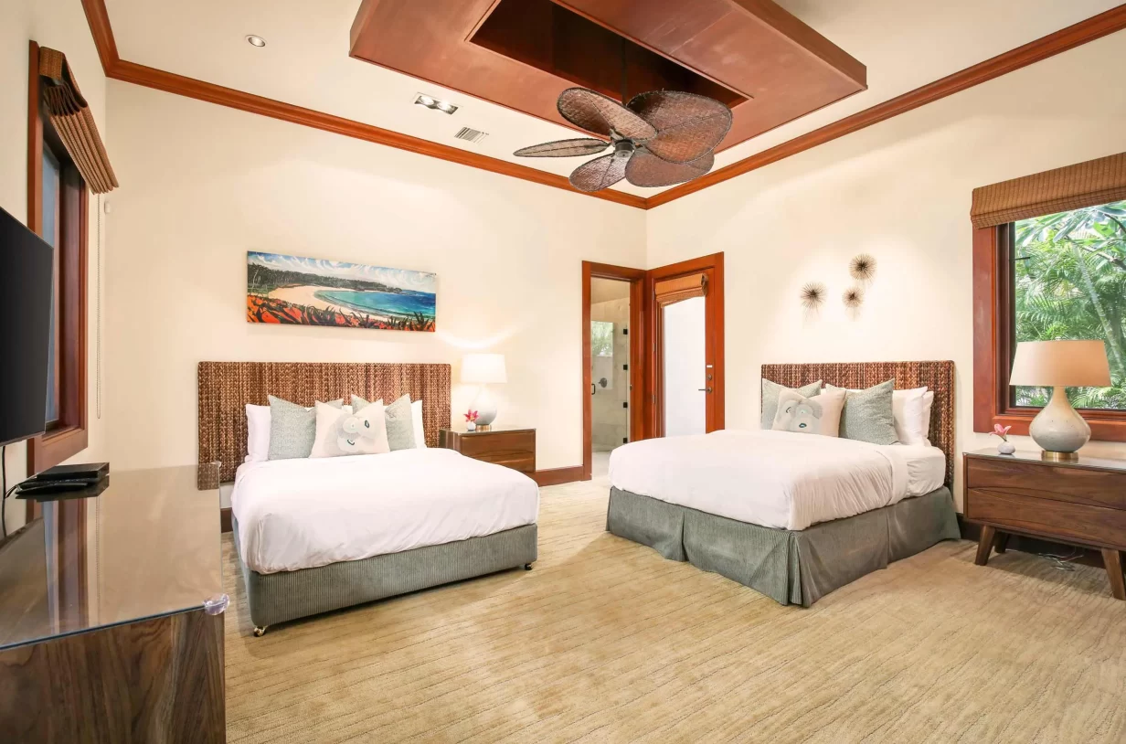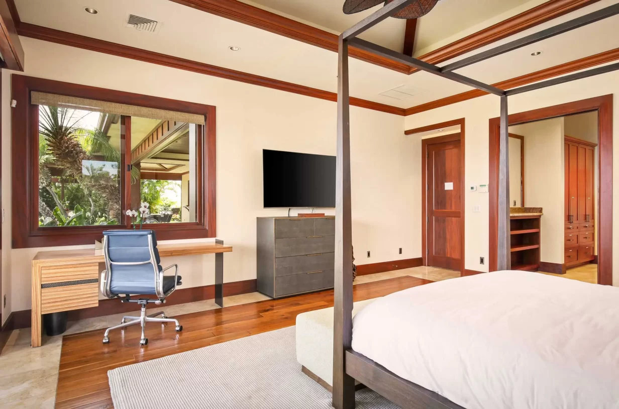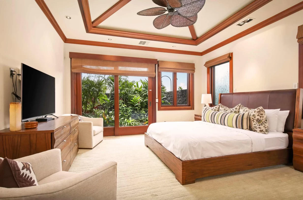 1- Master Suite: California King bed, 65″ flatscreen TV, mahogany open beam vaulted ceilings, American Walnut floors, private lanai, large walk-in closet. The master bathroom suite includes a double vanity and the bathroom is directly connected to the outdoors via a lush tropical outdoor shower garden with planted orchids, an Ohia wood bench and shower details, and a large cast stone outdoor bathtub.