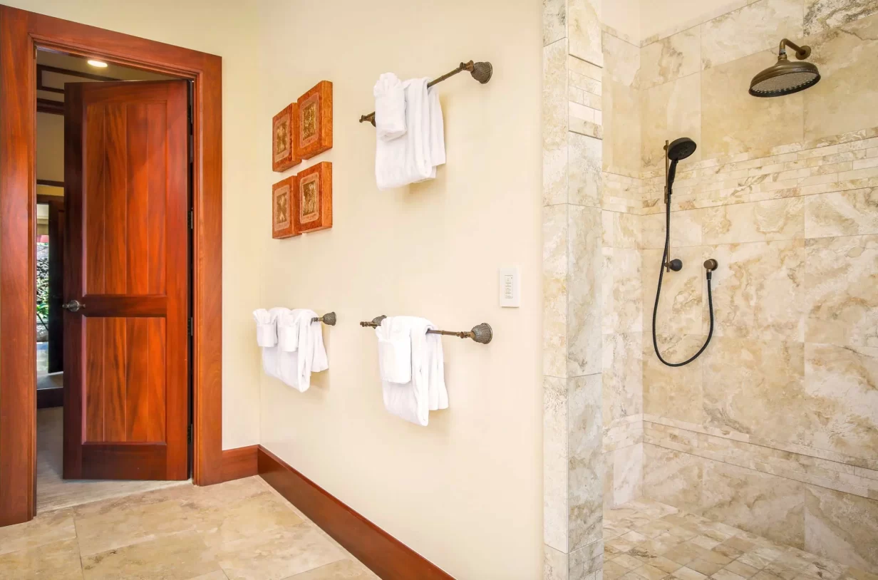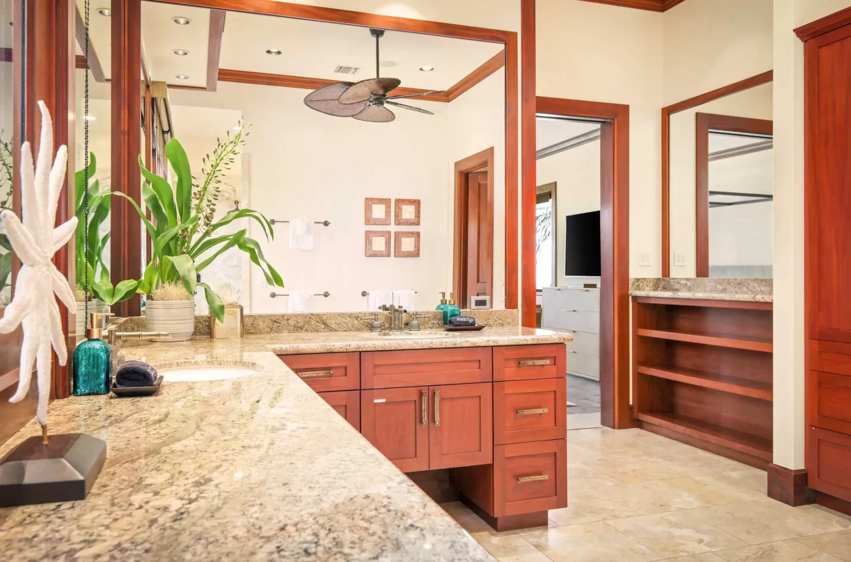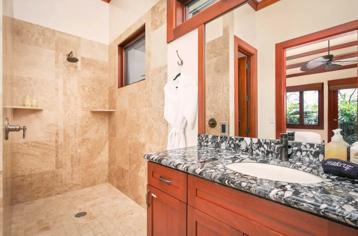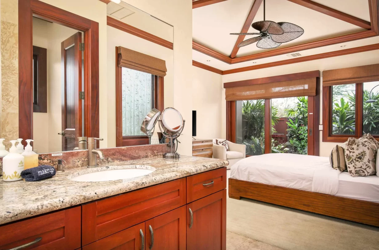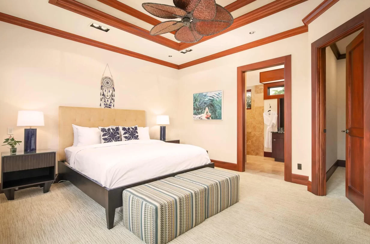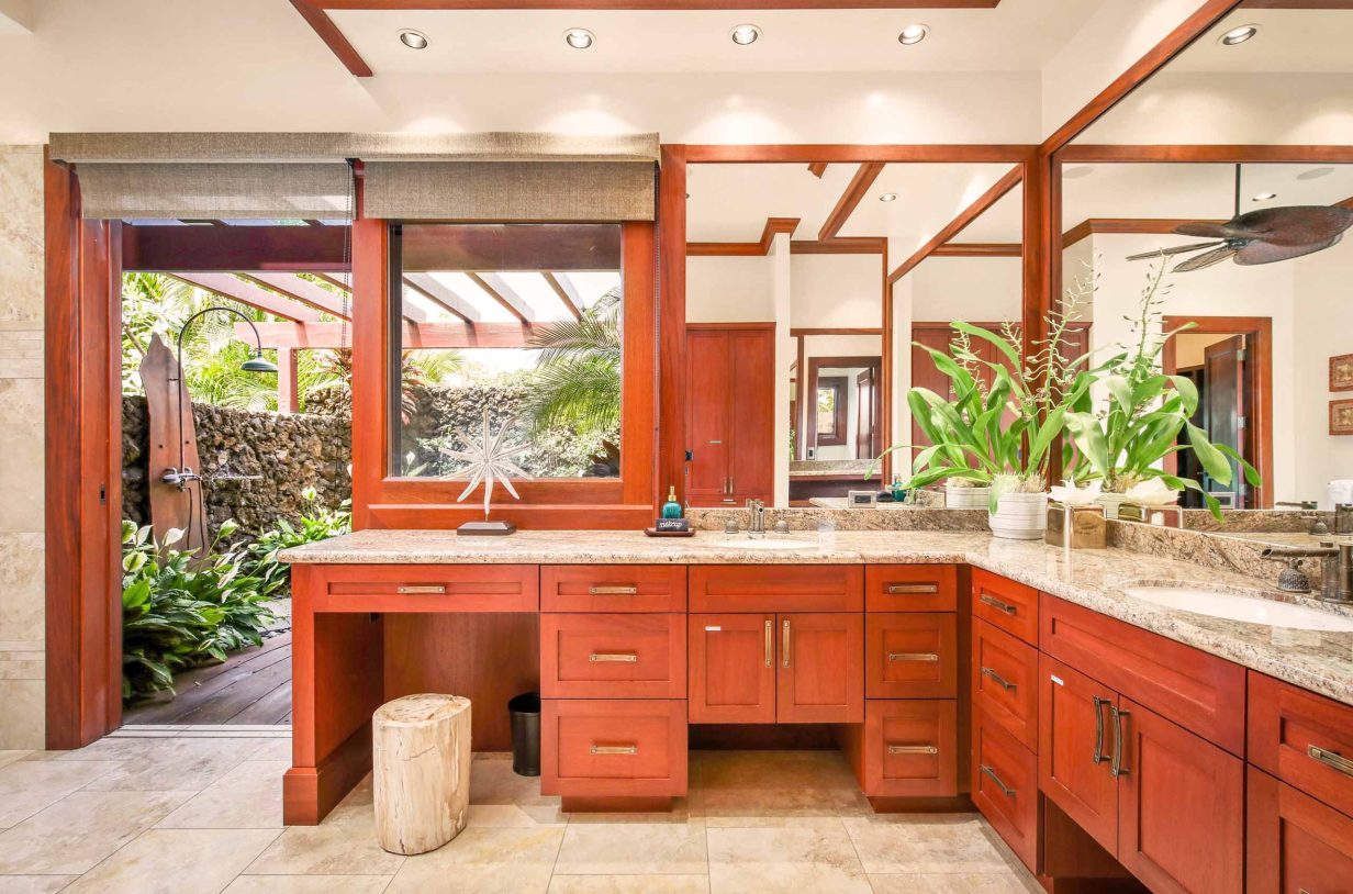 - Master Suite: California King bed, 65″ flatscreen TV, mahogany open beam vaulted ceilings, American Walnut floors, private lanai, large walk-in closet. The master bathroom suite includes a double vanity and the bathroom is directly connected to the outdoors via a lush tropical outdoor shower garden with planted orchids, Ohia wood bench and shower details, and a large cast stone outdoor bathtub.