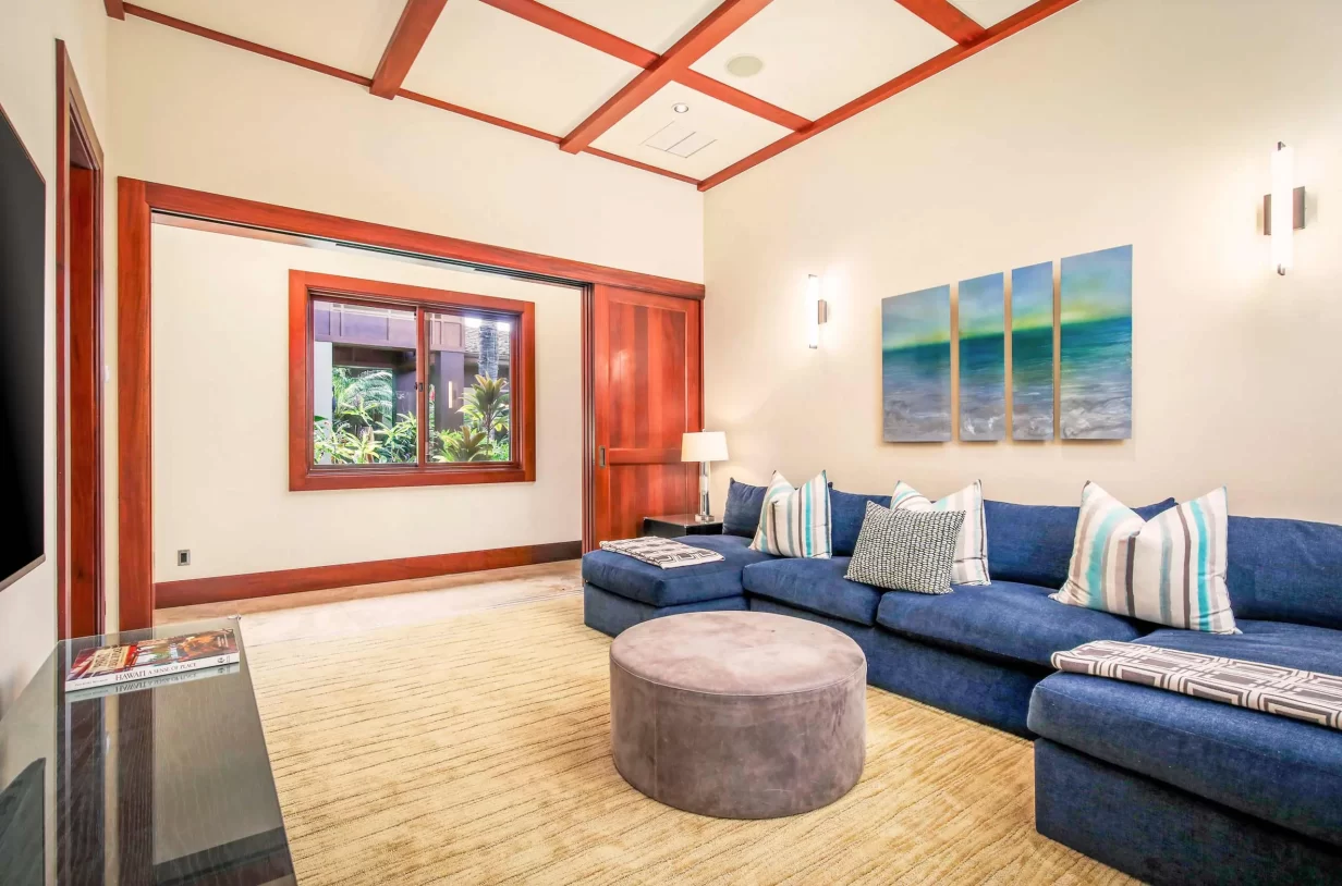Media Room: Stacking privacy doors, large sofa, and 75″ TV with built-in, high-fidelity speakers.