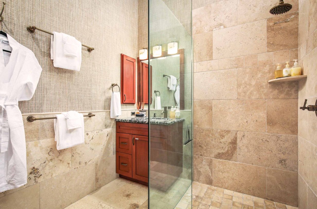 - Guest Suite 3: Two Queen beds, mounted flatscreen TV, en suite bathroom and additional outdoor shower garden. The final bedroom has its own separate courtyard entry, kitchenette with a sink, microwave oven, and refrigerator.