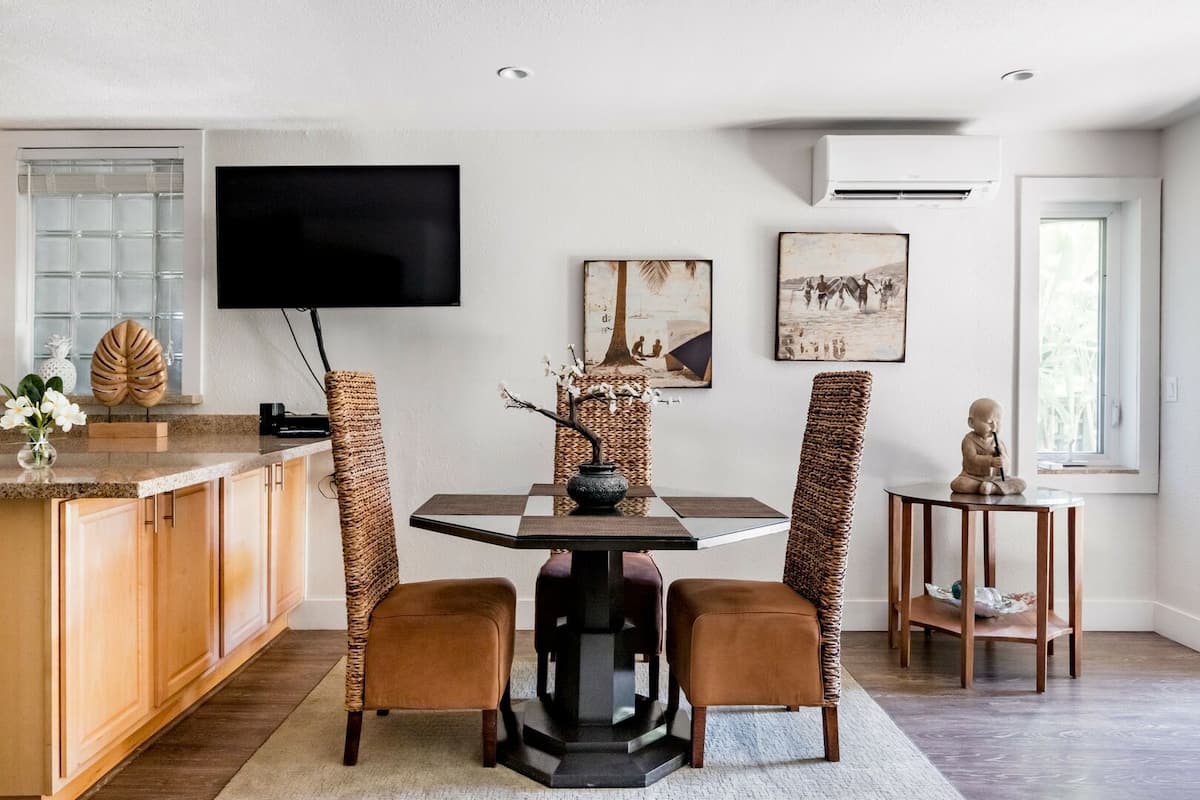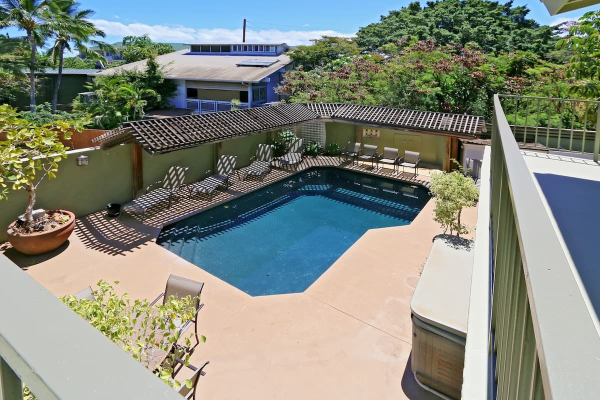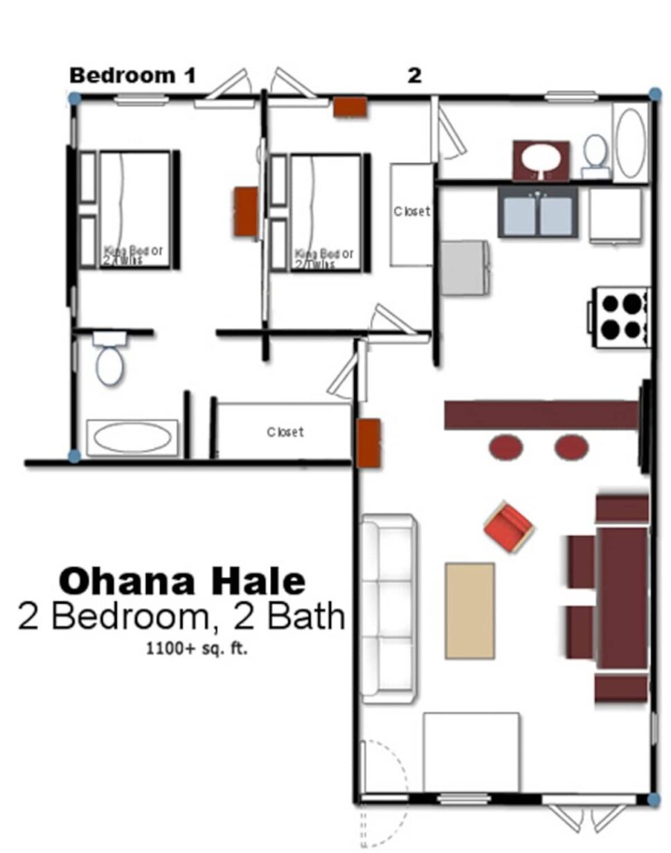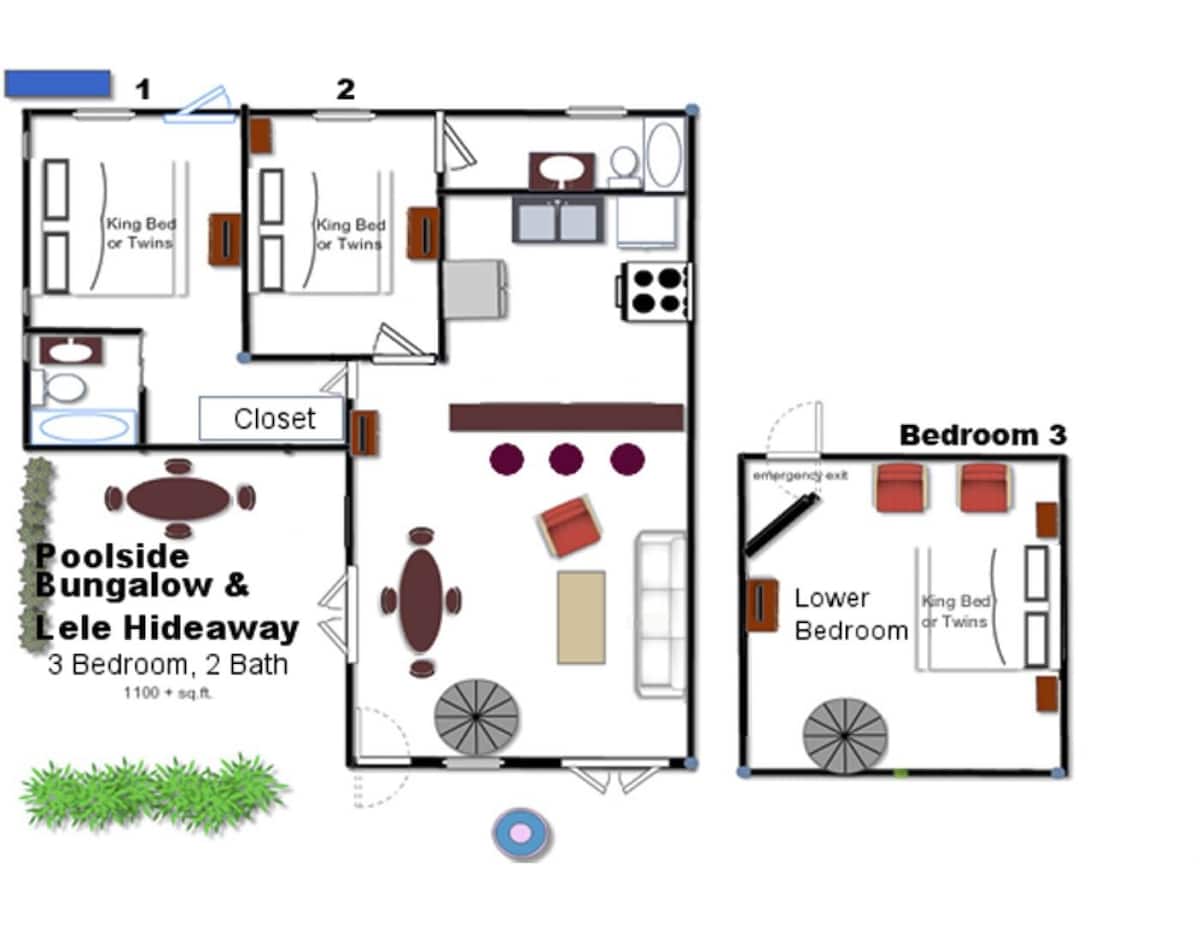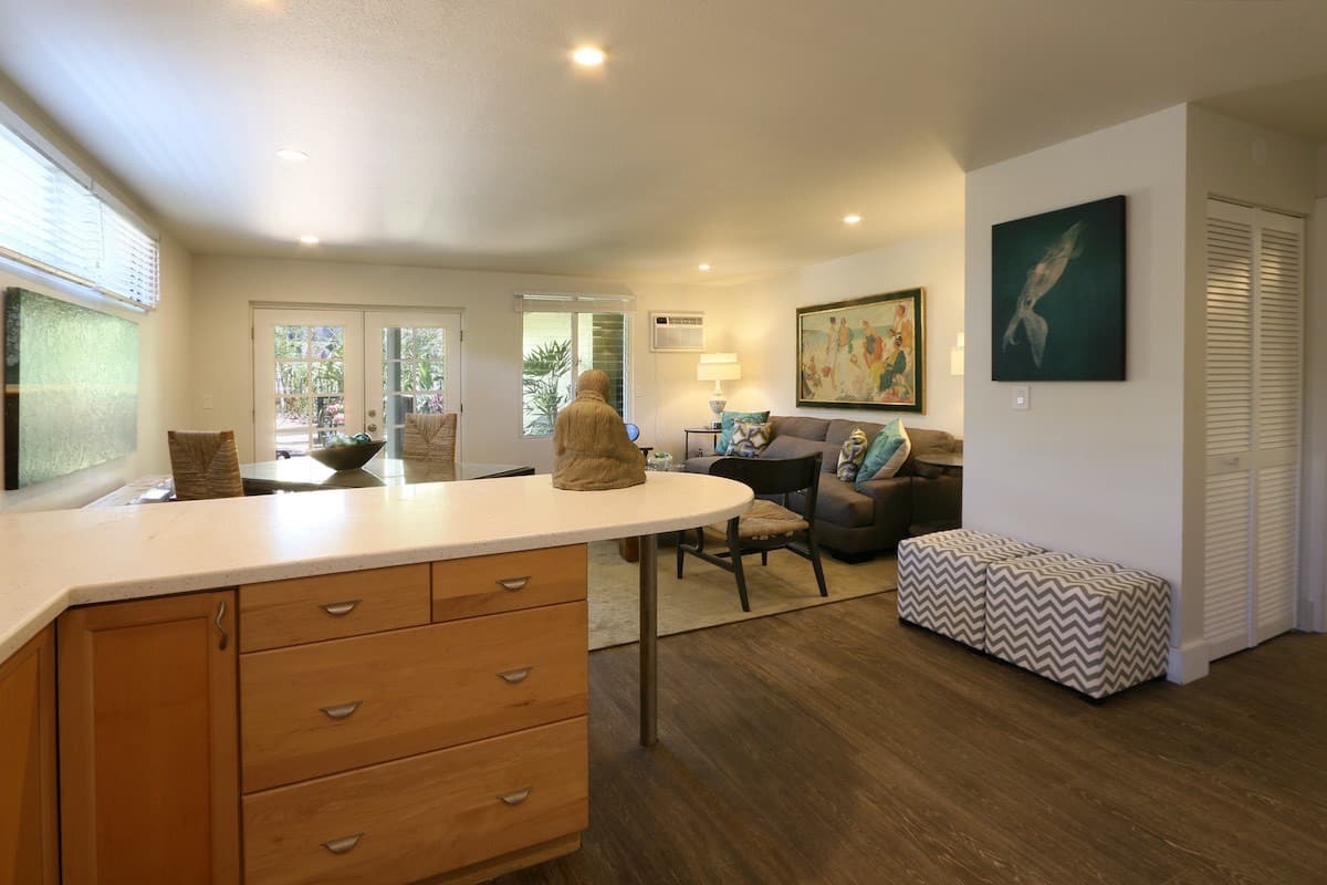 The Hale Hideaway is a two-bedroom, two-bath with family-room condominium suite with direct access to the heated pool and Jacuzzi area. Each bedroom, and the living room, has its own air conditioning unit for complete temperature control. Guests may choose from a King bed or two twin beds. The bedrooms have full ensuite bathrooms and are located on the ground floor. There is also a Queen size Murphy bed in the living area which comfortably sleeps another two guests. The rooms also include beach towels and each bathroom has bath towels, hand towels, and face towels. One initial set of travel-size shampoo, conditioner, soap, and lotion is provided in each bathroom. A fully equipped kitchen includes stainless steel appliances, glassware, cutlery, dishes, pots and pans, baking trays, a drip coffee maker, a toaster, an instant hot water boiler, a rice cooker, a blender, olive oil, salt, pepper, and aluminum foil.