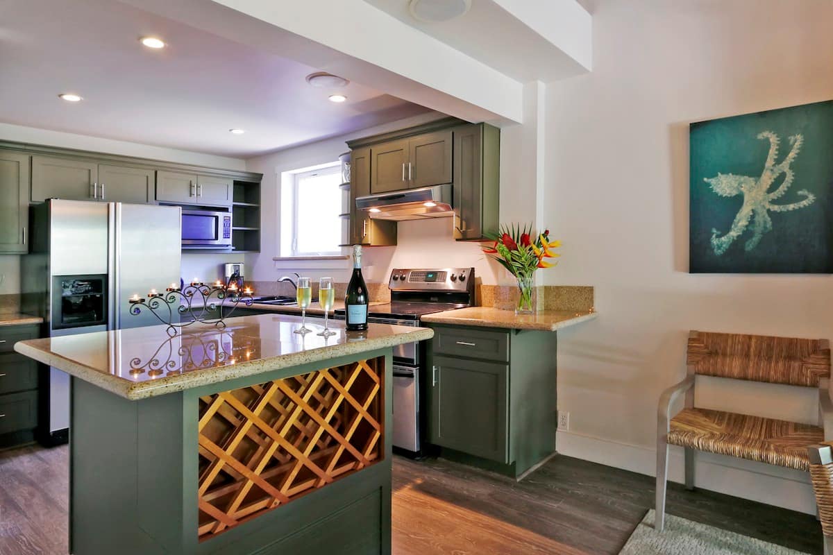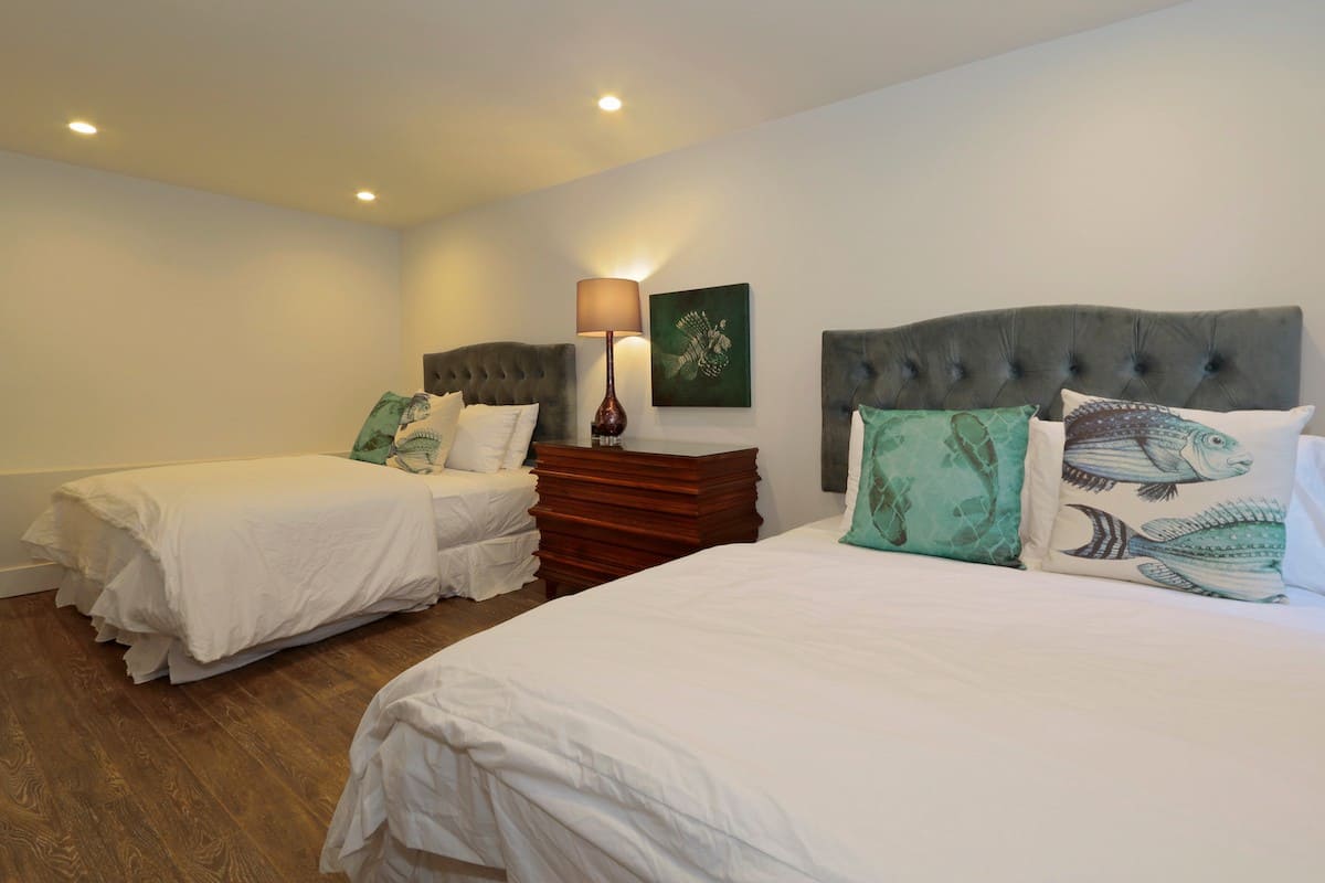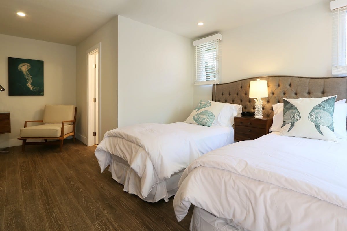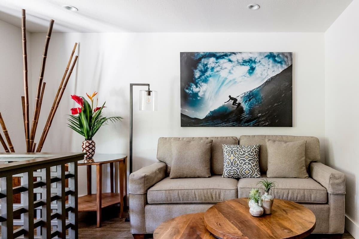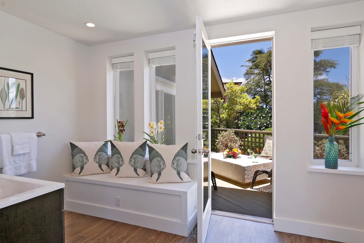 The Hale Hideaway is a two-bedroom, two-bath with family-room condominium suite with direct access to the heated pool and Jacuzzi area. Each bedroom, and the living room, has its own air conditioning unit for complete temperature control. Guests may choose from a King bed or two twin beds. The bedrooms have full ensuite bathrooms and are located on the ground floor. There is also a Queen size Murphy bed in the living area which comfortably sleeps another two guests. The rooms also include beach towels and each bathroom has bath towels, hand towels, and face towels. One initial set of travel-size shampoo, conditioner, soap, and lotion is provided in each bathroom. A fully equipped kitchen includes stainless steel appliances, glassware, cutlery, dishes, pots and pans, baking trays, a drip coffee maker, a toaster, an instant hot water boiler, a rice cooker, a blender, olive oil, salt, pepper, and aluminum foil.