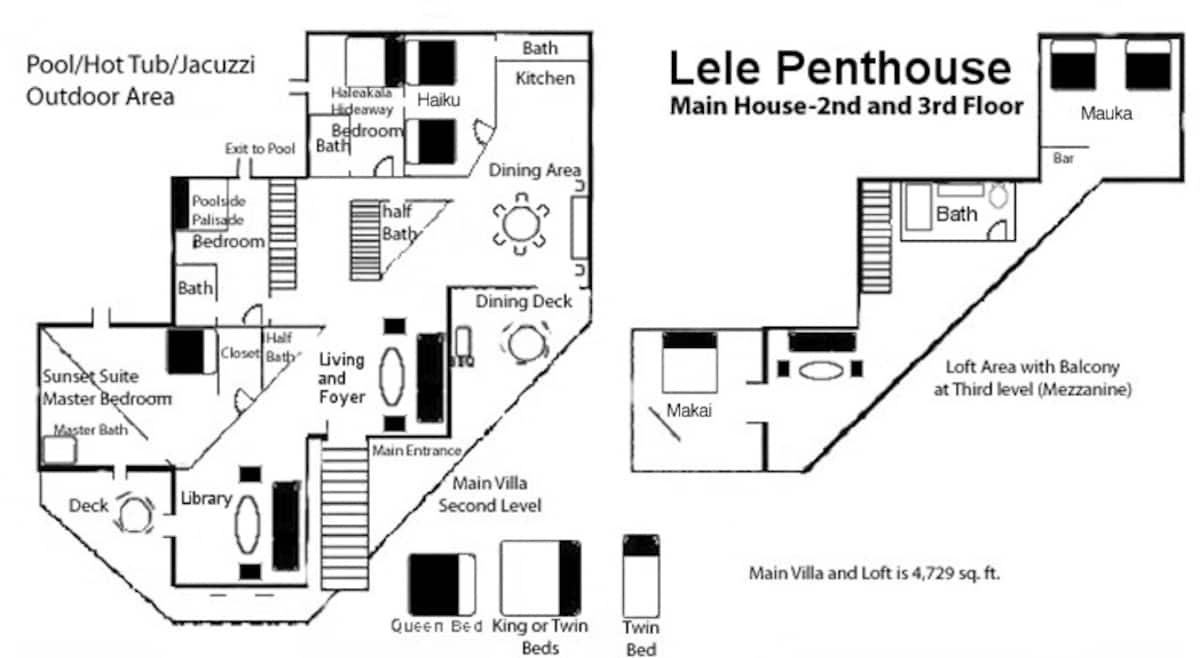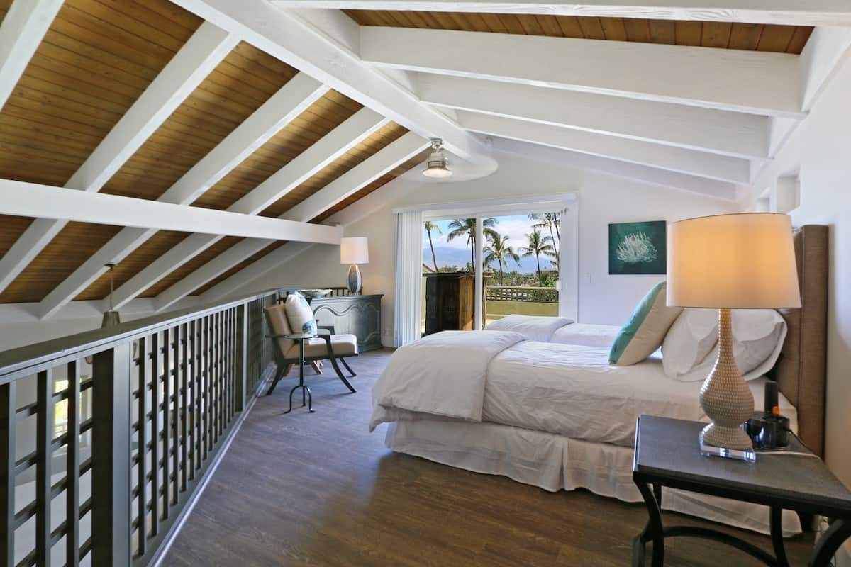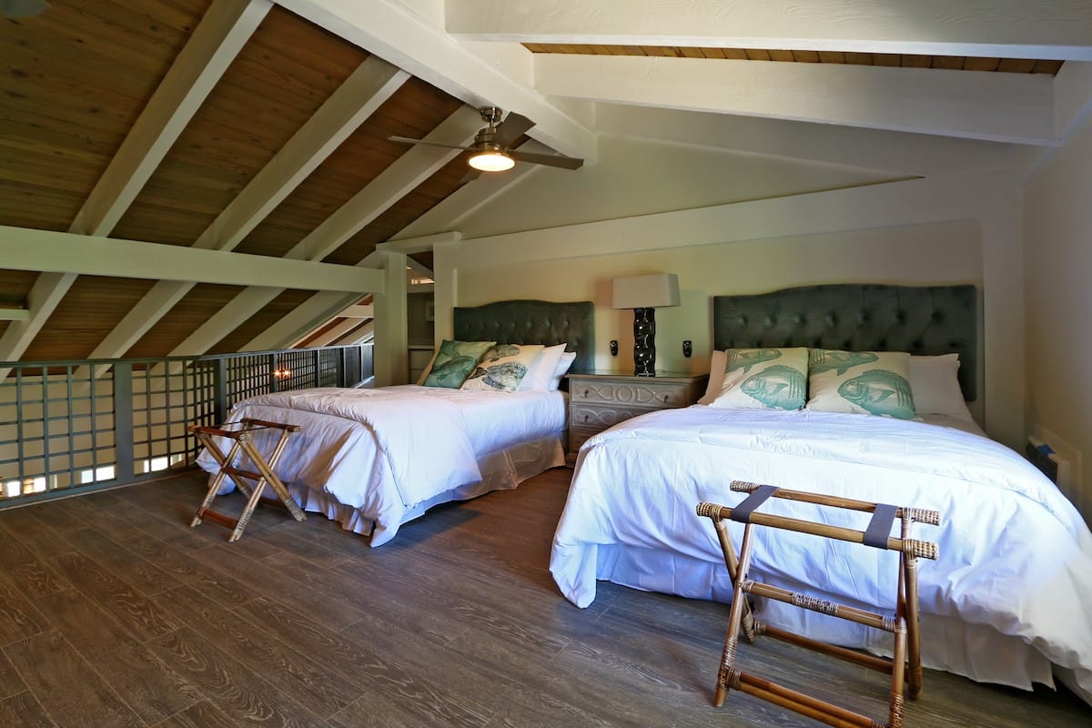 The Penthouse is a spacious four-bedroom two level condominium suite with an open floor plan featuring high vaulted ceilings and large windows throughout allowing an abundance of natural light in. Two additional loft areas equipped with two queen beds in one space and a King/2 twin option in the other provide comfortable accommodations as well. Each bedroom has two beach towels and each bathroom has two bath towels, two hand towels, and two face towels. One initial set of travel-size shampoo, conditioner, soap and lotion are provided in each bathroom. Large travel groups can gather in the living room, family room, and grand dining room. Dine outside on the lanai with a gas grill or enjoy sunset cocktails from the third-level ocean-view lanai.