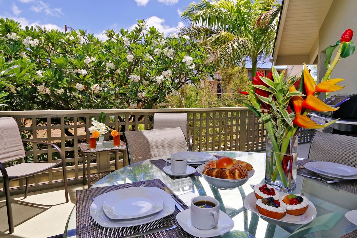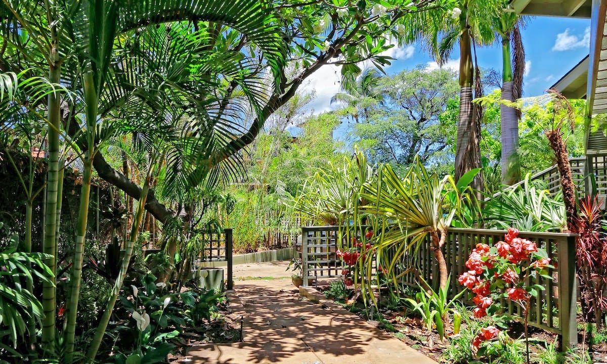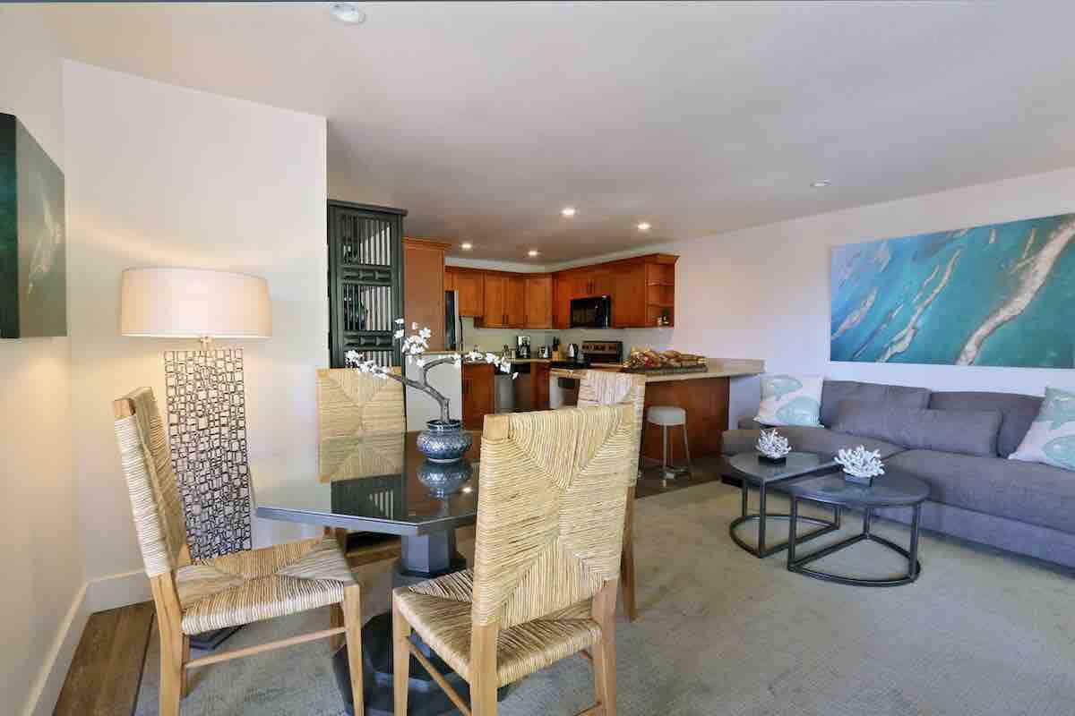 The Ohana Hale is a charming two-bedroom, two-bath ground-floor condominium suite. Each bedroom has one full bathroom and its own private entrance to the pool. Each bedroom has your choice of a King bed or 2 Twin beds. A Queen size sofa sleeper with a memory foam mattress provides comfortable sleeping space for two additional guests. One twin-size rollaway bed is available for an additional $75 per night plus tax to achieve the maximum occupancy of 6 guests. The rooms also include beach towels and each bathroom has bath towels, hand towels, and face towels. One initial set of travel-size shampoo, conditioner, soap, and lotion is provided in each bathroom. The dining room seats six and shares an open floor plan with the large living room. Guests can relax on the private garden lanai surrounded by tropical landscaping. A fully equipped kitchen with includes stainless steel appliances, glassware, cutlery, dishes, pots and pans, baking trays, a drip coffee maker, a toaster, an instant hot water boiler, a rice cooker, a blender, olive oil, salt, pepper, and aluminum foil. Filtered water is available in the refrigerator. Enjoy the conveniences of laundry in the suite with a stackable washer and dryer. Ohana Hale guests have access to the Wailea Inn communal yoga studio, heated pool, Jacuzzi, BBQ area with gas grill, beach chairs, and boogie boards.