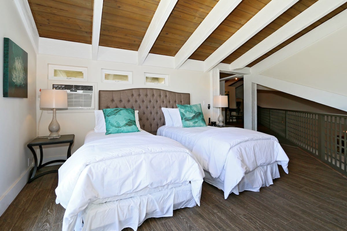 The Poolside Bungalow is a two-bedroom, two-bath family-room condominium suite with direct access to the heated pool and Jacuzzi area. Each bedroom, and the living room, has its own air conditioning unit for complete temperature control. Guests may choose from a King bed or two twin beds. The bedrooms have full ensuite bathrooms and are located on the ground floor.